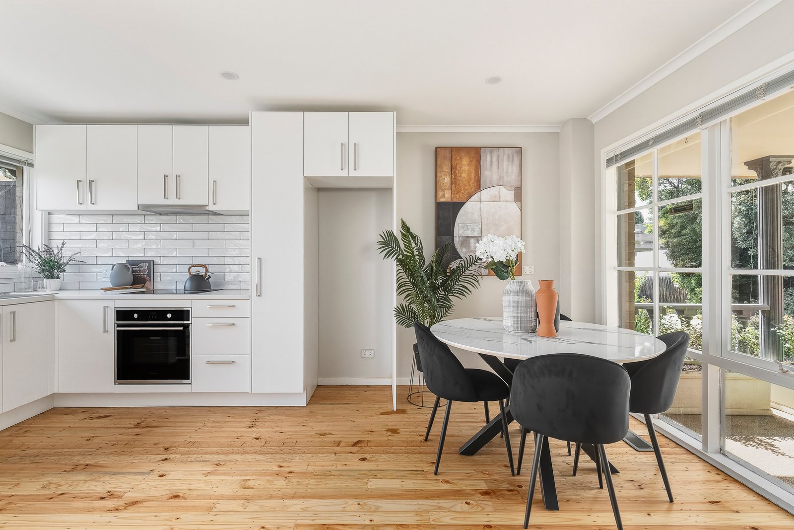 Stepping inside, the light-filled lounge makes an immediate impression with its striking timber flooring and tall wide windows, flowing seamlessly into the adjoining dining and kitchen zone. The beautifully fully renovated kitchen is a modern delight, showcasing matte white joinery with sleek metallic rails, classic subway-tiled splashback, stainless steel sink, and quality Domain appliances including an electric stovetop and oven.