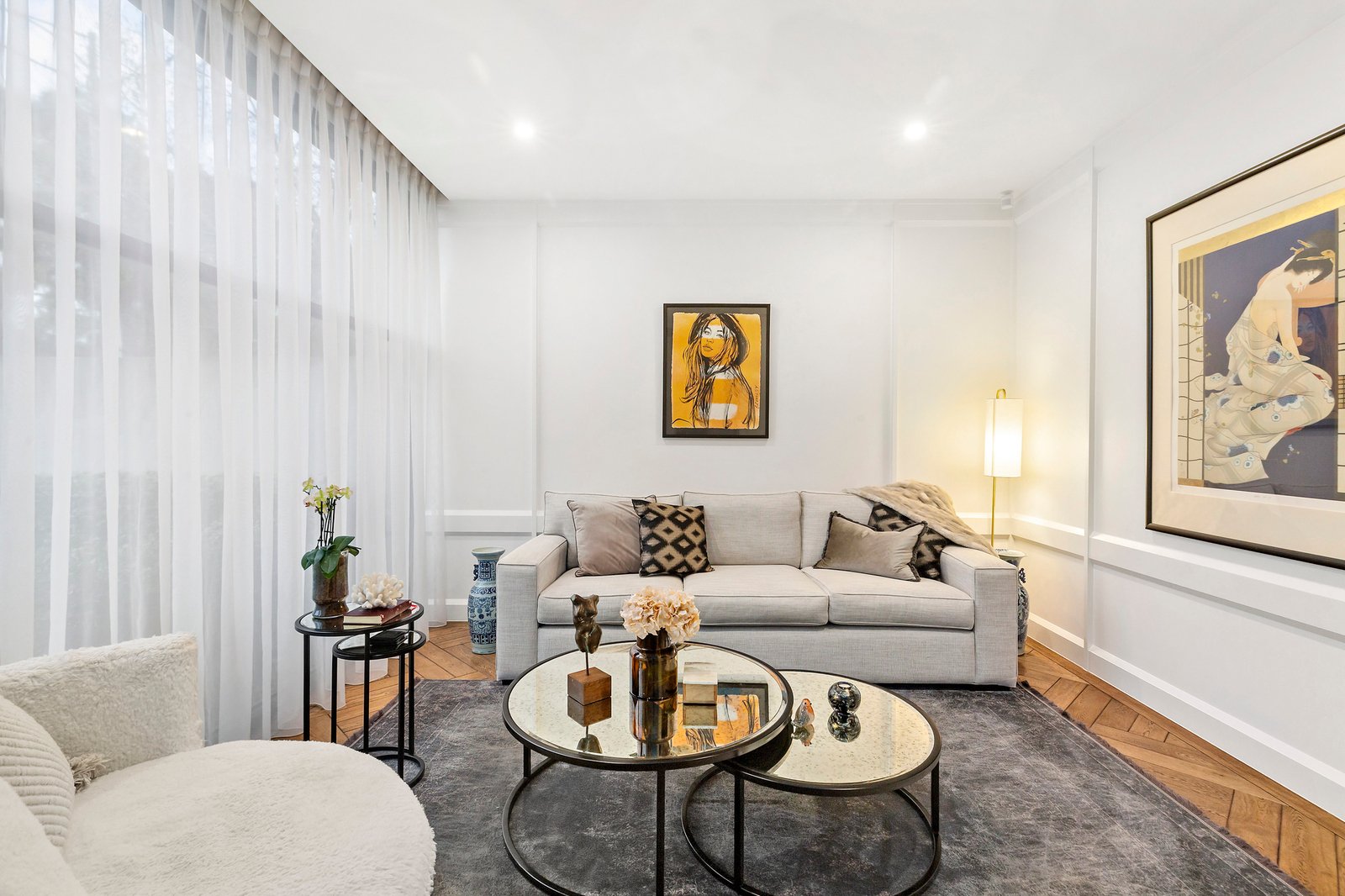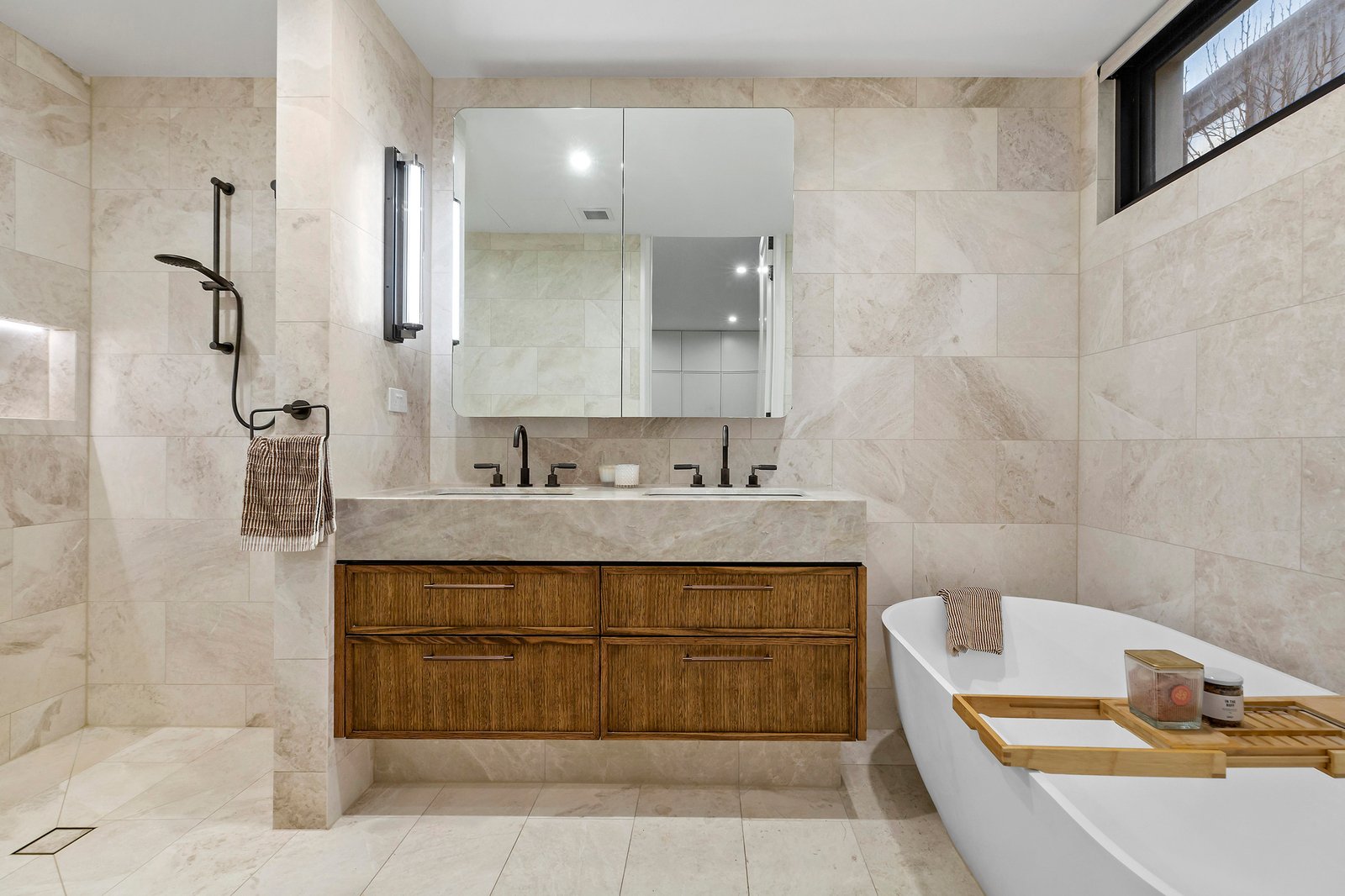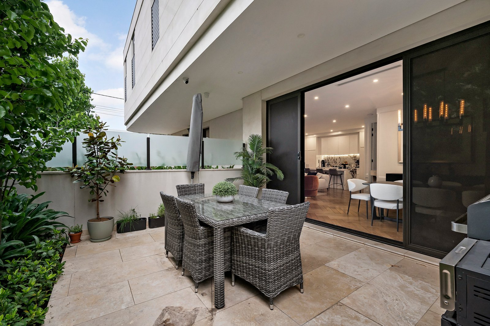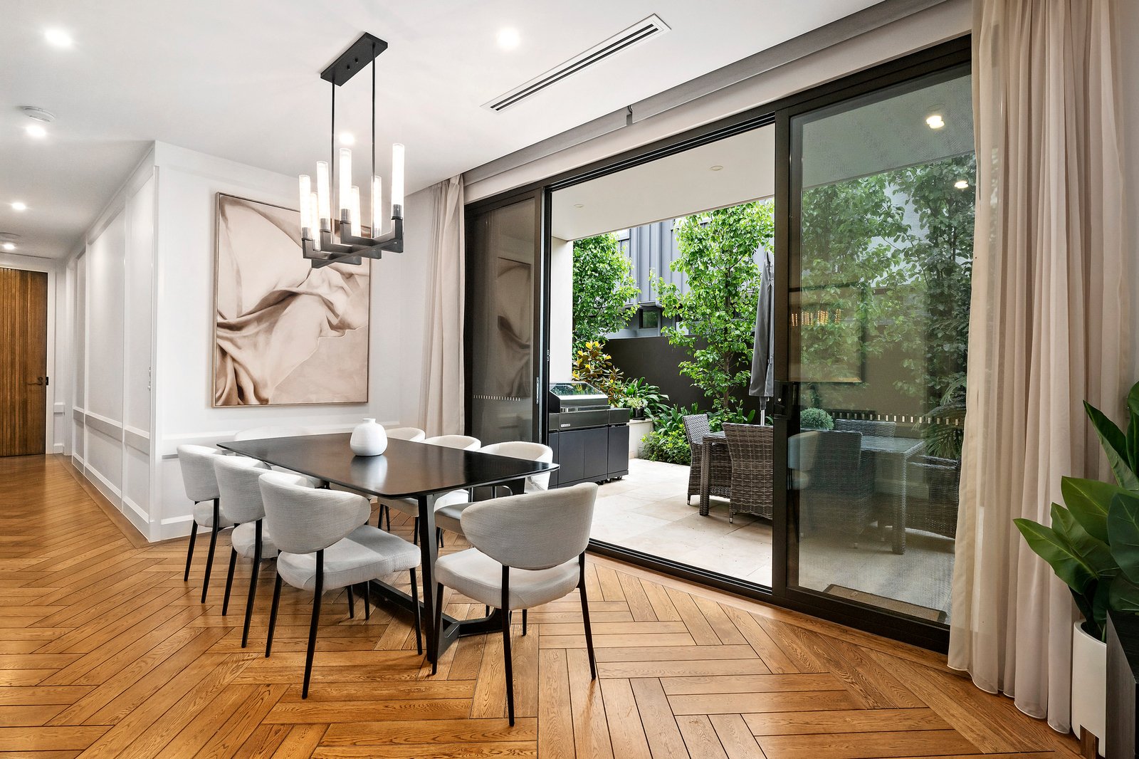 Luxurious engineered oak herringbone floors and stunning lofty ceilings introduce sublime open plan spaces filled with natural light masterfully curated surrounded by serene garden terraces. A second living zone adds additional versatility for a formal sitting room or study, making the most of a wonderfully tranquil setting. A magnificent domain for entertaining, the Patagonia Stone Island kitchen with a suite of Miele appliances, seamlessly combine the dining and living area complemented with gas fireplace, Samsung Art frame TV, wine storage and exquisite alfresco courtyard with built in BBQ, the ideal backdrop for hosting any event. Three generous marble ensuite bedrooms all feature custom built in robes and open to private terraces, the lavish main retreat with deluxe twin vanity and freestanding stone bath.
