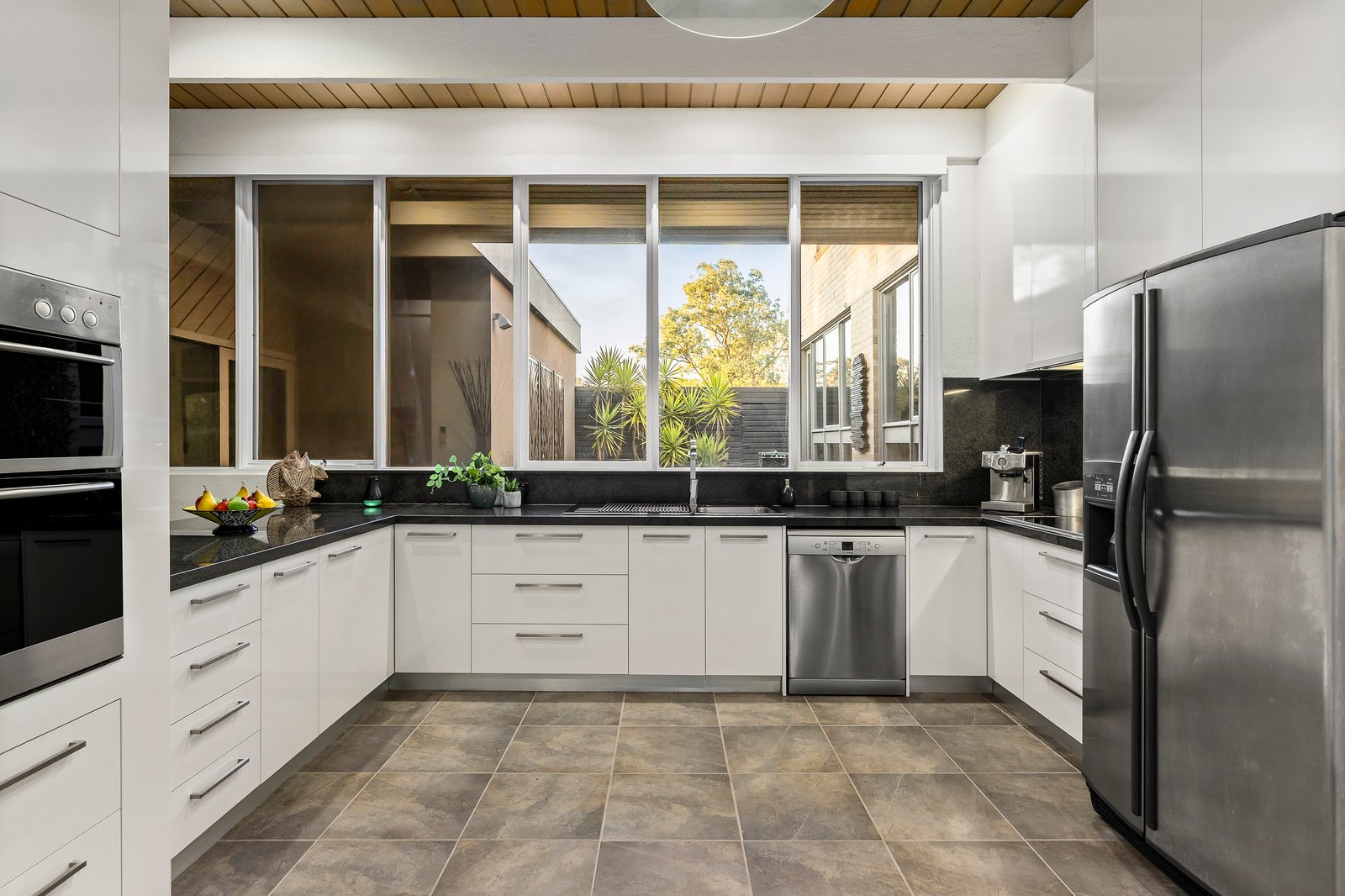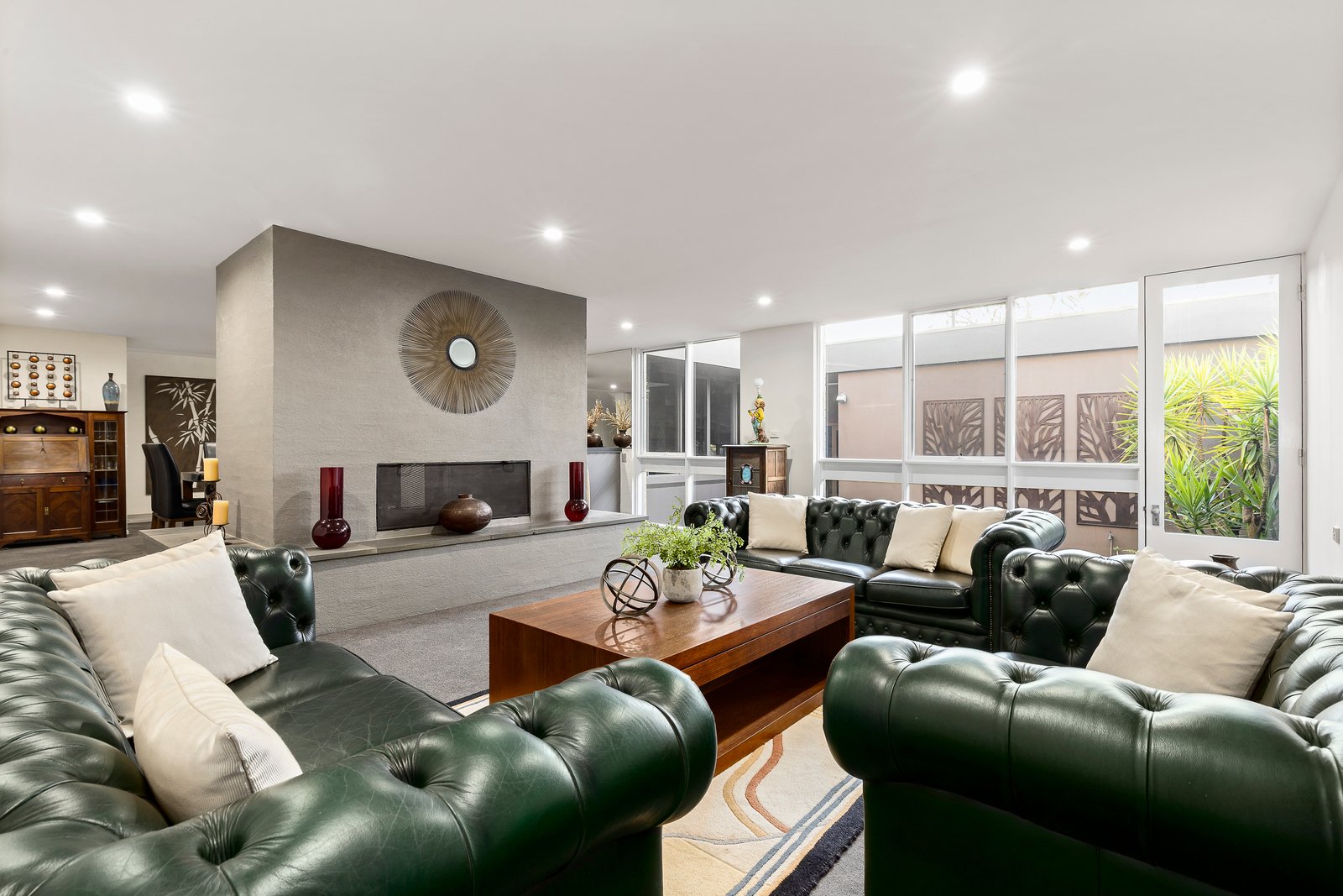 Crafted to follow the contours of the land, the split-level floorplan flows with intention revealing timber-lined ceilings, textured double-brick interiors, and unexpected architectural moments at every turn. A dedicated parents' retreat crowns the home, complete with an open wood fire, leafy views, and adjoining bedroom with walk-in robe, ensuite, and built-in robes. Below, expansive living and dining zones open to a central courtyard and tranquil water feature, while a custom bar and feature fireplace centerpiece make it ideal for entertaining.