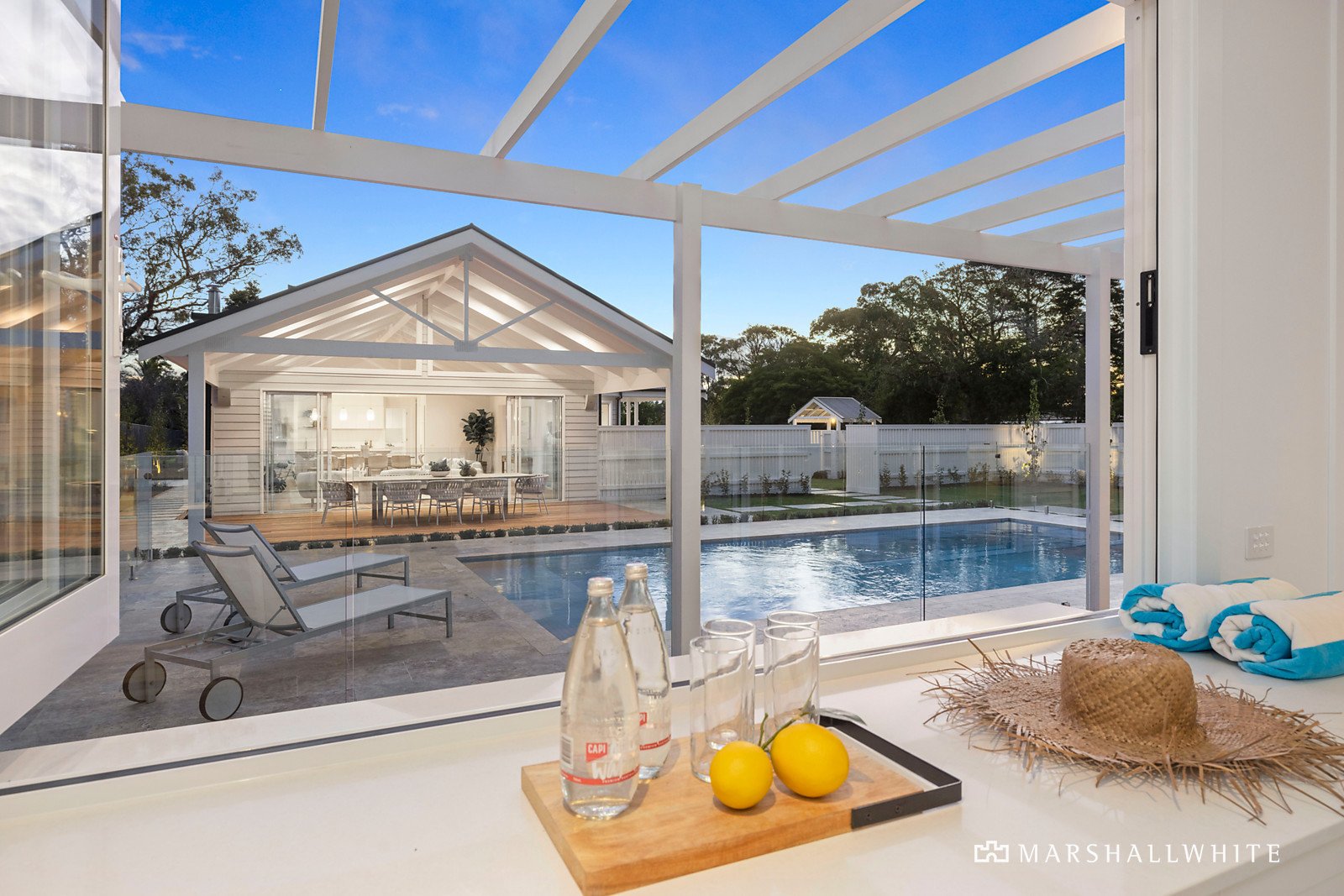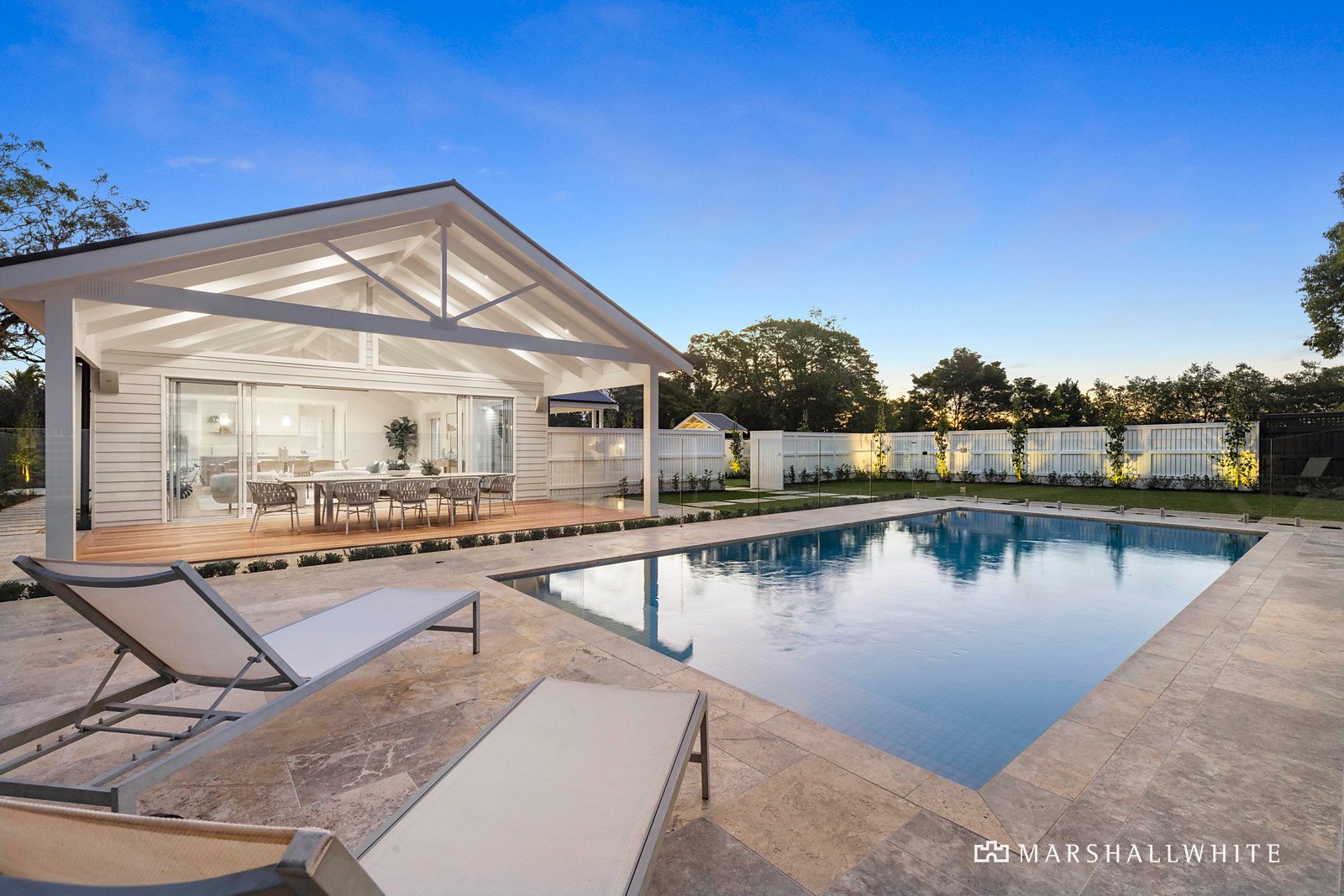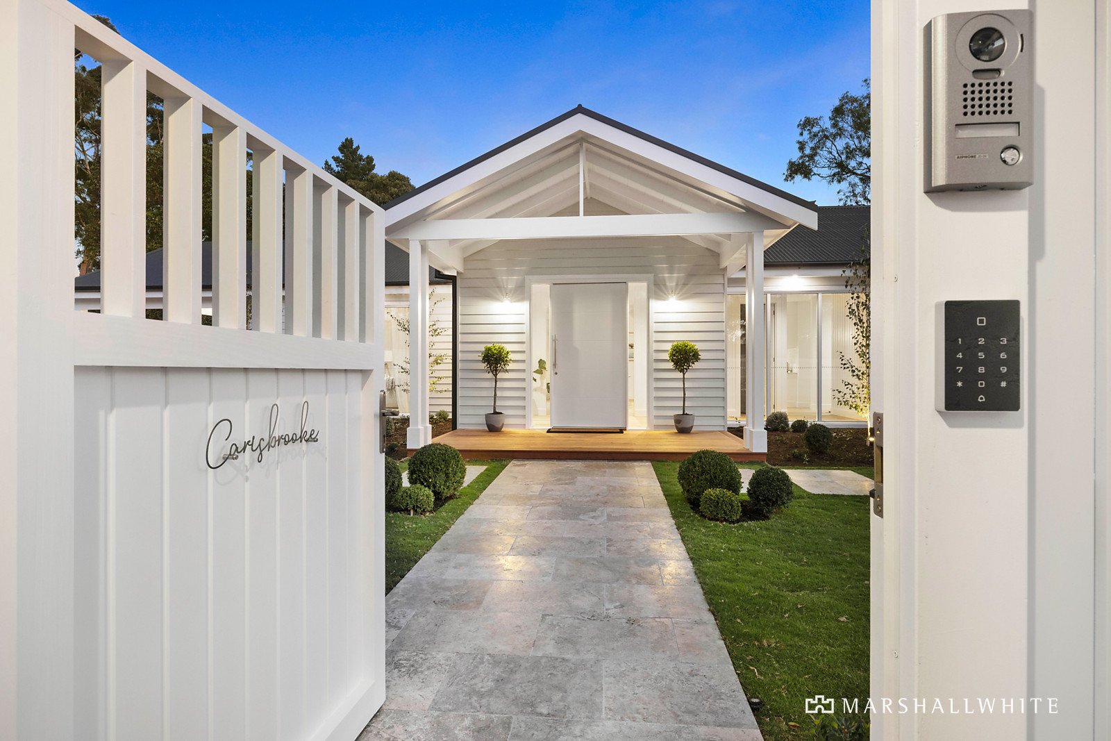 Privately set behind a high picket fence, with an architectural arbour framing the Arundel Court entry-gate, a Silver Travertine path leads to the impressively proportioned main residence, flanked by a series of patios, decks and pergolas, in beautifully landscaped gardens.