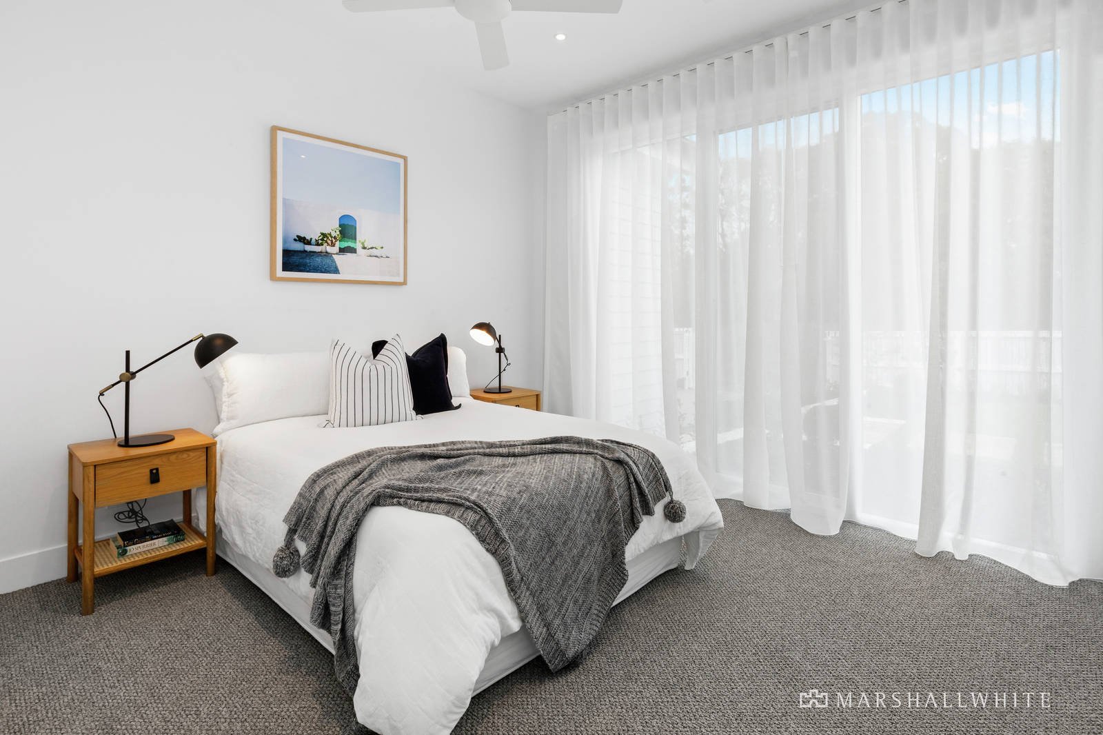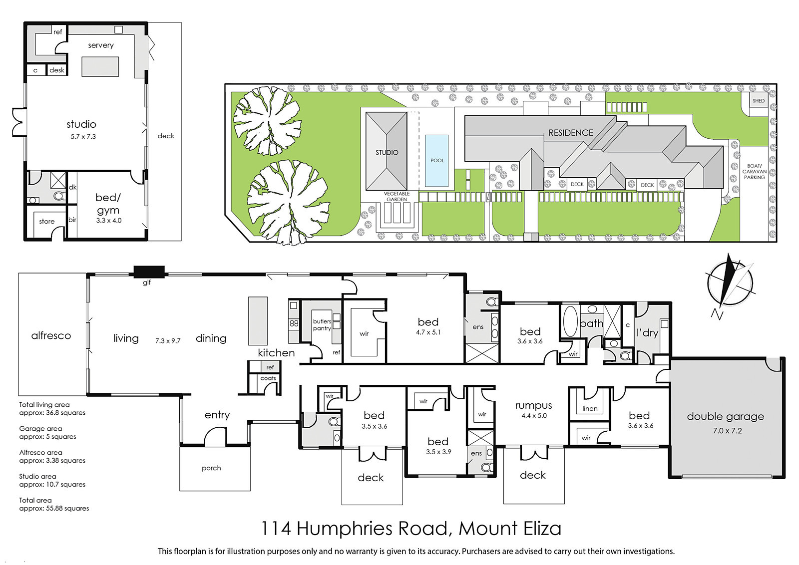 With dual access driveways, the main double auto remote garage has direct interior access to a mud-room alcove at the end of the central hallway. There is also plenty of off-street parking, including space for a caravan and boat, lushly landscaped gardens with newly laid turf, irrigation-system, lighting and raised veggie beds and a garden shed. Includes auto gates, secure video intercom entry, ducted heating and cooling, double-glazing, ceiling fans in bedrooms, and woollen carpets.