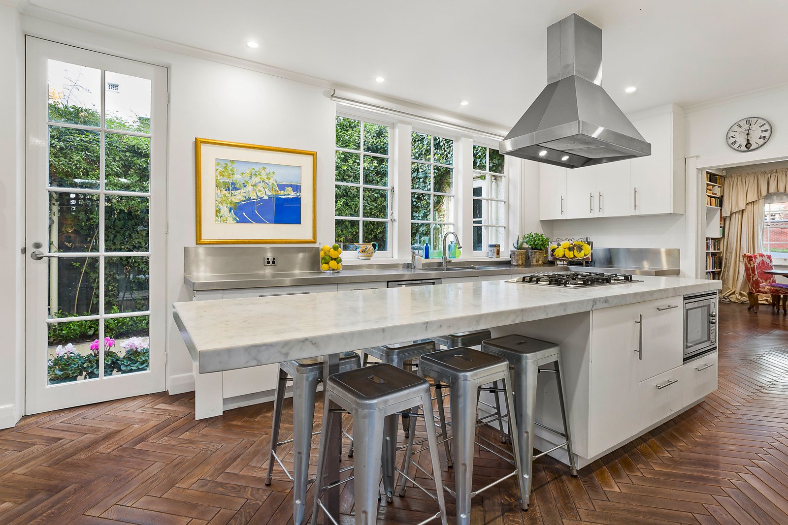 Whilst the façade reflects its past heritage with high pitched gables, the interior exudes warmth and character with subtly retained period features superbly blended with its more contemporary styling. Oak herringbone parquetry floors flow through the downstairs leading to a library/dining room, powder room plus the formal and informal living areas featuring glass walls surrounding a central courtyard with tranquil water feature; serviced by a superb marble, stainless steel and Miele equipped kitchen plus a large adjacent laundry and study flowing to a gently shaded terrace and outdoor entertaining area. Whilst upstairs features six bedrooms with BIRs, main with ensuite and private balcony, two family bathrooms and a walk-in dressing room. Other features include some City views, v/intercom, alarm, gas LFPs & OFP (living), hydronic heating, R/C air conditioning (upstairs), new carpets, surround sound, gas/mains BBq, extensive storage including basement/cellar & attic room, watering system, 40,000ltr underground tank, remote garage & tandem off-street parking.