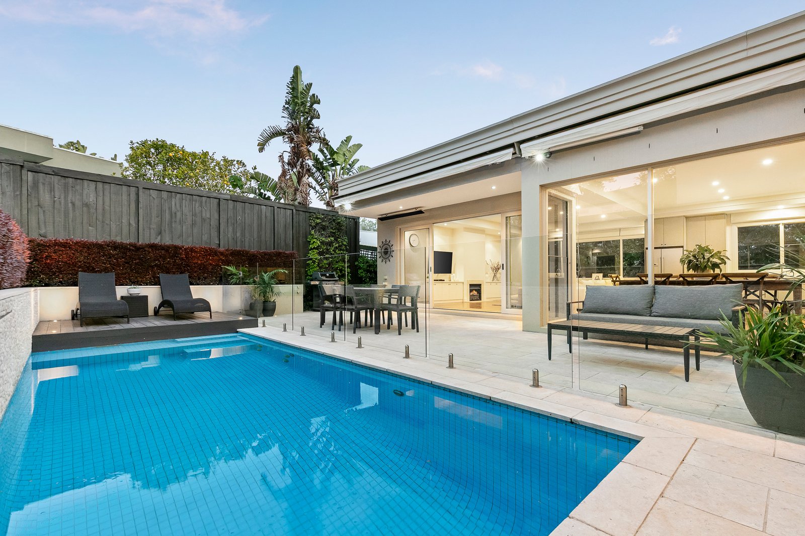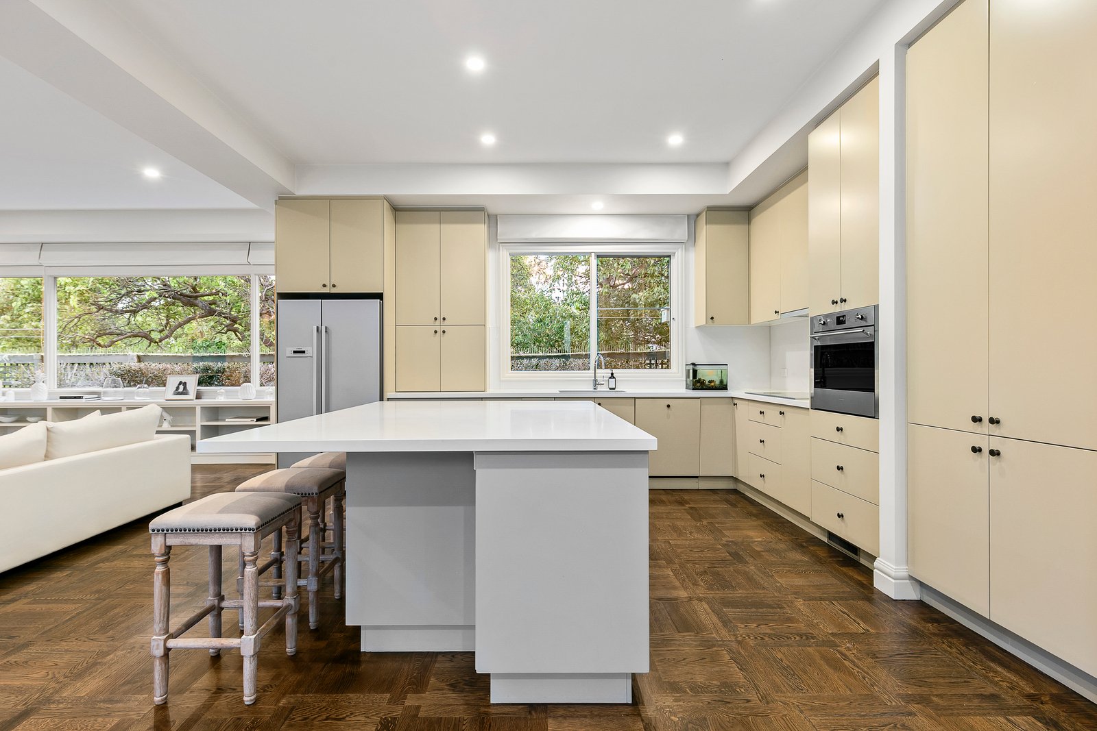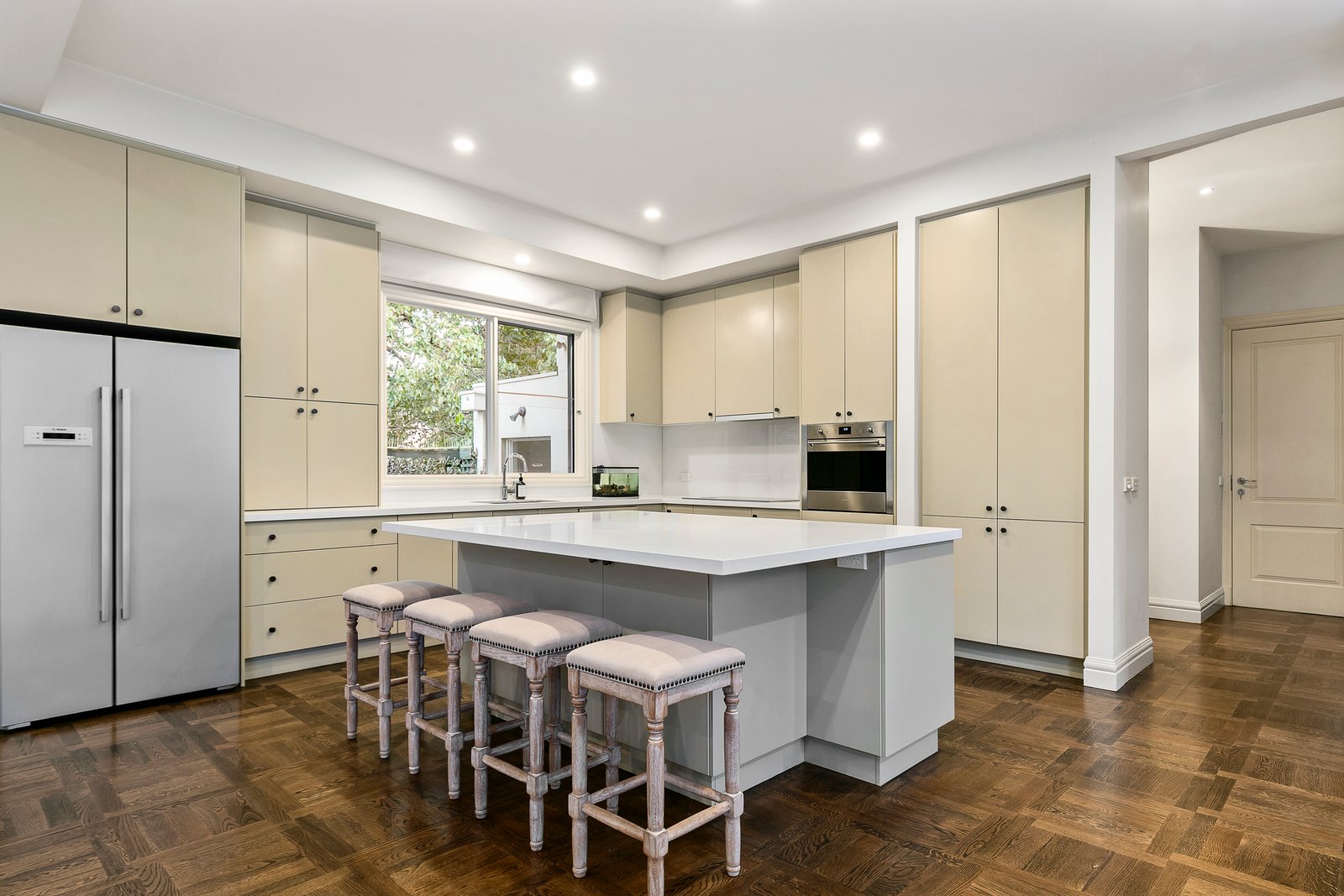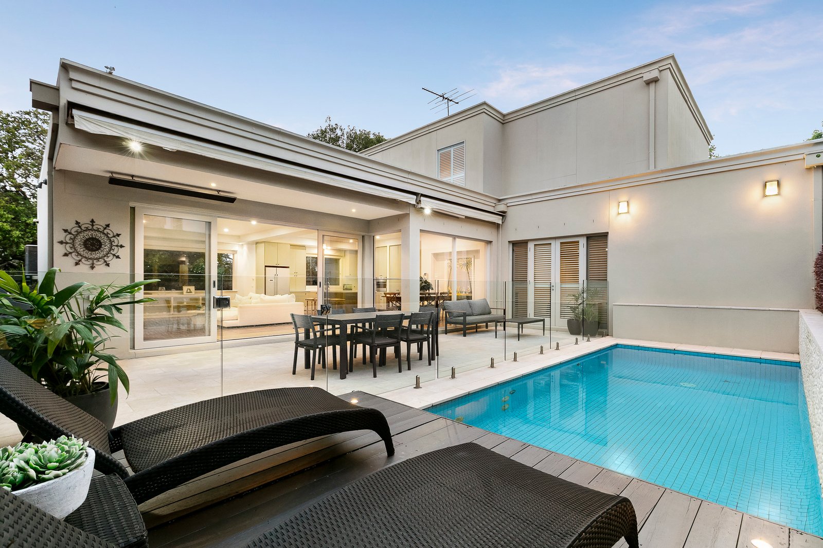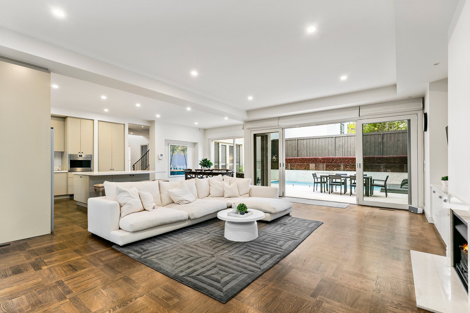 Beautiful European Oak parquetry floors flow through an entrance hall with a soaring second level ceiling opening to a formal sitting room, downstairs main bedroom with dressing room and ensuite opening to the northern courtyard; plus a powder room and laundry. An expansive north-facing family room with an impressively appointed Smeg, Bosch and Miele gourmet kitchen and large island bench also opens to the sun drenched, paved outdoor entertaining area, garden and pool. Complemented by three upstairs bedrooms with built-in robes plus a sky lit family bathroom & powder room. Other features of this superb home include video intercom, alarm, security camera, Plantation shutters, GasFPs, R/C air conditioners (upstairs), ducted vacuum & heating, electric awnings and remote double garage with storage and secure internal access.