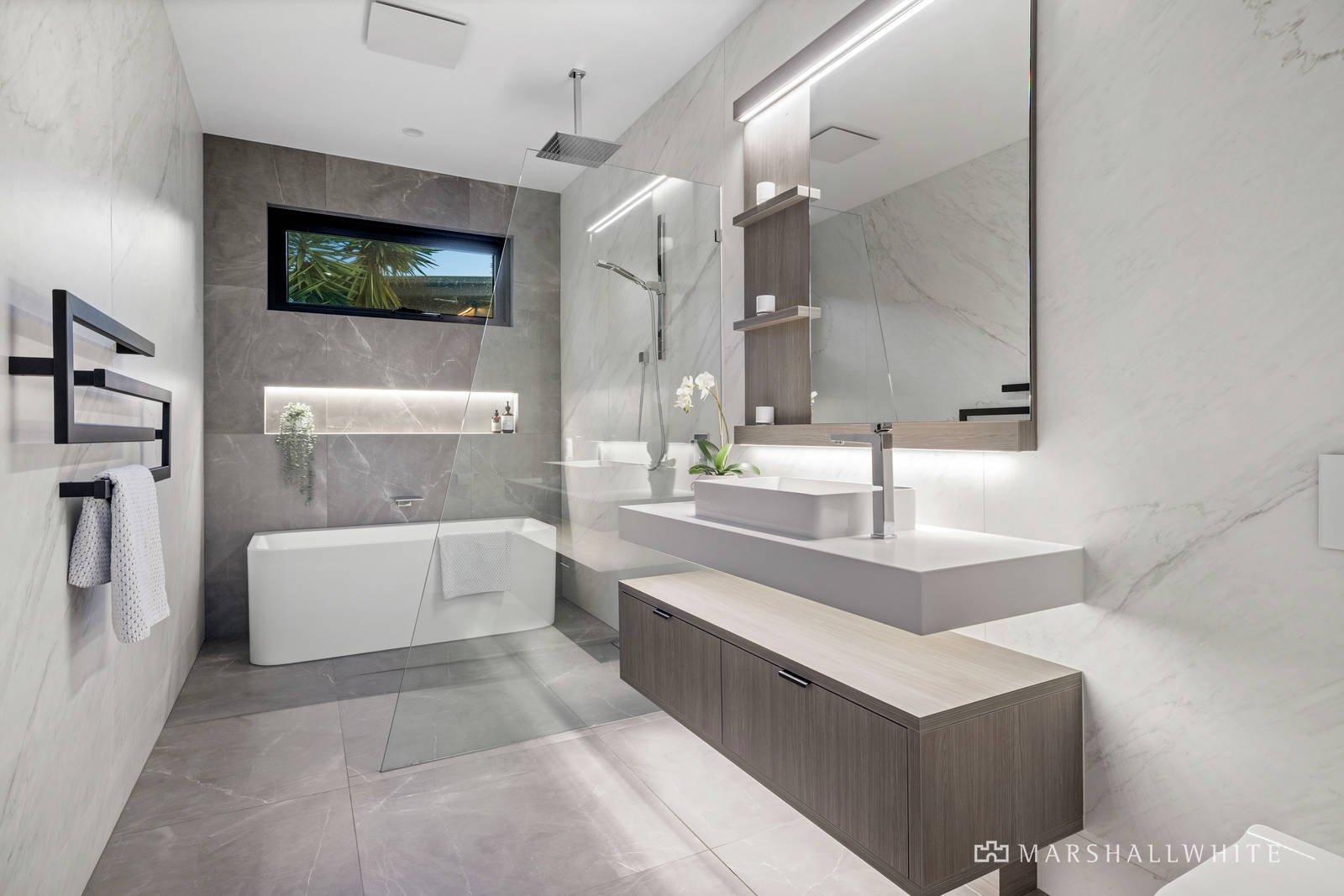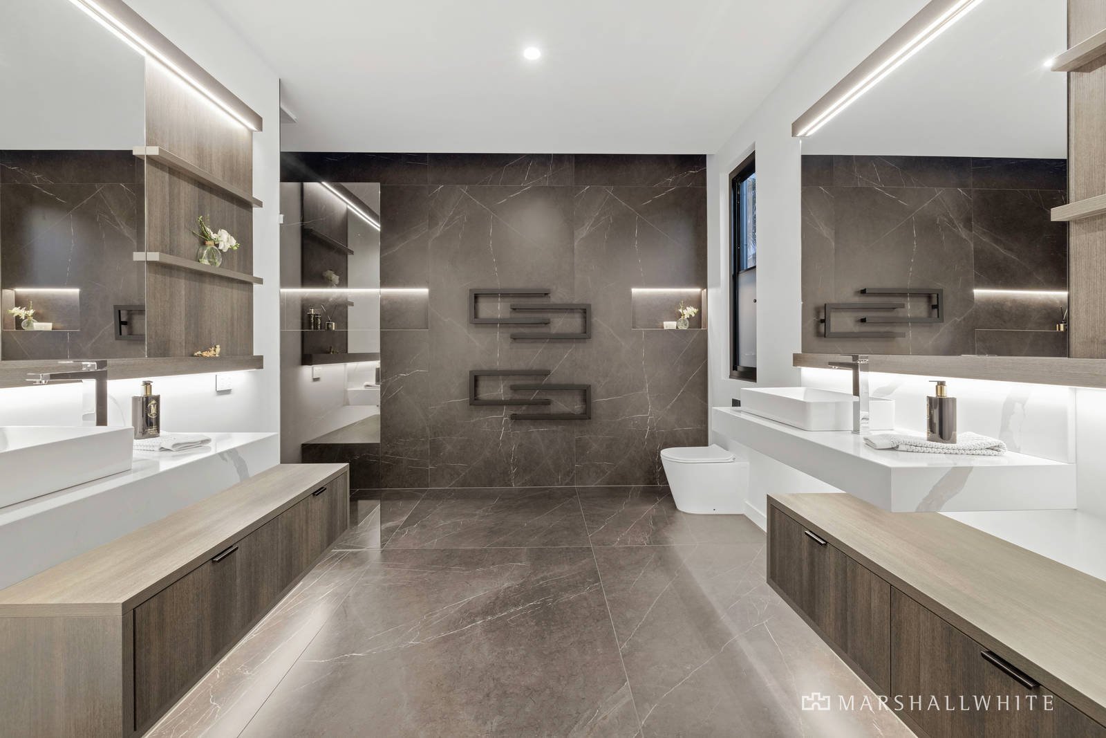 Victorian 2020 Bathroom Design of the Year) designed by Interior Designer, Sam Robinson, and dressed to evoke a moody ambience through large-format slab tiles and mirroring tone-topped vanities.