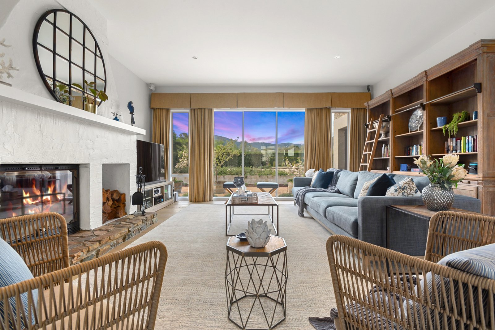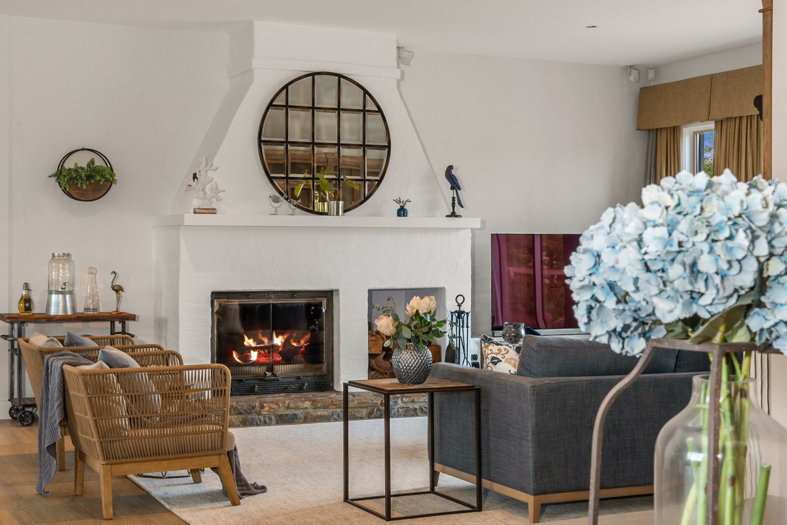 • Lounge with Philippe Cheminees wood fireplace and views north to the mountain, south to the garden terrace