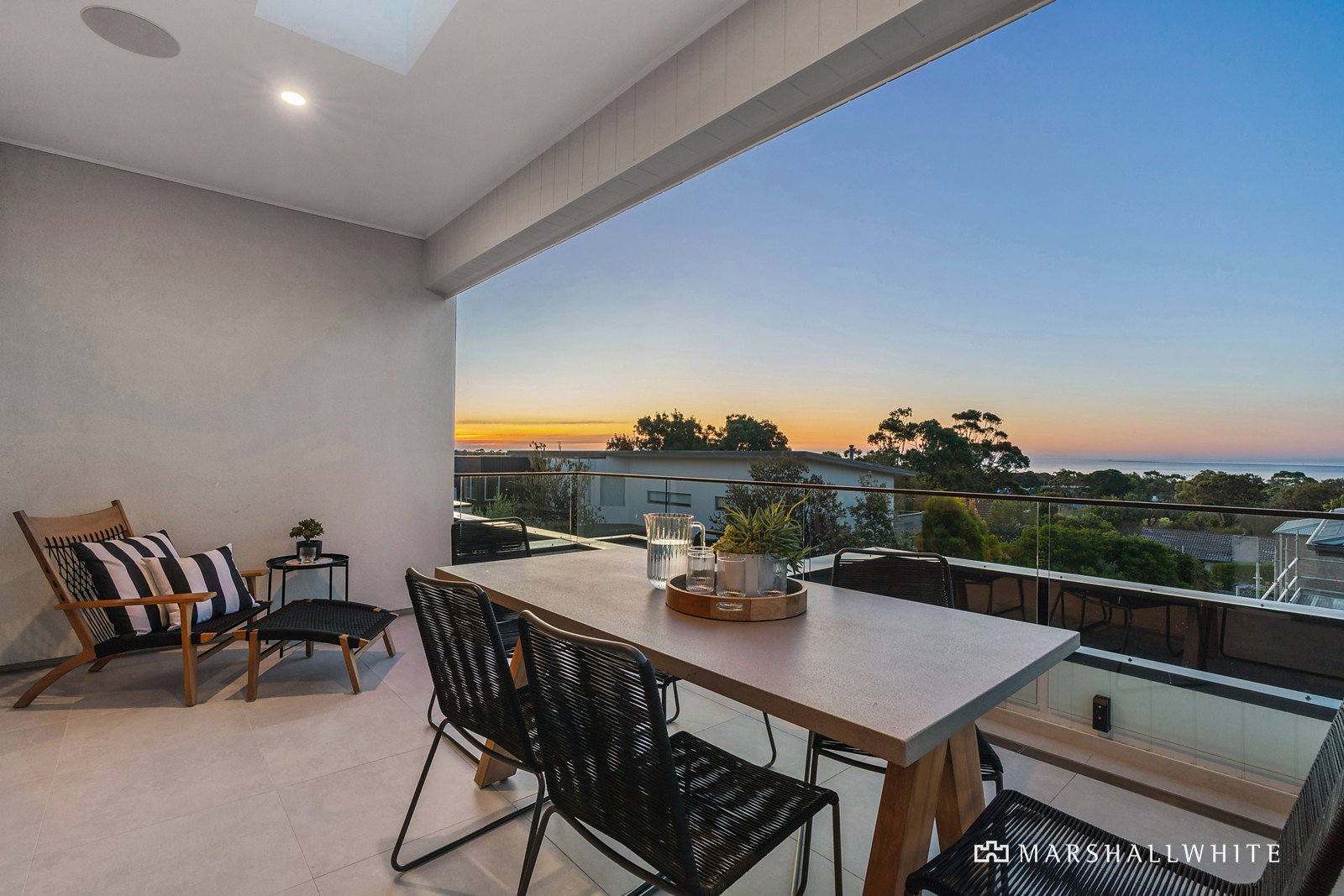 Upstairs, the spacious open-plan living area is designed to showcase the captivating water views, including the iconic McCrae lighthouse, while the undercover alfresco dining/entertaining balcony has a large skylight as well as downlights. The stunning New York loft style designer kitchen has stone benchtops, Asko cooking appliances including a gas cooktop and double ovens and is complemented by a fitted home office and an adjoining powder room. The primary bedroom suite is also on this level and includes a walk-in robe and ensuite bathroom. Additional features include an automated watering system, water tanks, built-in speakers, ducted heating and refrigerated cooling, and an under-stair storage/comms room.