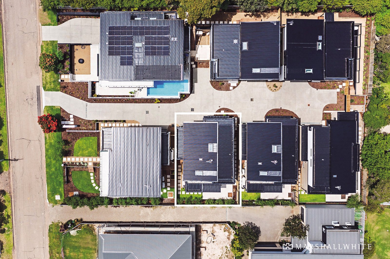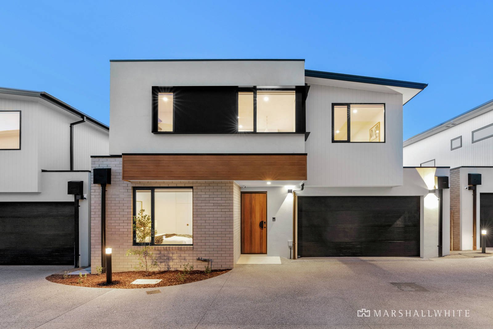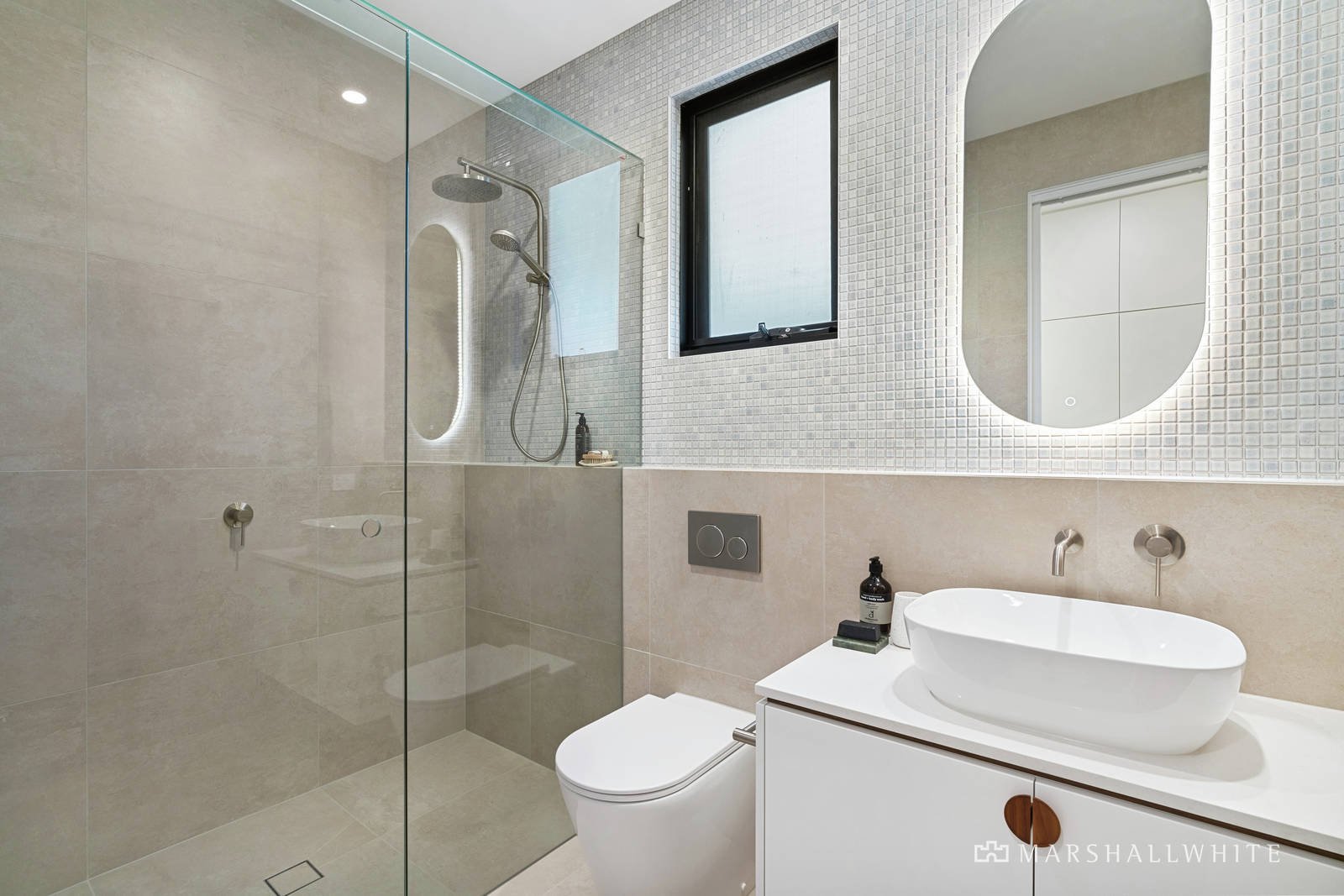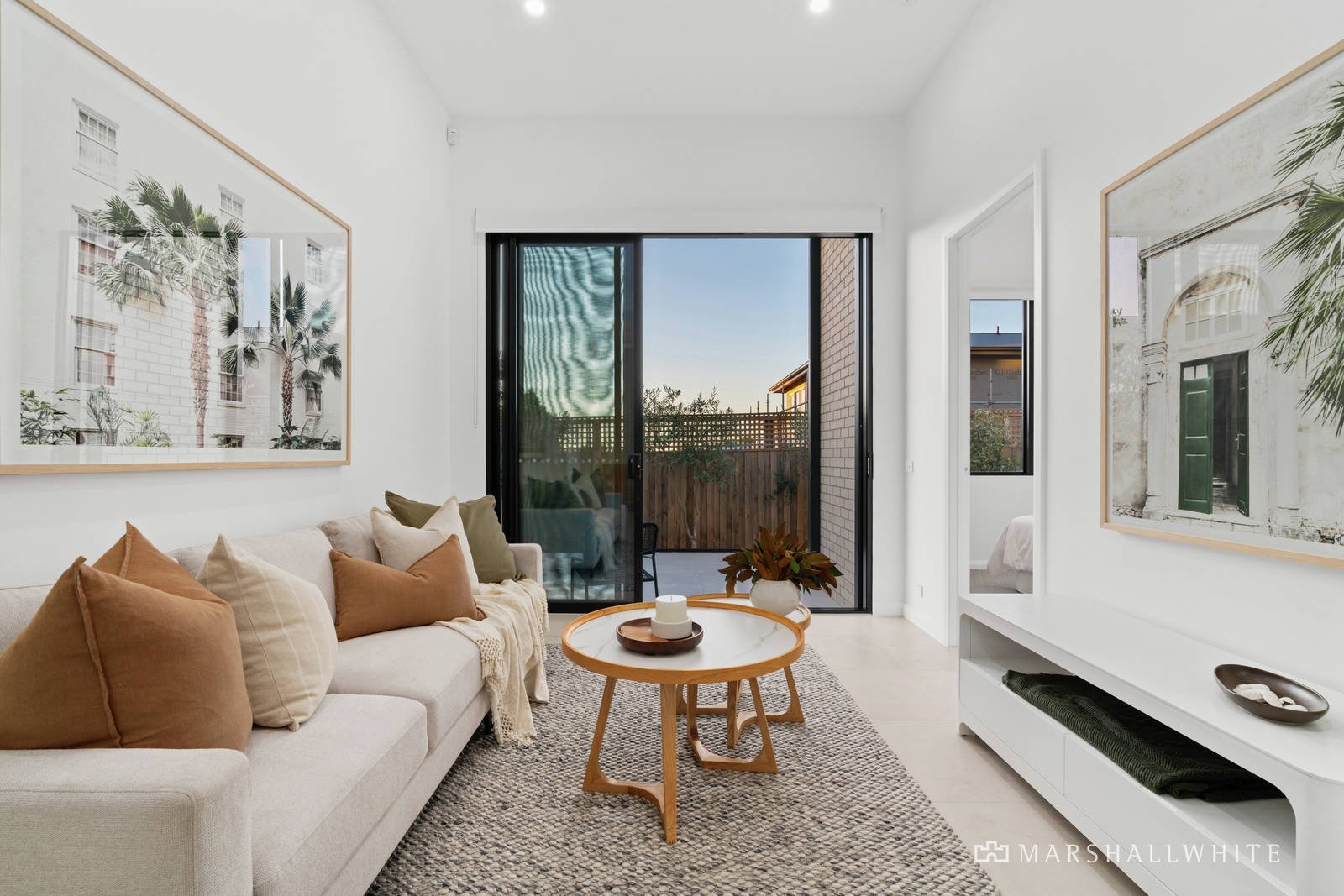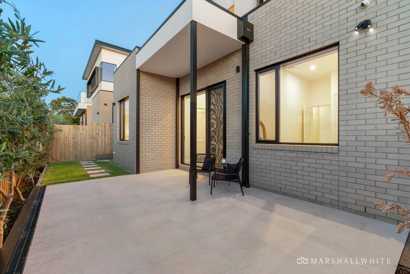 Outstanding in architectural design elements including high ceilings and split levels, the ground floor features a double remote-operated garage with internal plus rear access, three bedrooms with built-in robes and a living area with glass sliding doors opening to a private paved courtyard lined with olive trees, and a lush, north-facing lawn area. The lower-level bathroom has an extra-deep designer tub, and a twin stone vanity with LED lit mirrors, plus there is also a luxe floor-to-ceiling tiled powder room, and a full-size laundry with external access.