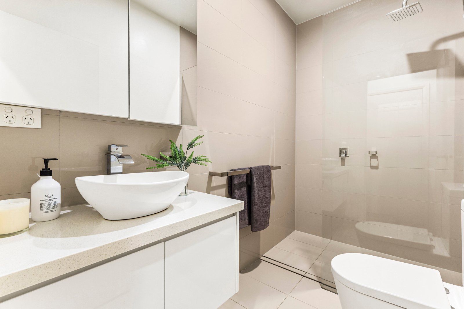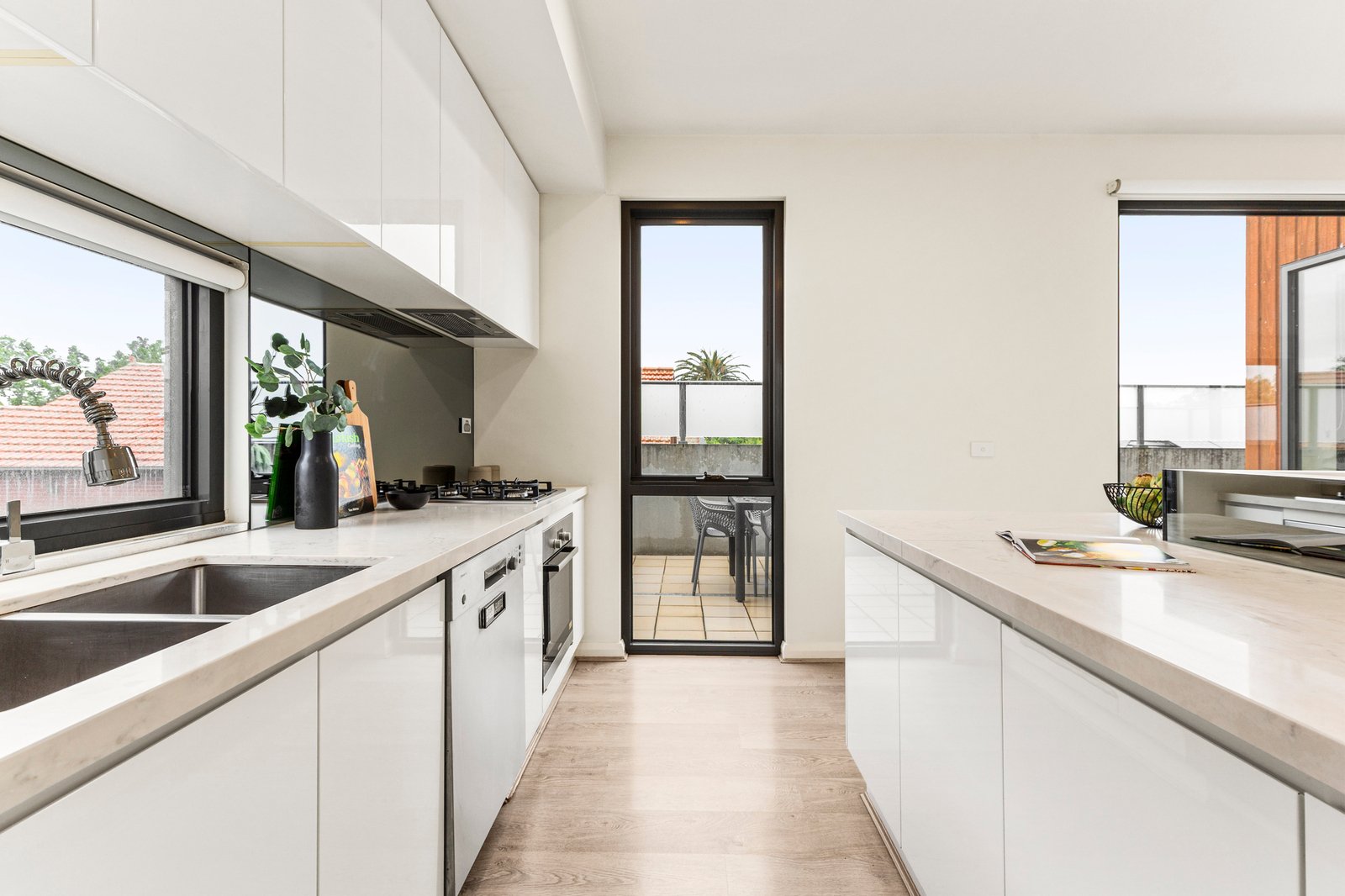 Expansive upstairs living and dining unfolds under high ceilings and opens to two terraces – one of which is impressively sized and the other of which is drenched in northern sun – to create a sense of light and proportion that exceeds expectation. Underpinned by a Bosch-equipped kitchen with stone benches, the open-plan is equipped for a gourmet entertainers’ lifestyle.