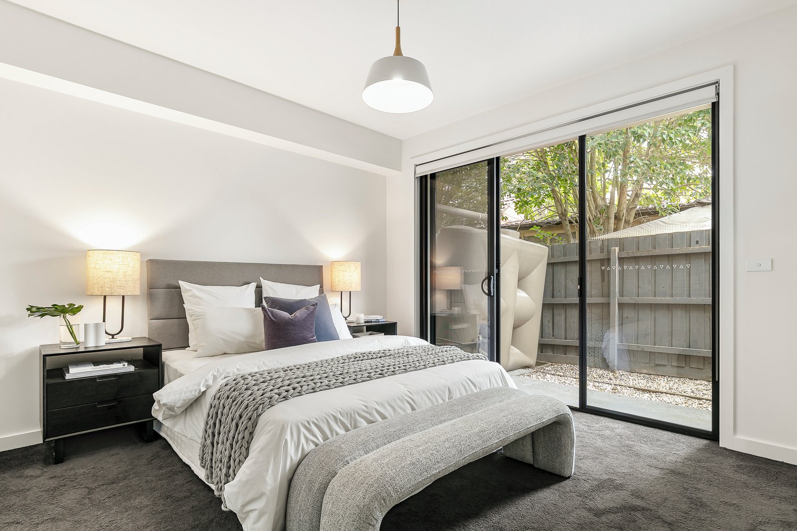 Quietly set at the rear of a boutique block and surrounded by leafy gardens and parklands, this stylish double-storey townhouse delivers the low-maintenance living that is private, light-filled, and effortless.