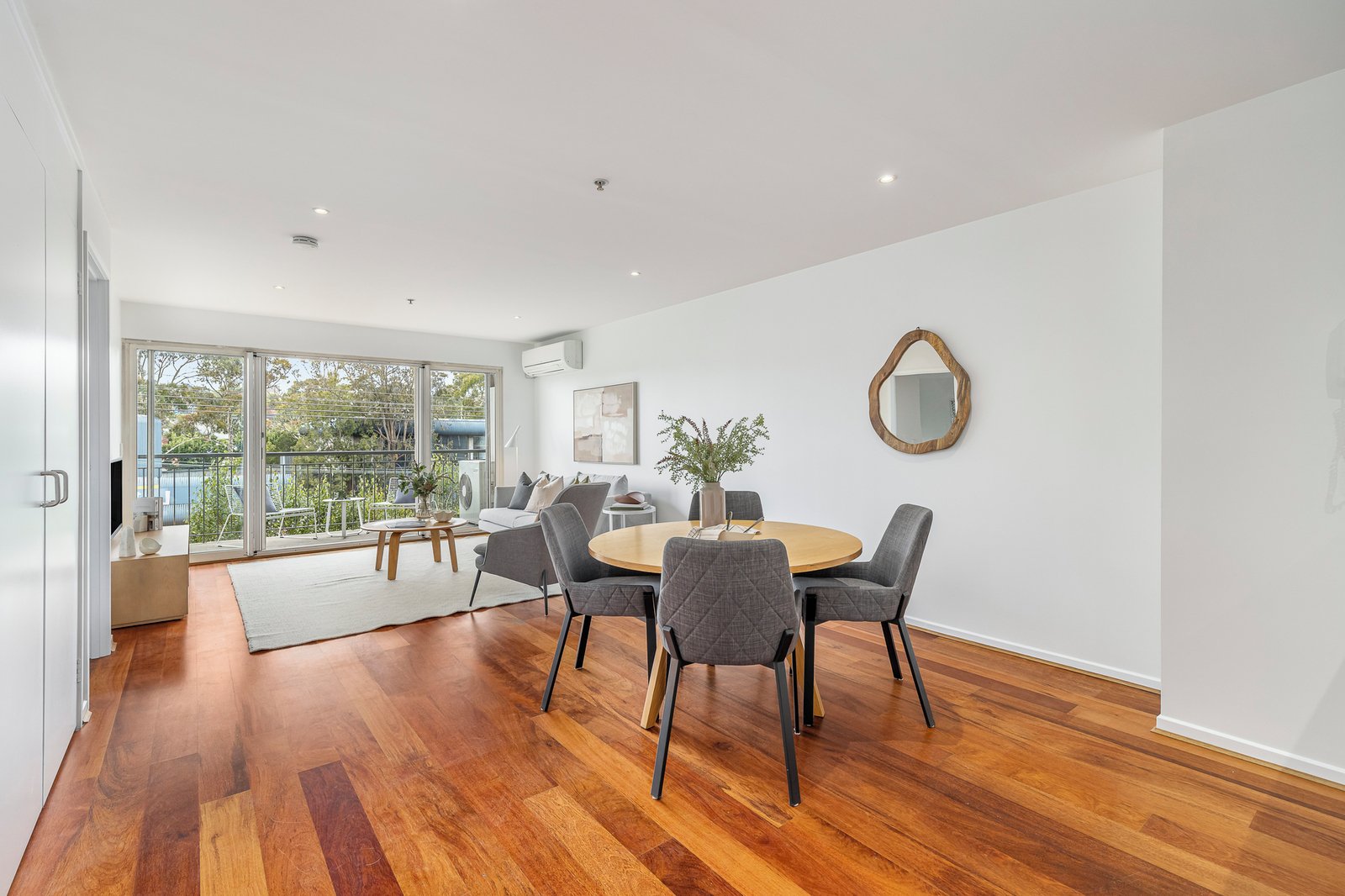 Wide floor-to-ceiling sliding doors extend the living space to a sun-filled entertainer’s balcony, ideal for relaxed outdoor dining and enjoyment of the north-facing aspect.