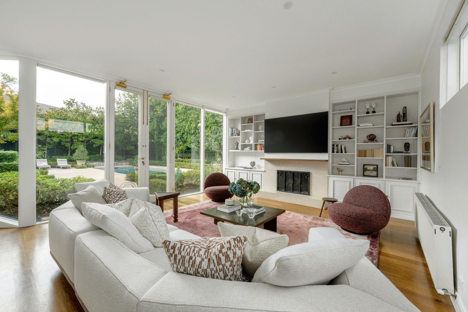 Beyond its elegant façade, refined interiors of generous scale unfold with formal and informal living zones, open fireplaces and seamless indoor–outdoor entertaining centred around a gourmet Miele-appointed kitchen and sun-filled family domain. Expansive glazing connects living spaces to the serene garden and solar-heated pool, creating an exceptional environment for entertaining and relaxed family living.