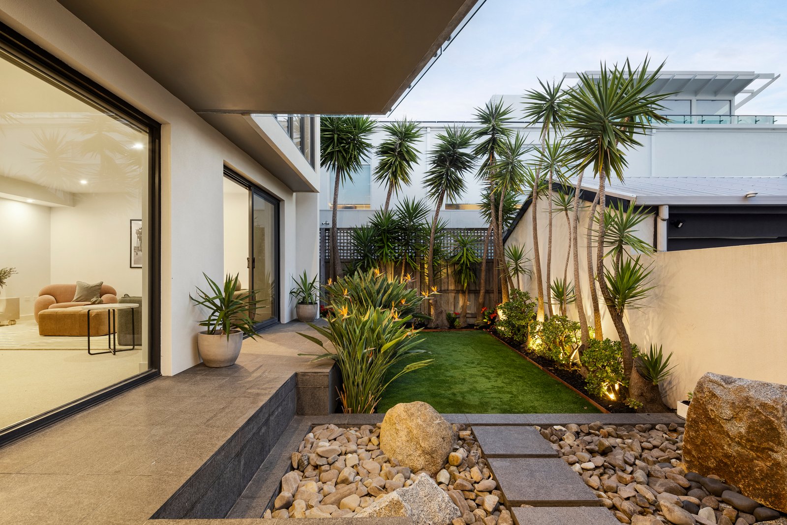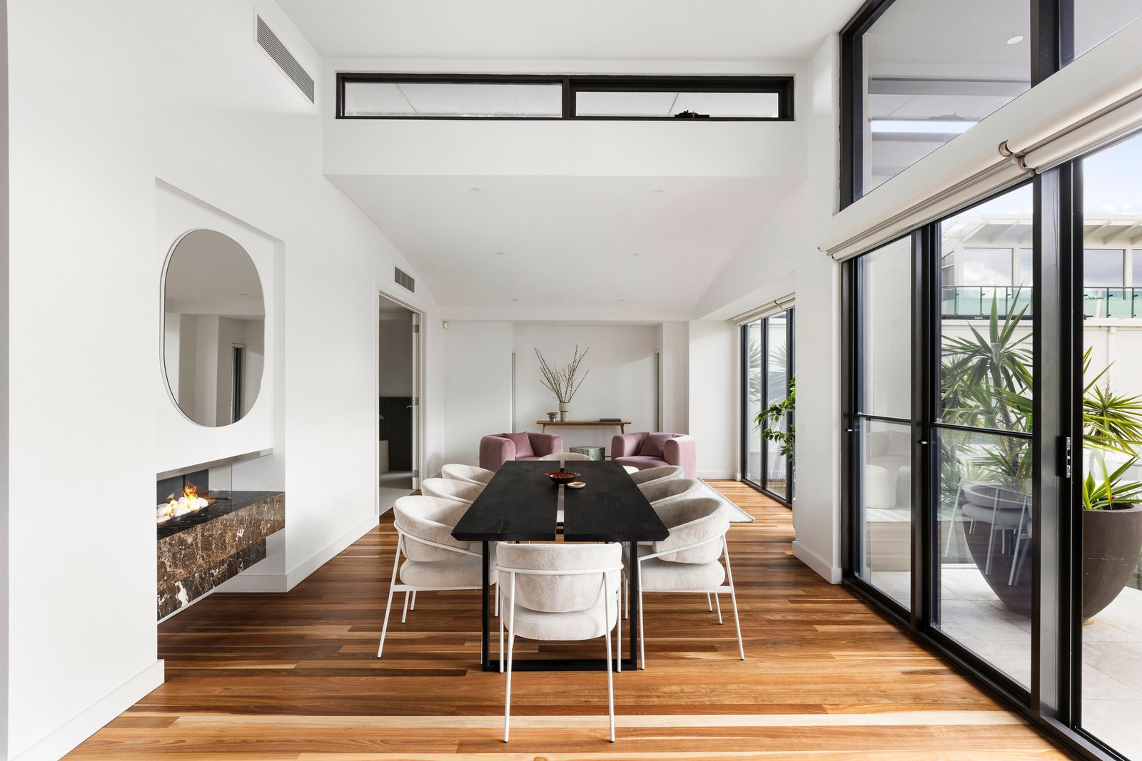 Just steps to some of Brighton’s most loved attractions including the Bathing Boxes,The Baths and The Royal Brighton Yacht Club, and just a five minute walk to Church Street, the home is privately set at the end of a shared driveway with double remote garage, and turn-around space, that opens to an oasis-like, landscape-designed, lawn-free courtyard garden. A marble tiled entry hall reveals an architectural timber open staircase with steel and glass balustrade that ascends to the showstopping upper level capped with double-height raked ceilings. Floor-to-ceiling double glazing incorporating sliding stacker doors with automated blinds and clerestory windows frame the breathaking water views and link to the broad alfresco entertaining balcony, positioned for optimum bay and sunset vistas enjoyed with fresh sea breezes. Also oriented to the iconic waterfront surrounds incorporating palm trees and yachts moored on the Middle Brighton Pier, is the gourmet central stone kitchen, equipped with Miele appliances including a gas cooktop, convection oven and dishwasher, while a pebble flame heater in polished marble surrounds, adds ambience to the timber-floored open-plan living/dining area. Double doors open to the lavishly sized main bedroom suite, which is also designed to enjoy water views, and is newly carpeted in sumptuous wool loop pile, while a luxe marble ensuite with double shower and twin vanities and a walk in robe/dressing room complete the indulgent upper level parental domain.
