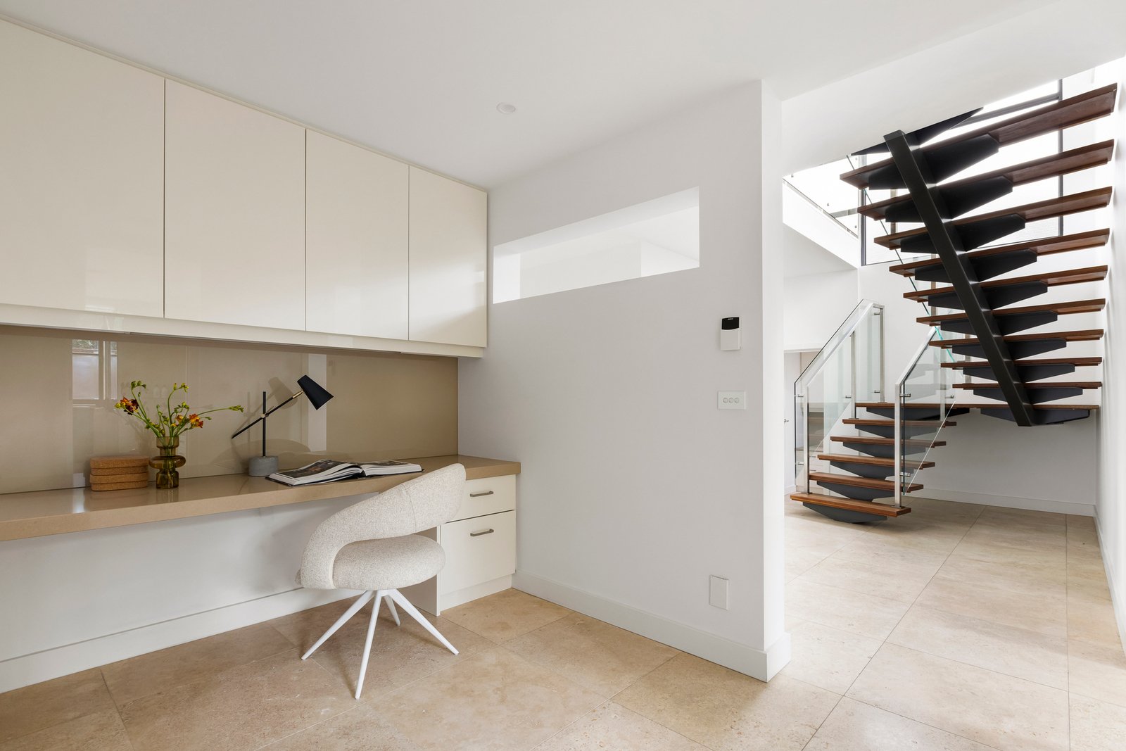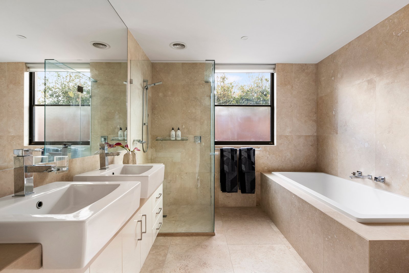 The equally impressive lower level layout comprises a large living room with garden views, which can also double as a home cinema as it has soundproofing and integrated connections. Also newly carpeted are two generously sized bedrooms with built-in robes and sliding door access to a private rear alfresco deck, and a study. The a lavishly proportioned marble bathroom has an oversized built-in bath and separate shower, while steps lead down to a skylit study/home office with two built in desks, and easy internal access from the double remote garage with built-in storage shelving. Additional features include a well-appointed full-size laundry with external access to a rear clothes line, an upper-level marble powder room, central heating and cooling, security alarm and ducted vacuum.
