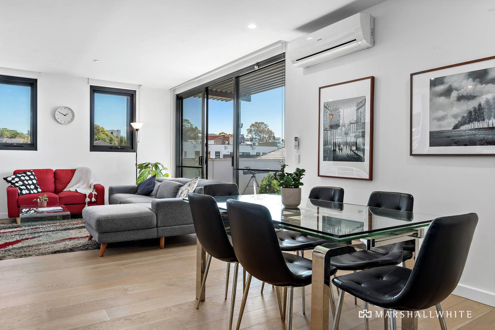 Highlights include a stylish kitchen with striking stone benchtops/splashbacks and SMEG appliances, flowing through to an uncommonly spacious and sunny dining and living area with built-in joinery. The oversized balcony with covered alfresco offers lovely views and ample space for entertaining or a enjoying potted garden.