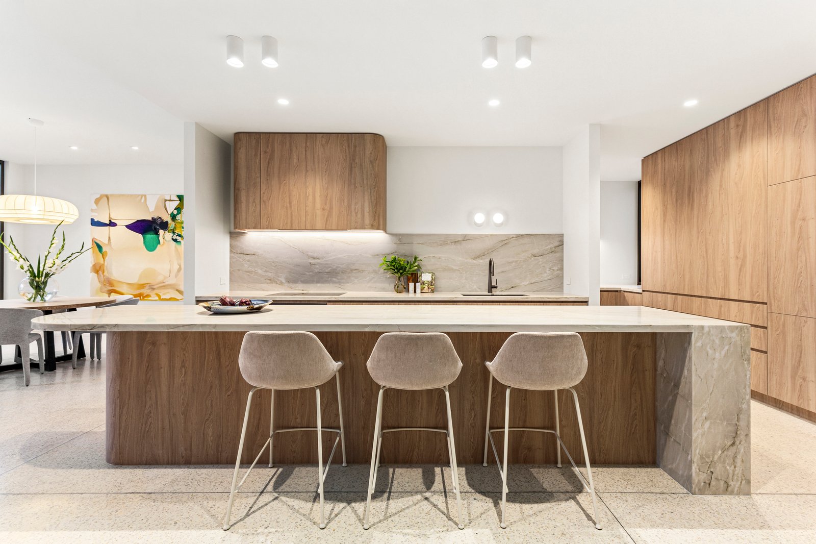An additional three double bedrooms all with built-in robes, including a main with an ensuite; plus a separate dual access bathroom and a family retreat are positioned on the upper level. A generous north-facing open-plan living and dining area incorporates a state-of-the-art kitchen equipped with natural stone bench tops, a full complement of prestige Miele appliances, and an adjacent laundry. Opening through sliding doors to a terrace with a Weber gas barbeque with inbuilt cabinetry – providing a haven for indoor/outdoor entertaining, enjoying a morning coffee or evening drink. Other comprehensive features of this stunning home include video intercom and coded security gate entry, lift access, hydronic heating, ducted cooling and vacuum, high quality fixtures and fittings including Evenex Aspen Elm cabinetry and Aura Gold quartzite stone. Ample internal storage, solar system with battery, landscaped gardens with a sprinkler system plus secure basement car parking for six cars and storage.