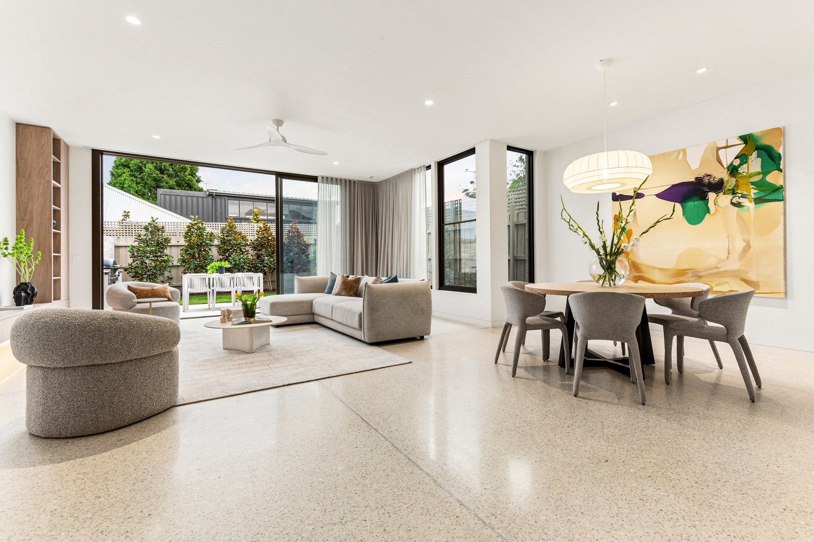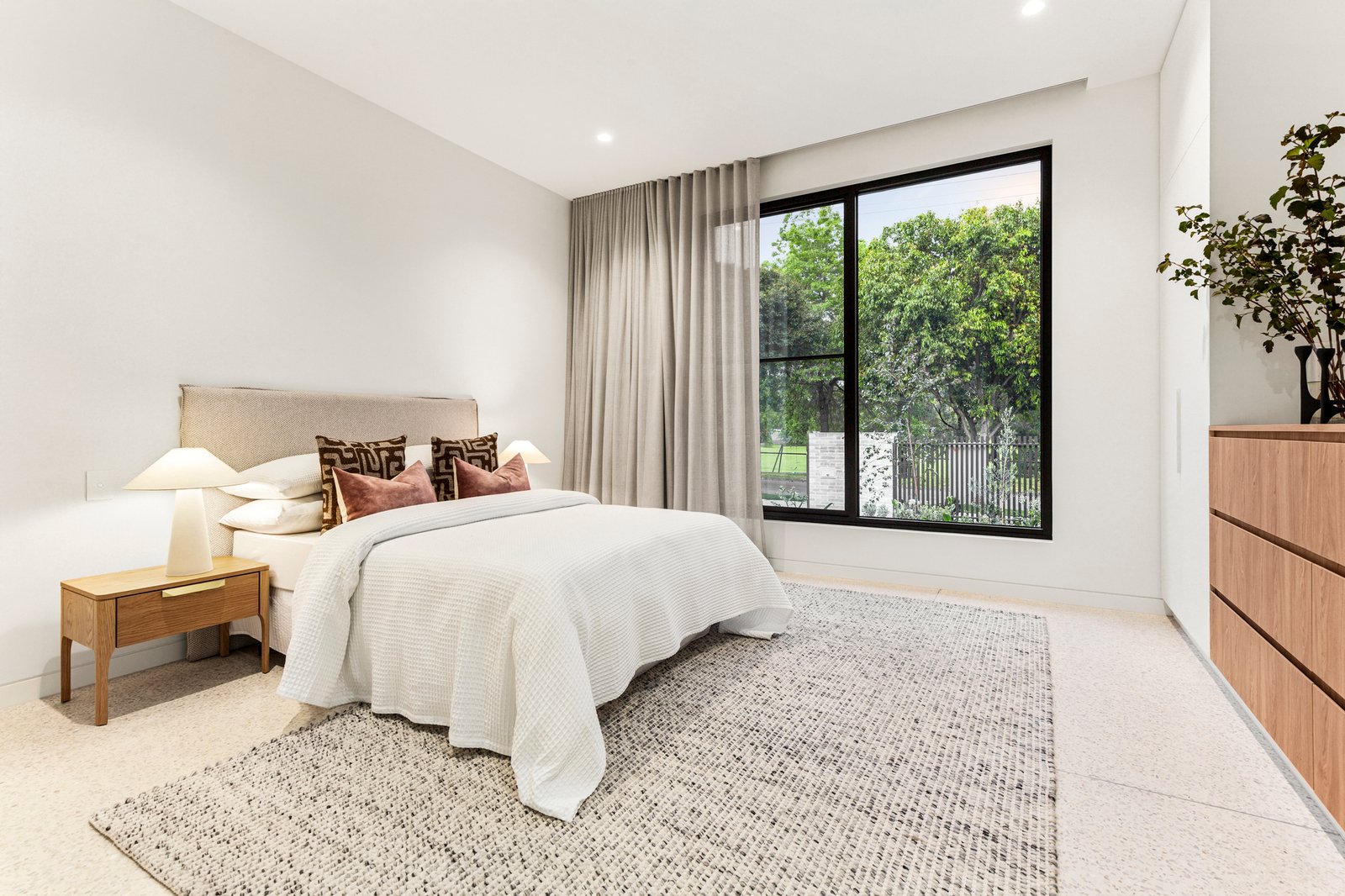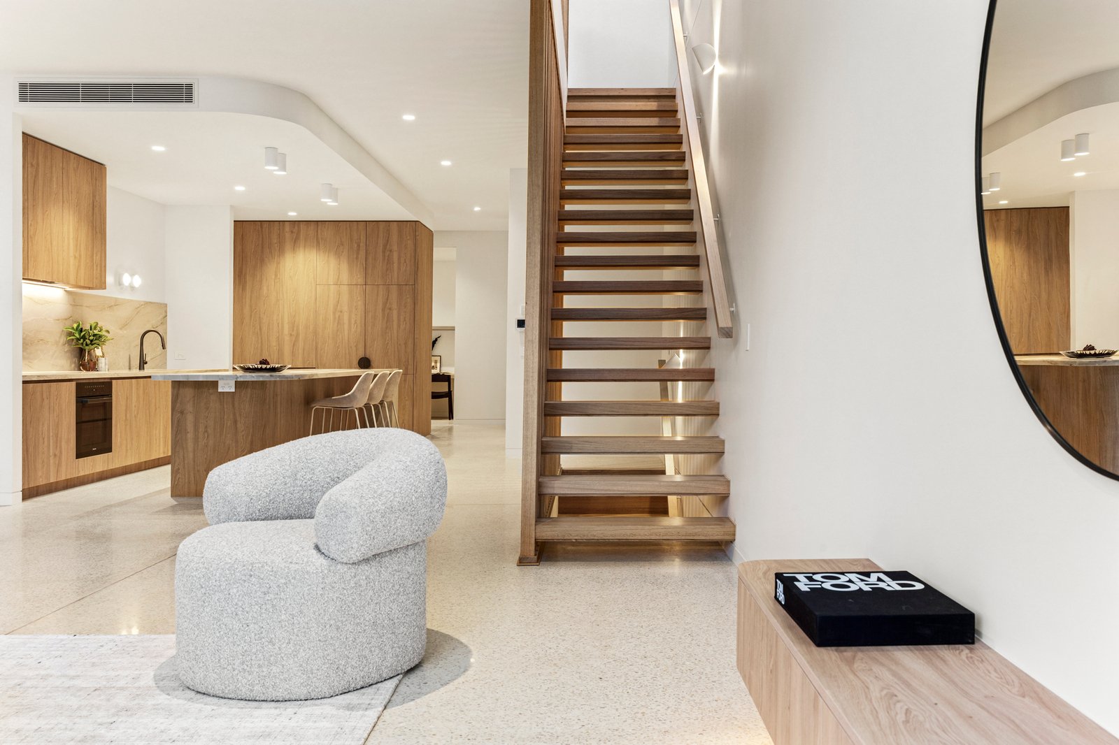 An eye-catching Krause handmade brick façade sets the scene for a sleek, contemporary interior featuring heated concrete floors, high ceilings, floor-to-ceiling doors and windows, creating a spacious ambience. The ground level has a study or home office, guest bedroom with built-in robes and an ensuite and powder room.