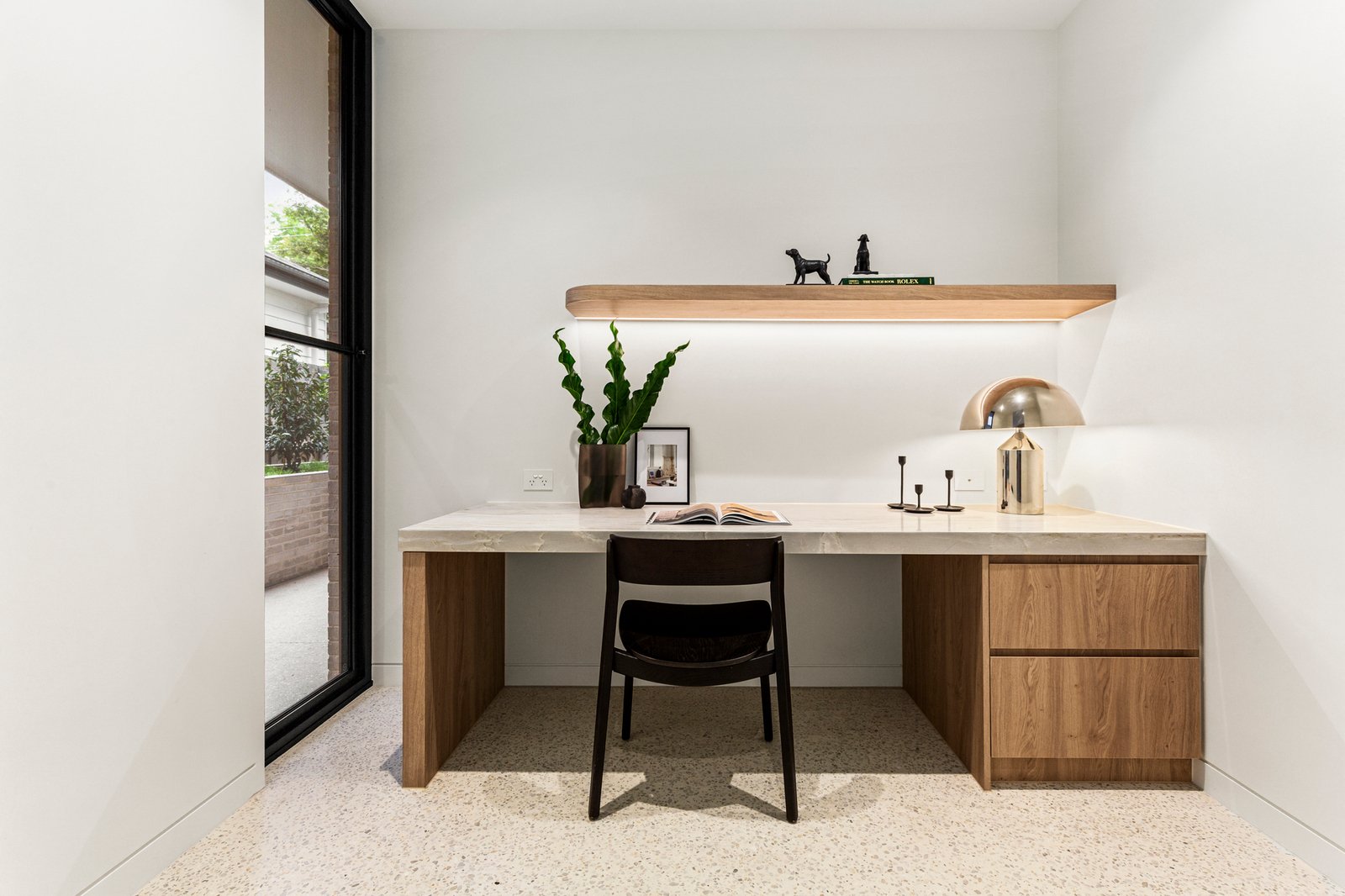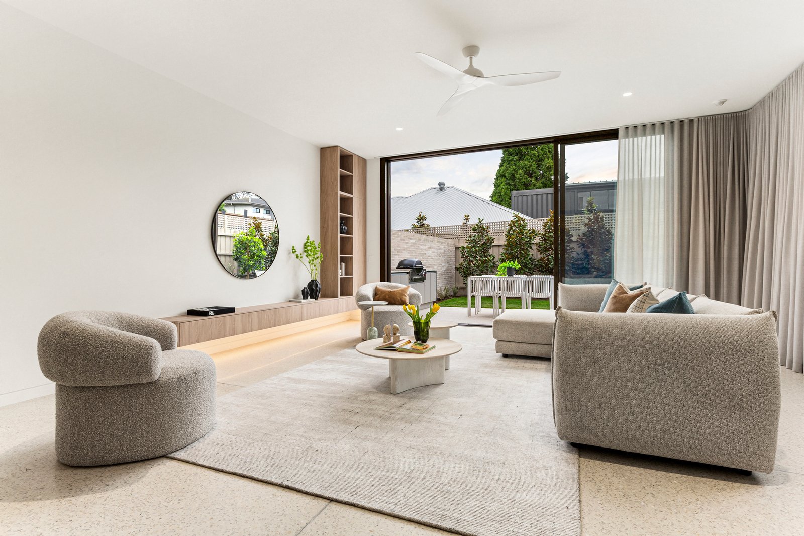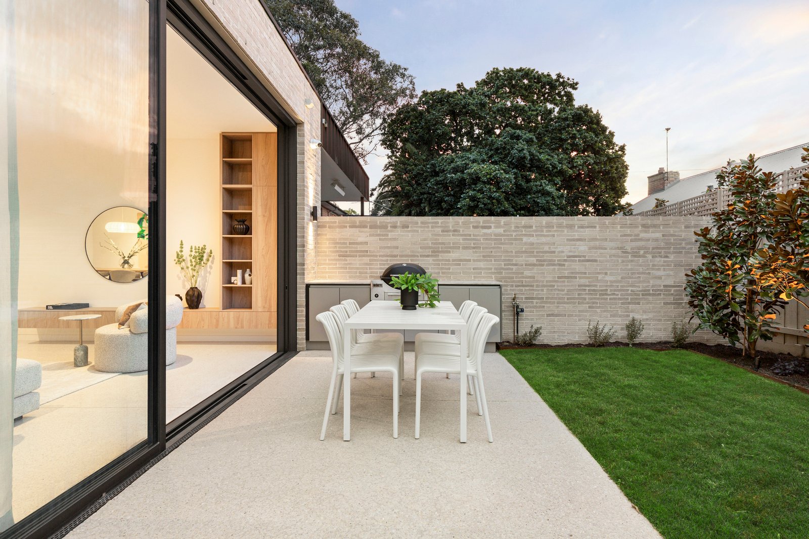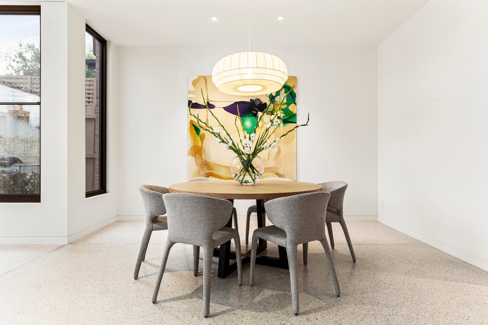 An eye-catching Krause handmade brick façade sets the scene for a sleek, contemporary interior featuring heated concrete floors, high ceilings, floor-to-ceiling doors and windows, creating a spacious ambience. The ground level has a study or home office, guest bedroom with built-in robes and an ensuite and powder room.