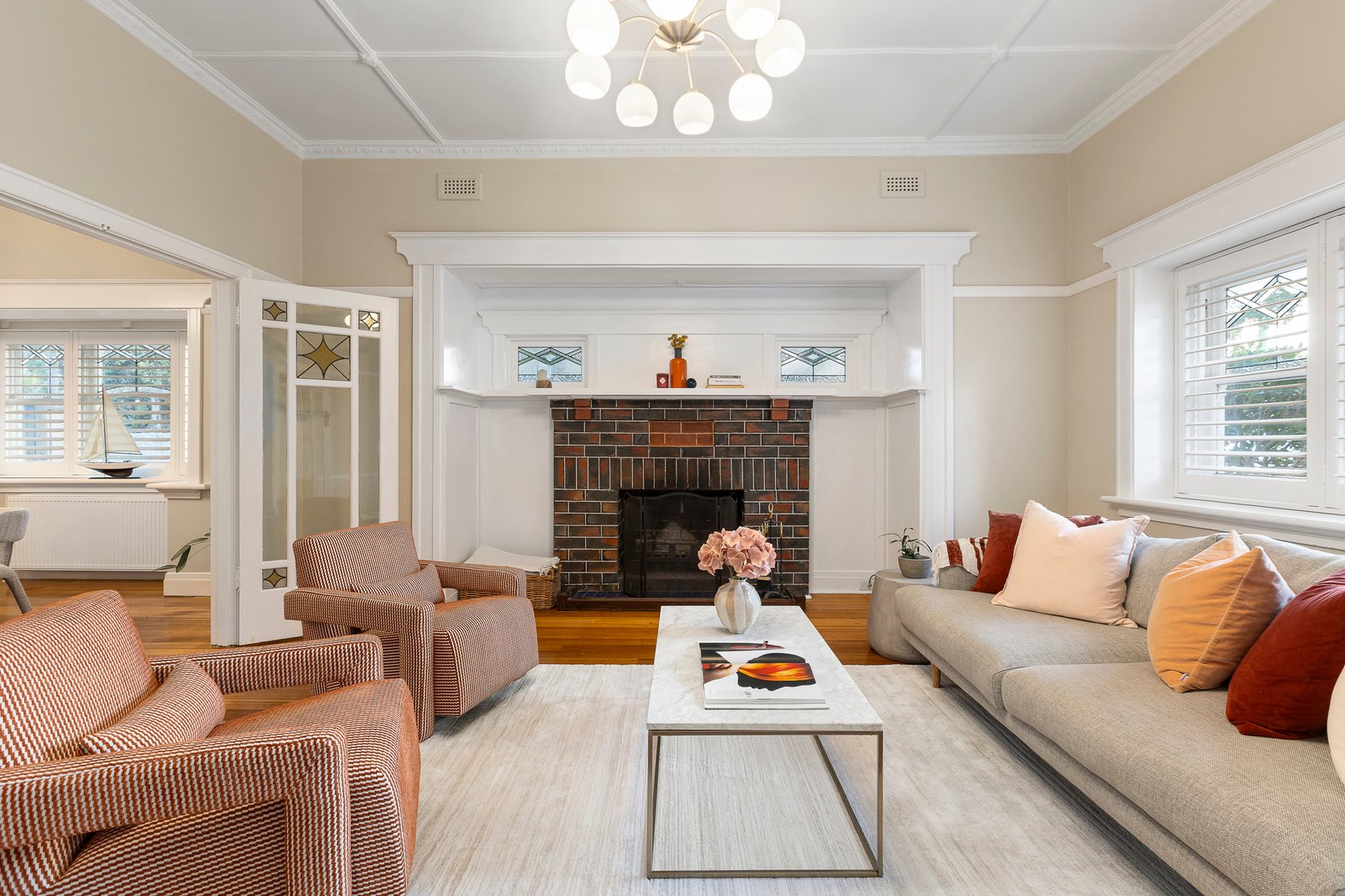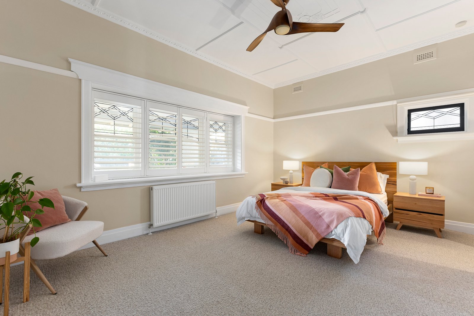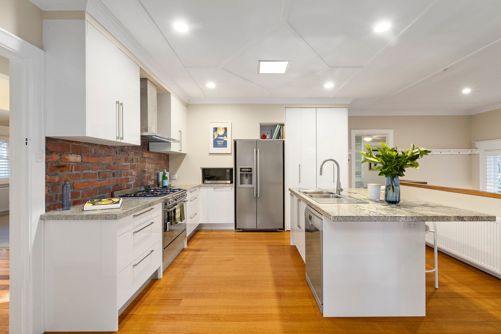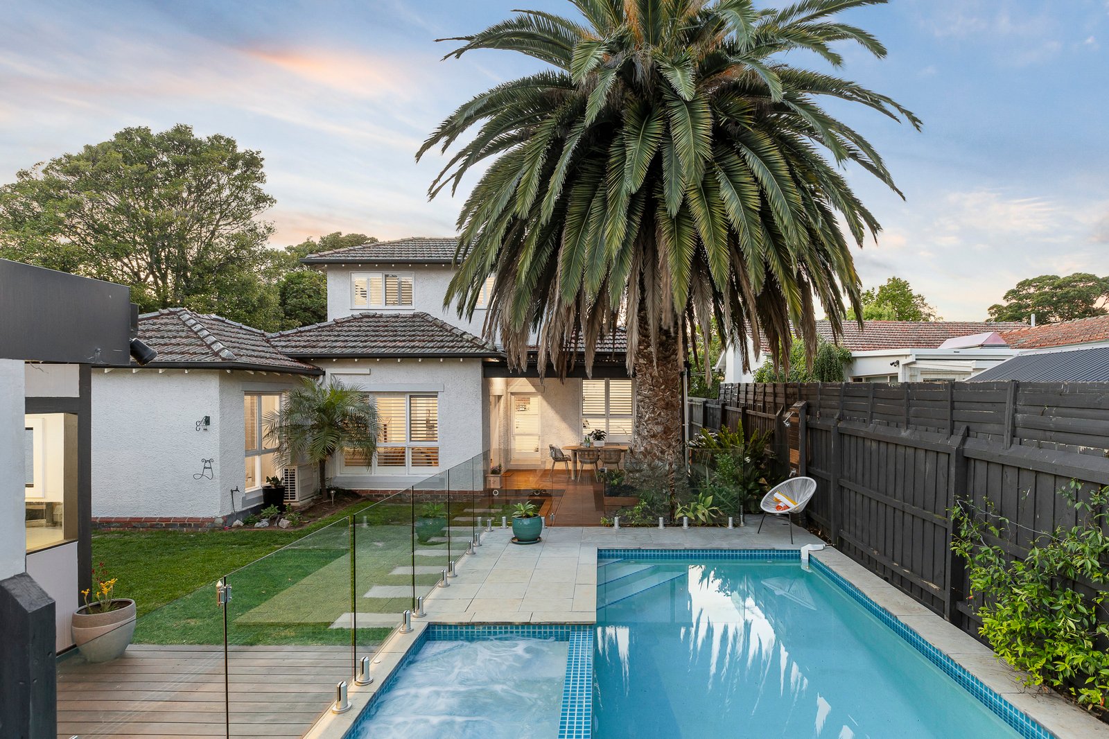 With dual driveway entrances, allowing for drive through off-street parking, and a low-water/low maintenance succulent garden centred with a majestic palm, the home’s elegant stucco clad façade is flanked by a wide, undercover verandah. A light-filled entry hall introduces the fresh neutral colour palette that enhances the original features including timber wall panelling, picture rails, ornate Art-deco plasterwork adorning soaring ceilings, and leadlight glass panelled internal doors. The front formal lounge, with plantation shuttered windows and garden outlooks has a wood fire place, while hydronic heating has been installed throughout the ground level open plan spaces floored with polished Tasmanian Oak. The upscaled stone central kitchen is defined by a custom island bench/breakfast bar and is well-equipped with a Smeg freestanding range with gas cook top, a Bosch dishwasher, and a stone-topped appliance/preparation pantry. Steps lead to the main family living area, with glass French door access to the merbau undercover alfresco deck, that edges the resort-style backyard, complete with Canary Island date palm, a gas/solar heated swimming pool and spa set in bluestone surrounds, a hot/cold outdoor shower, and a pool house/studio. Back inside, there are three pure wool carpeted bedrooms on the ground level, including the zoned main at the front of the home, with fitted walk-through robe and luxe ensuite, a guest suite adjacent to the downstairs powder/shower, and a pool-view bedroom (or study) with a built-in robe. The sumptuous loop pile carpeting continues upstairs where there are another two good-sized robed bedrooms, including one with an elevated study platform with leafy outlooks, and the third bathroom.