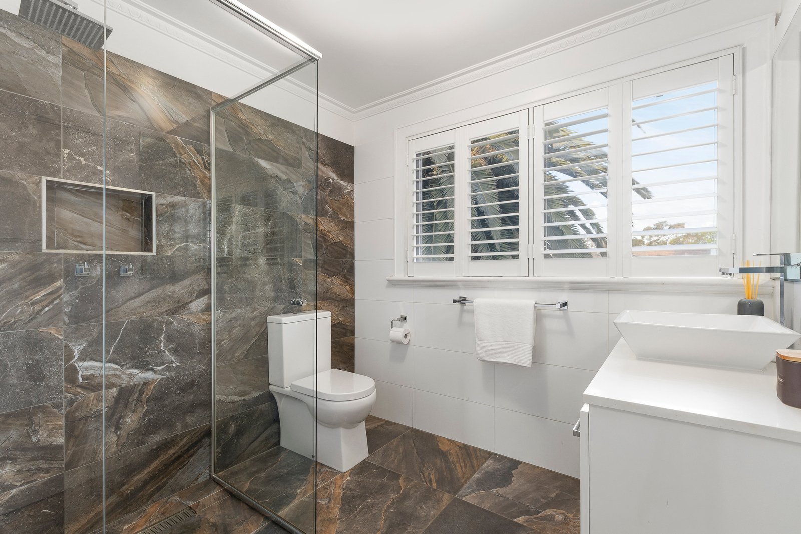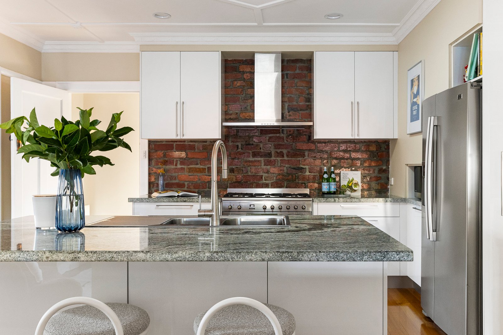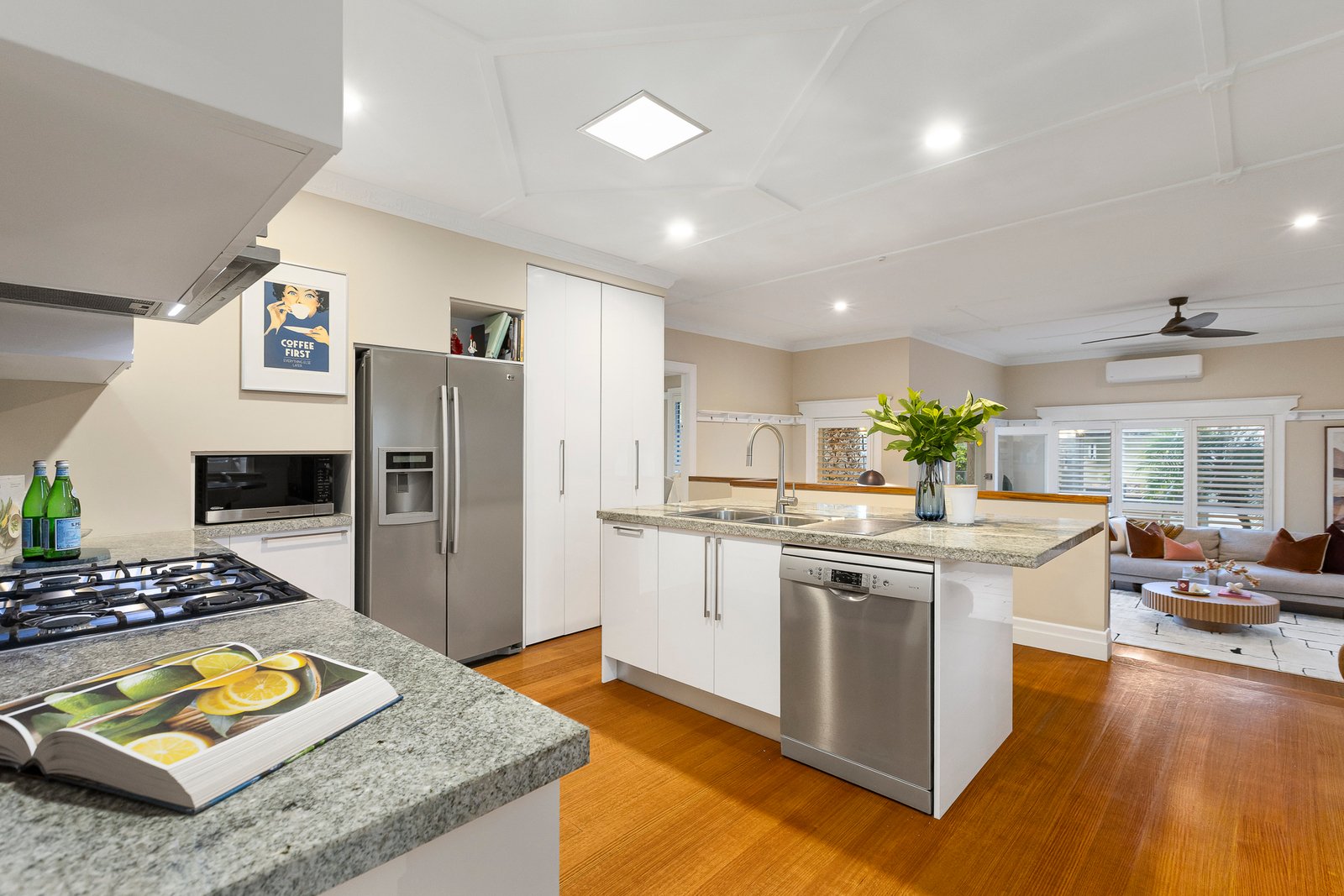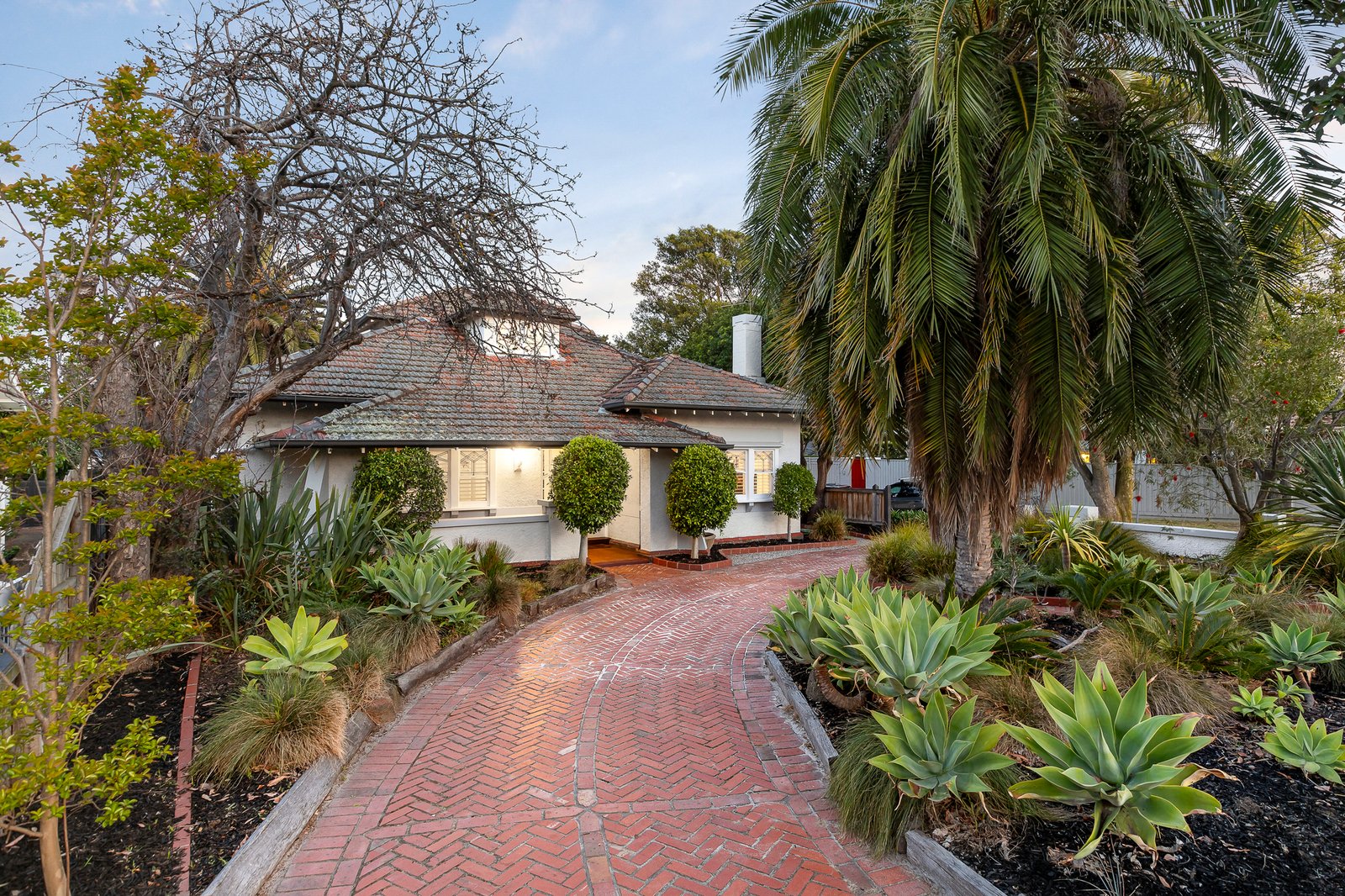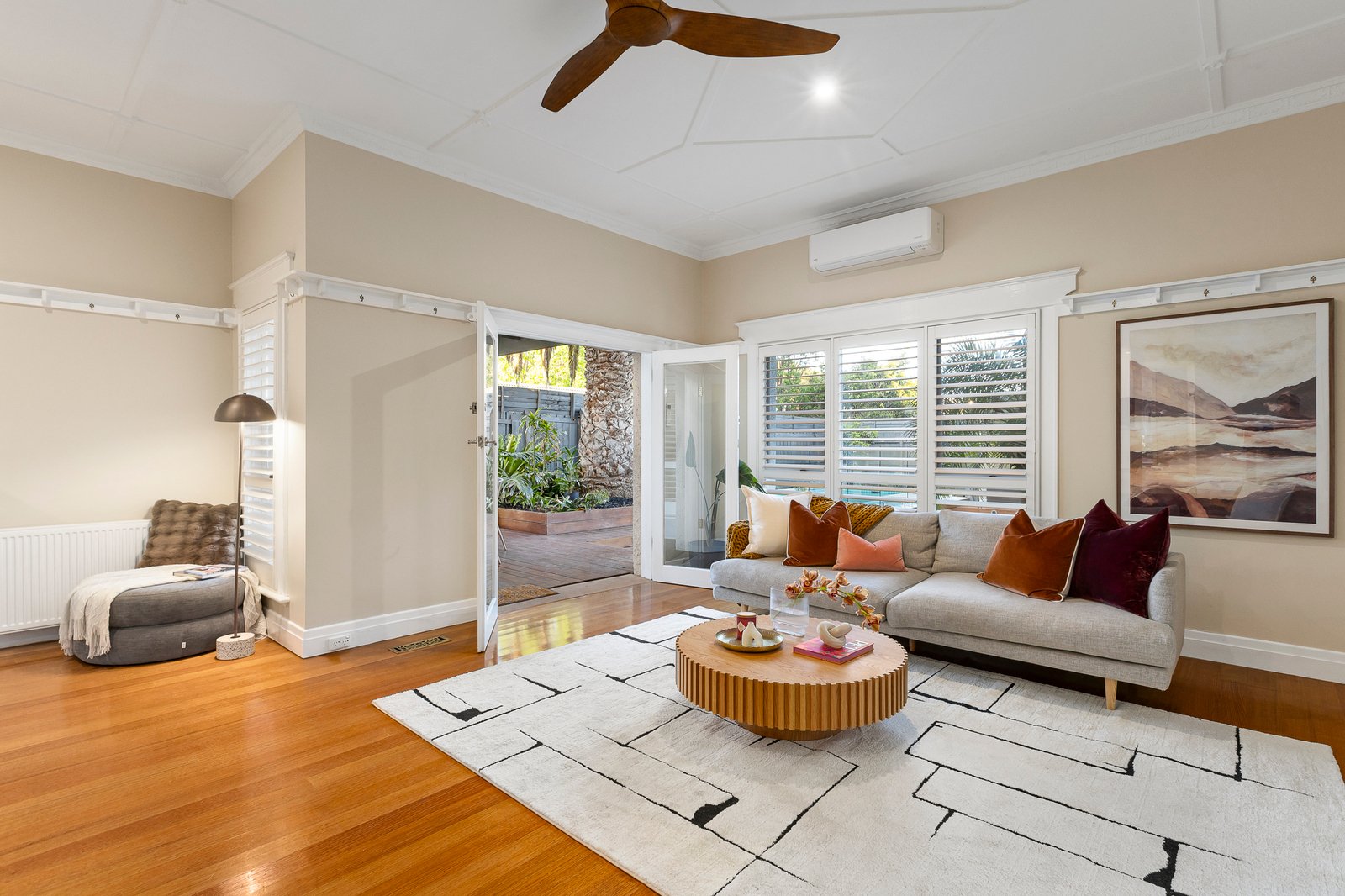 With dual driveway entrances, allowing for drive through off-street parking, and a low-water/low maintenance succulent garden centred with a majestic palm, the home’s elegant stucco clad façade is flanked by a wide, undercover verandah. A light-filled entry hall introduces the fresh neutral colour palette that enhances the original features including timber wall panelling, picture rails, ornate Art-deco plasterwork adorning soaring ceilings, and leadlight glass panelled internal doors. The front formal lounge, with plantation shuttered windows and garden outlooks has a wood fire place, while hydronic heating has been installed throughout the ground level open plan spaces floored with polished Tasmanian Oak. The upscaled stone central kitchen is defined by a custom island bench/breakfast bar and is well-equipped with a Smeg freestanding range with gas cook top, a Bosch dishwasher, and a stone-topped appliance/preparation pantry. Steps lead to the main family living area, with glass French door access to the merbau undercover alfresco deck, that edges the resort-style backyard, complete with Canary Island date palm, a gas/solar heated swimming pool and spa set in bluestone surrounds, a hot/cold outdoor shower, and a pool house/studio. Back inside, there are three pure wool carpeted bedrooms on the ground level, including the zoned main at the front of the home, with fitted walk-through robe and luxe ensuite, a guest suite adjacent to the downstairs powder/shower, and a pool-view bedroom (or study) with a built-in robe. The sumptuous loop pile carpeting continues upstairs where there are another two good-sized robed bedrooms, including one with an elevated study platform with leafy outlooks, and the third bathroom.