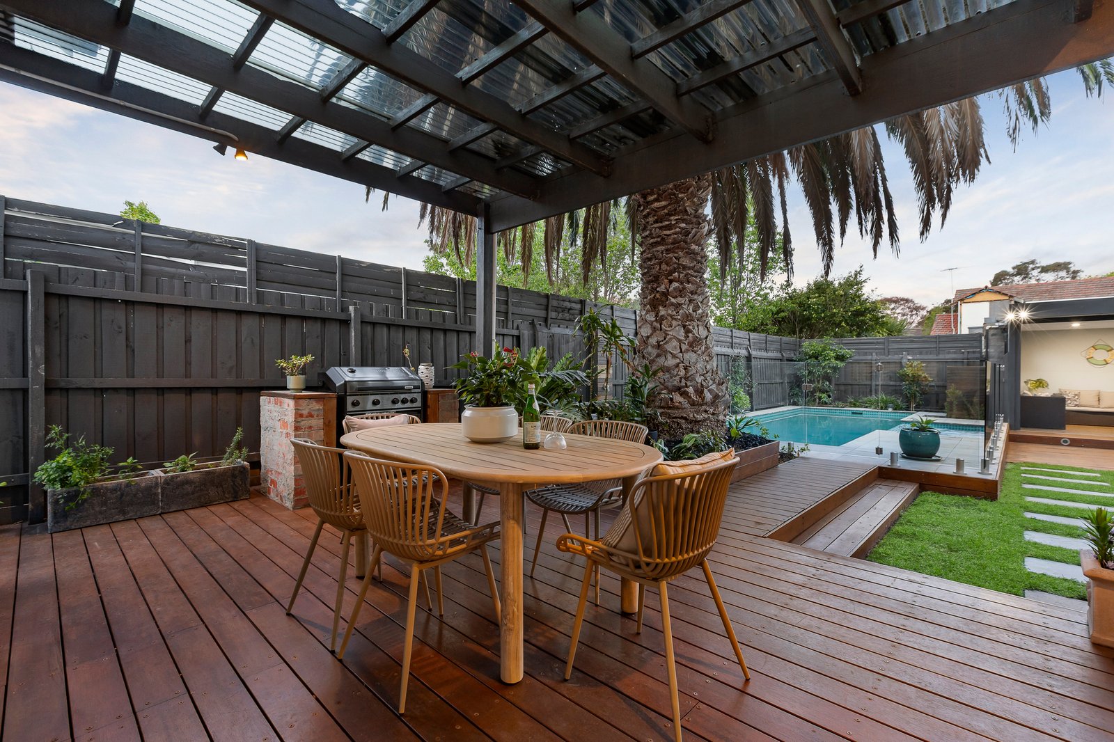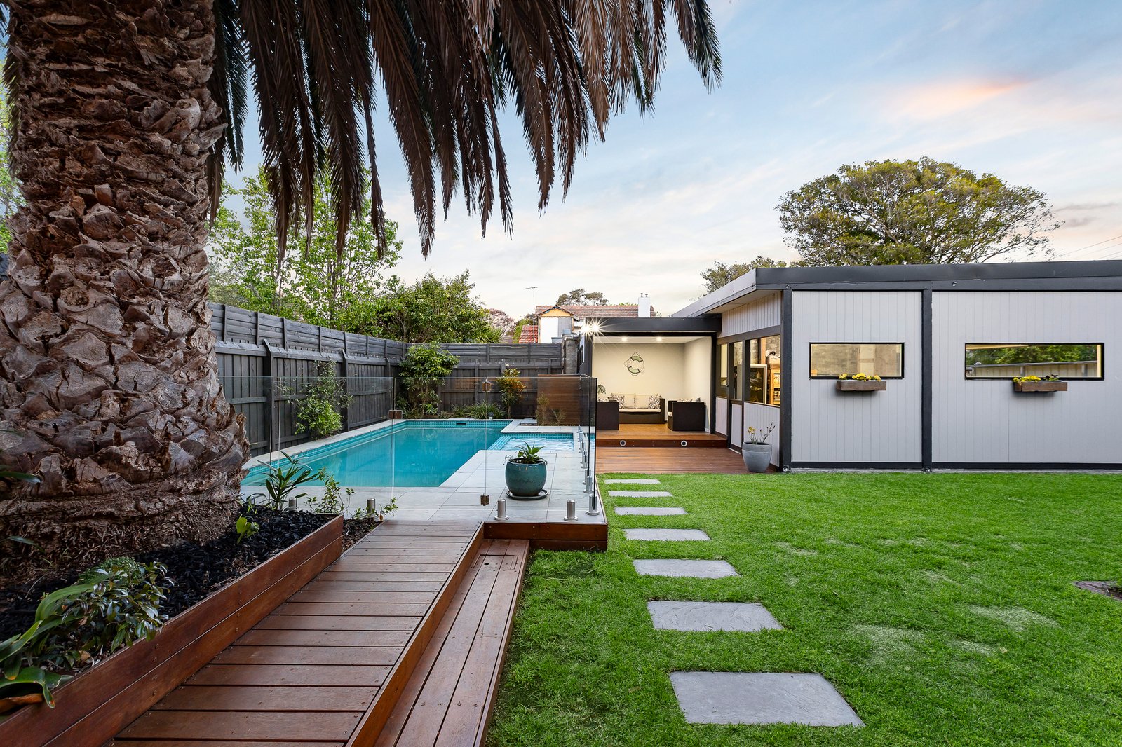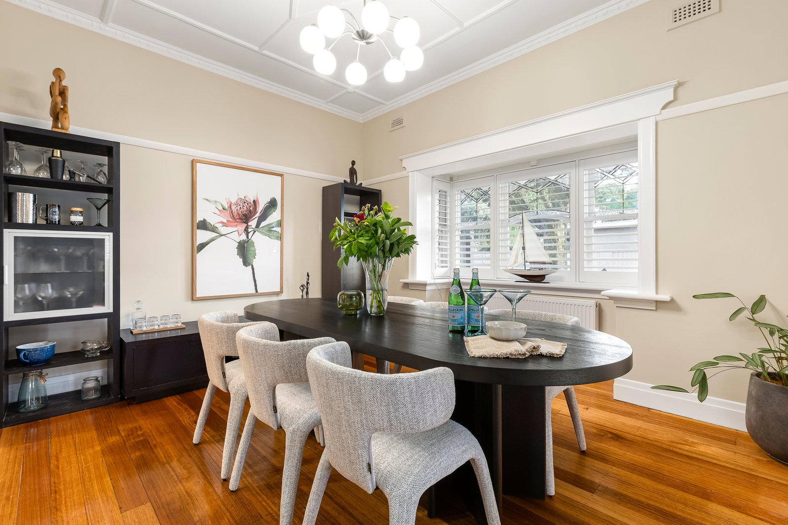 Gracing a leafy corner block in a tightly held pocket between the sands of Hampton Beach and the boutiques and eateries of Hampton Street, this circa-1930s triple brick family home is rich in California Bungalow-meets-Art Deco charm and offers an adaptable zoned five-bedroom layout, spacious formal and informal living spaces, and resort-style alfresco entertaining including a heated in-ground swimming pool/spa and a pool house.