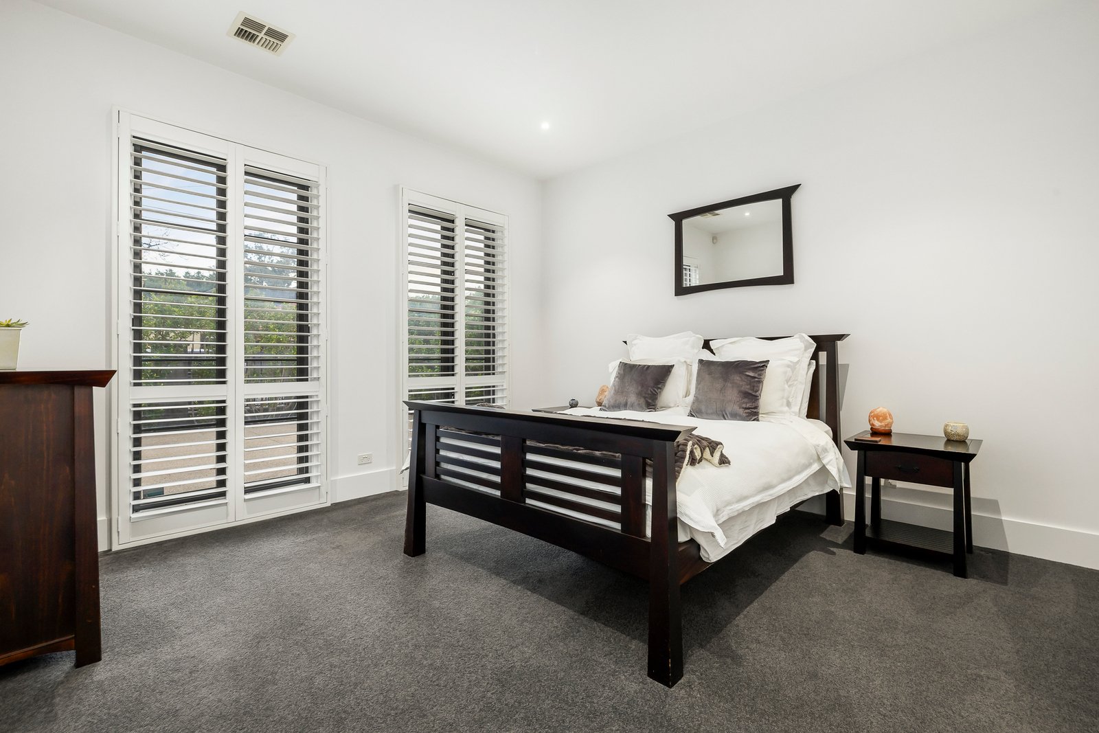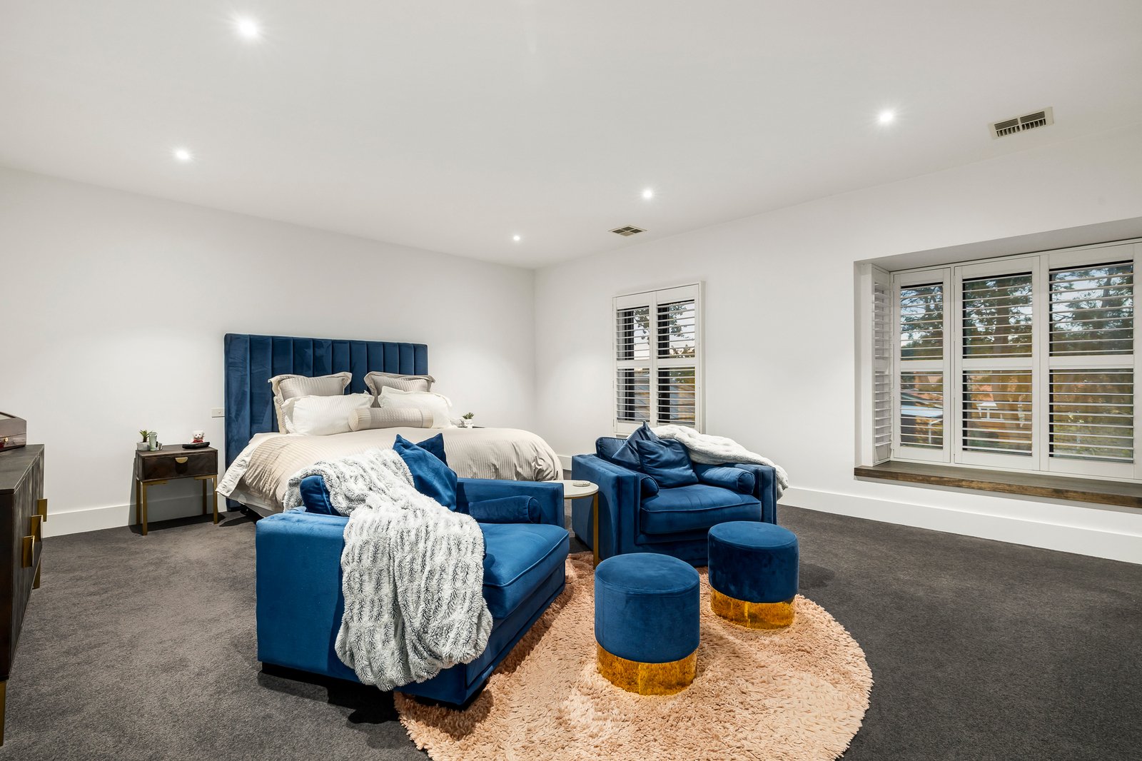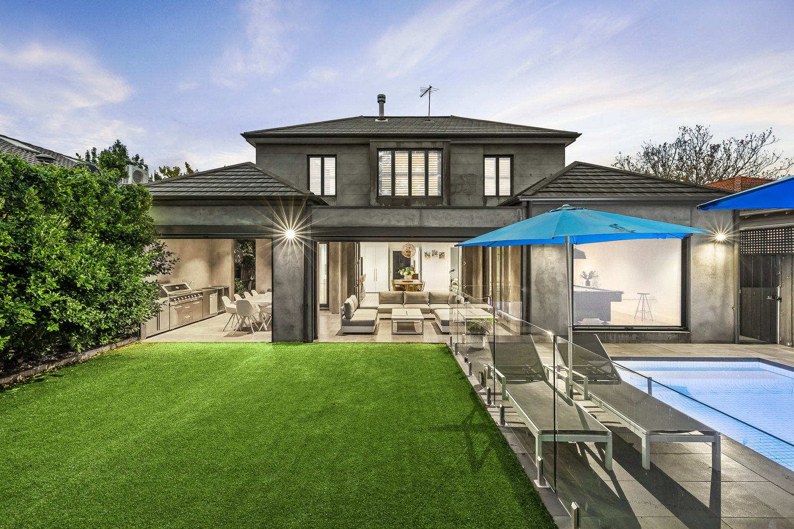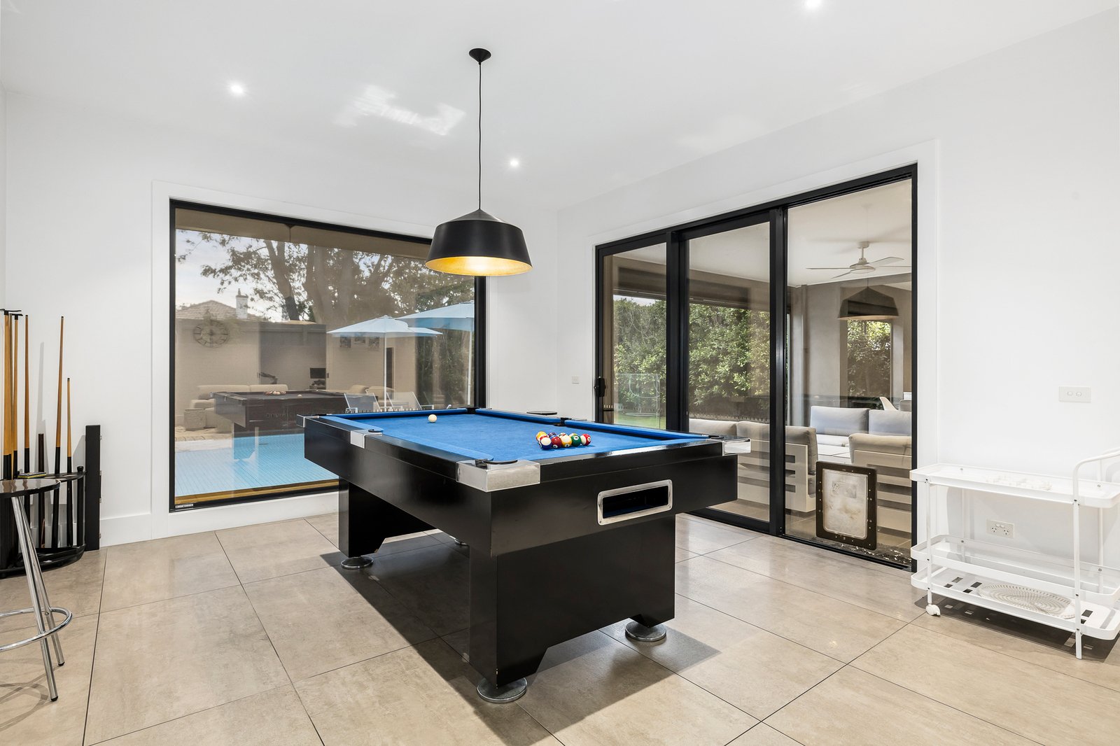 Behind the refined exterior profile, a broad central hallway featuring high ceilings and oversized porcelain tiles introduces the spectacular, sun-drenched open plan living and dining domain with a gas log fire and a billiards table wing. A versatile media/rumpus room is also perfect as a home office or formal sitting room. Designed for entertaining, the gourmet kitchen is impeccably appointed with stone benches, Smeg appliances, a built-in fridge/freezer drawer and large butler’s pantry. Bi-fold doors open the living area to a large undercover bluestone terrace with full BBQ kitchen (sink and bar fridges) and ceiling fans. Ideal for year-round outdoor living and entertaining overlooking the private leafy west-facing garden and picturesque solar heated pool. A guest bedroom with robes and a dual access bathroom is downstairs while upstairs there is the opulent oversized main bedroom with deluxe ensuite, freestanding bath and walk in robe, a third bedroom with walk in robe and ensuite, two additional bedrooms with walk in robes and a stunning 4th central bathroom.