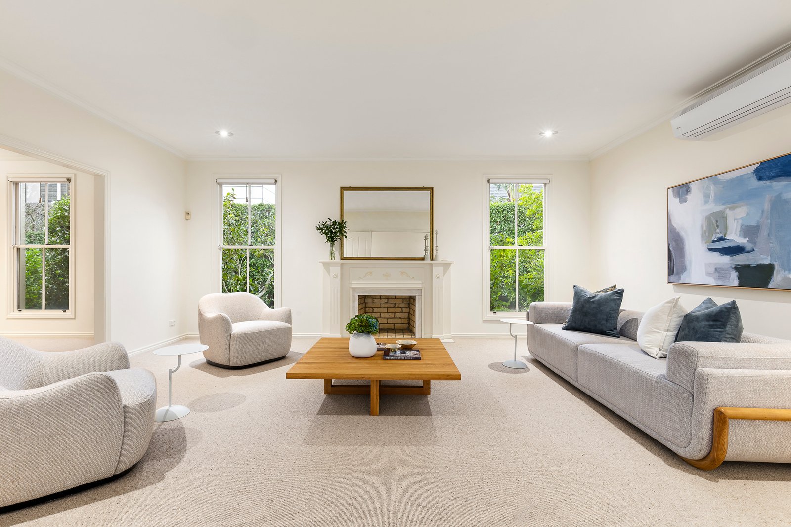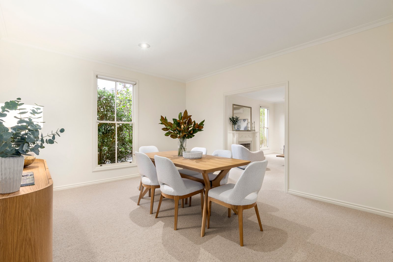 A classic rendered façade introduces a spacious, light-filled interior defined by soft neutral tones and a thoughtfully designed floor plan. A generous north-facing sitting room flows seamlessly to an adjoining dining area, while accommodation is intelligently zoned to offer flexibility with three bedrooms or two plus a home office. The main bedroom, positioned at the front, features a walk-in robe, ensuite, and private courtyard access. Two additional bedrooms at the rear are serviced by a central bathroom and separate laundry.
