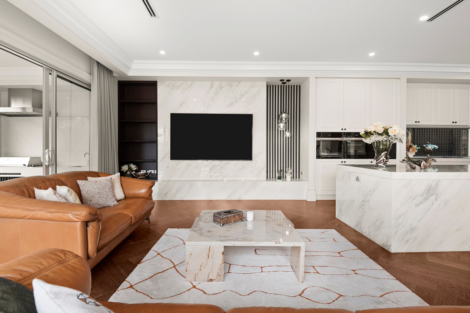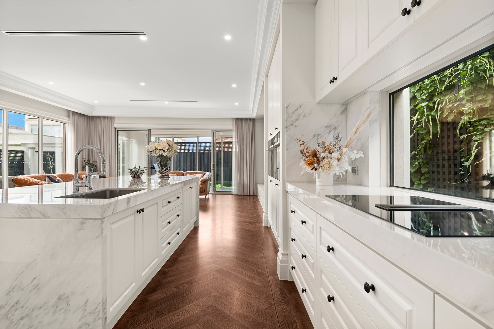Three expansive living zones with elegant parquetry flooring provide flexibility for both formal and everyday living, while a prized north-facing orientation fills multiple living areas and four bedrooms with natural light.