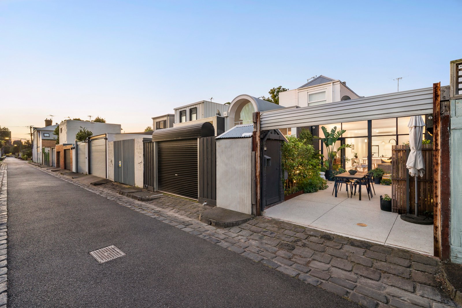 Featuring secure off-street parking via ROW, it invites brilliant light into its generous single-level interior, where ease of living meets private al-fresco appeal. The large kitchen, finished with timber benchtops and high-quality stainless steel appliances, draws natural light from the red-brick paved light-well and a conservatory-style ceiling, while hardwood floors enhance the warmth of the open-plan living and dining areas that flow into a sunny landscaped garden courtyard. Established citrus trees, lush ground cover, ivy, and herbs create a verdant backdrop to this inviting outdoor domain, complemented by an additional WC and ample space for one car.