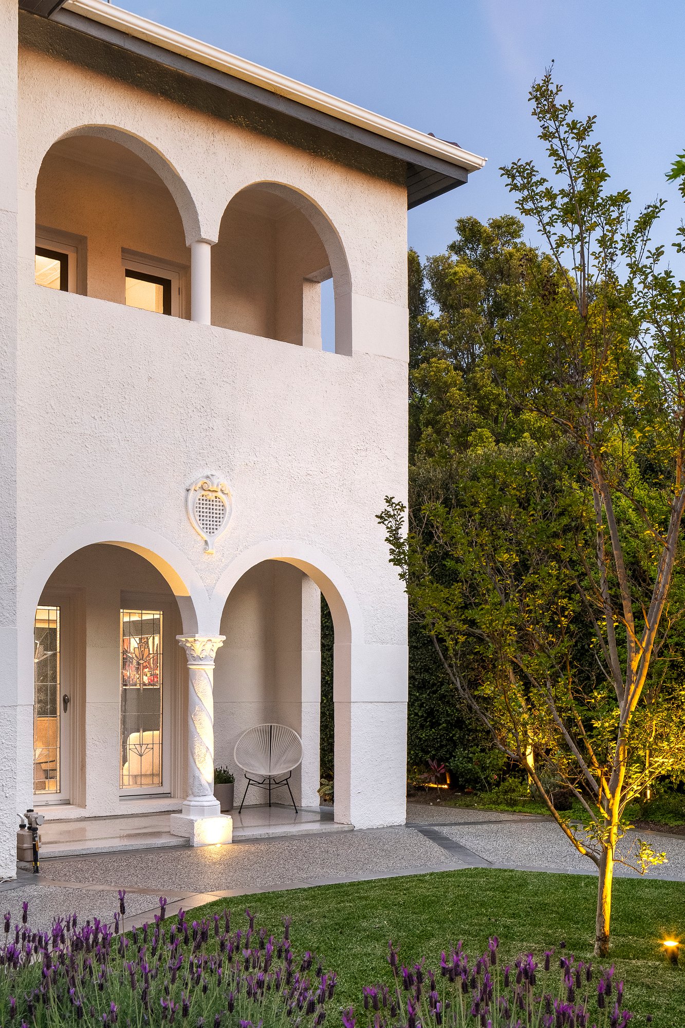 Securely set behind high walls and automated gates, the distinctive façade of the stucco-rendered double-storey home is resplendent with arched balconies, parapets and an arcade entry verandah centred with an ornate column. Inside the glamour continues with a bespoke arched timber entry door opening to a marble tiled foyer, illuminated with leadlight windows, and showcasing a marble staircase with ornate ironwork balustrade. Architecturally renovated, the expansive polished hardwood ground floor living areas celebrate indoor/outdoor liveability with expanses of glass drawing in northerly light and providing visual and physical connectivity to the gardens and alfresco entertaining spaces. Centrally positioned and incorporating a full-width servery window to the undercover alfresco dining area, the gourmet custom kitchen is equally suited for relaxed family gatherings or impressive entertaining with a large-scale island/breakfast bar, dual Miele multi-function ovens, a Bosch induction cooktop, integrated Fisher & Paykel fridge/freezer, and integrated dishwasher. There is a formal lounge in the front section of the home, rich in Art Deco features, a guest bedroom with built-in robes, and an adjacent luxe bathroom, while the designer laundry is custom fitted with pull-out drying racks and has an external access door. Upstairs, the palatially proportioned master suite has a broad private balcony, with verdant treetop outlooks offering city skyline glimpses, a boutique-sized dressing room/walk-through robe and an intricately tiled double-vanity ensuite. There is also a customised fitted study, three further bespoke bedrooms including two with access to the arched, semi-enclosed upper-level balcony, and the fully tiled main bathroom, with built-in tub.