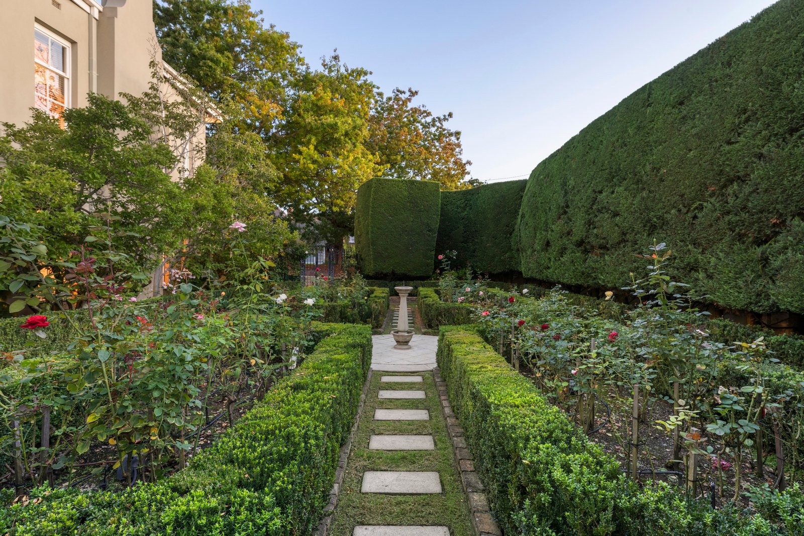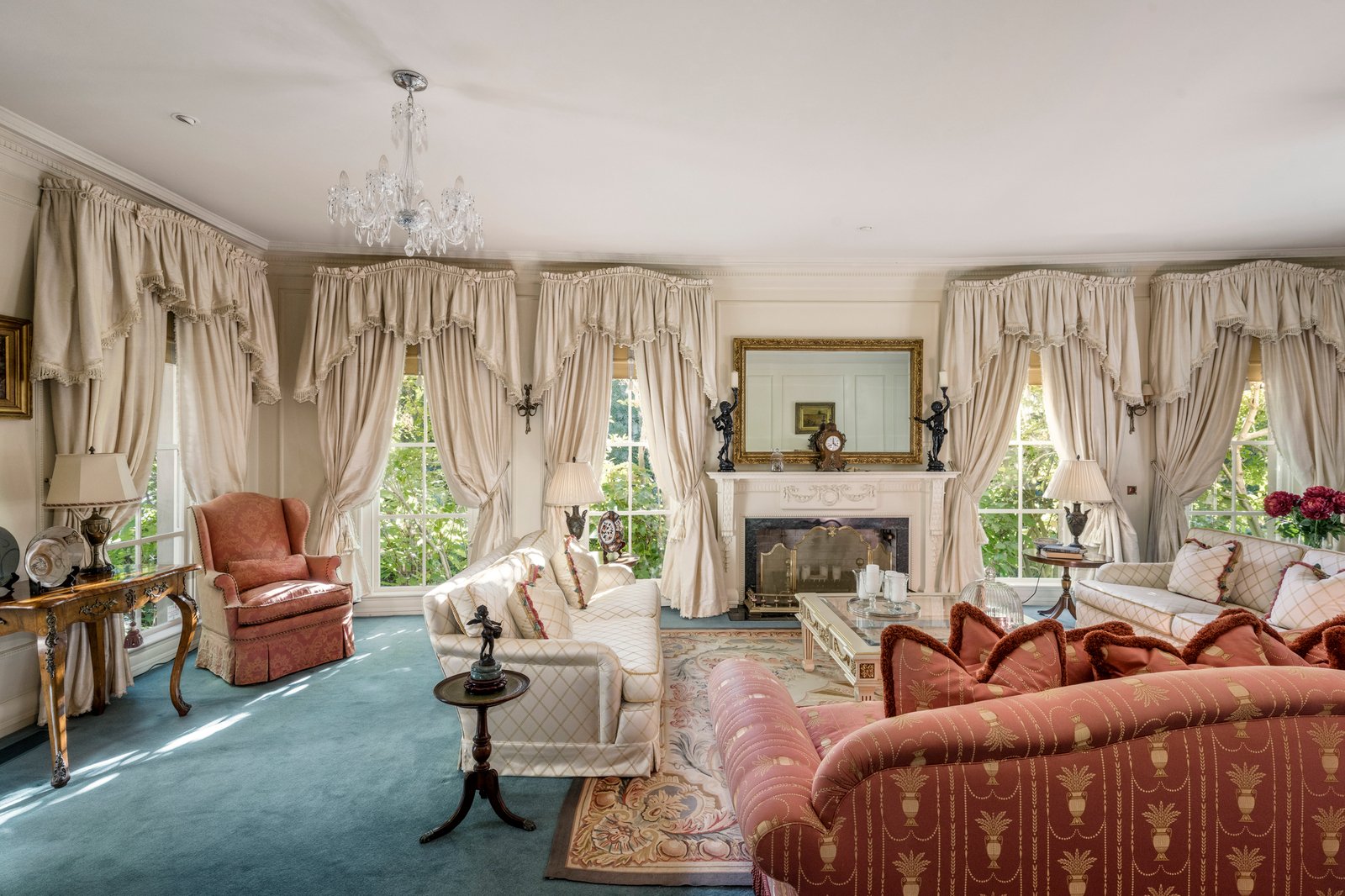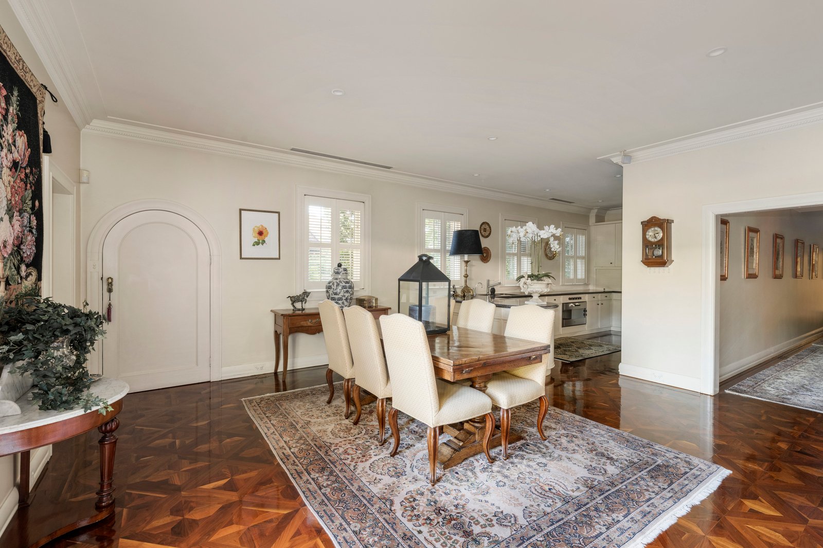 A central foyer and theatrical staircase introduce a series of beautifully resolved rooms, including a formal sitting room with an open fireplace extending to a north-facing terrace and rose garden, and a separate dining room overlooking the front garden. Parquet floors continue through a well-appointed kitchen with black granite surfaces, Gaggenau appliances and integrated refrigeration, before moving to more relaxed living and dining zones with a gas fireplace and French doors opening to the sunlit rear garden and al-fresco terrace. A fully equipped gym with marble bathroom, or potential fifth bedroom, follows through the sun-drenched gallery hall, with an executive office/bedroom, and an additional ground-floor ensuite bedroom, strengthening the home’s versatility.