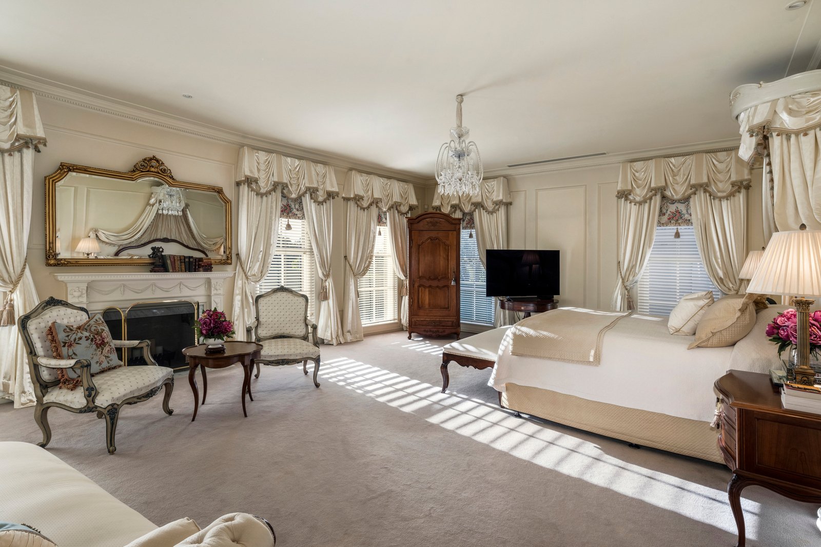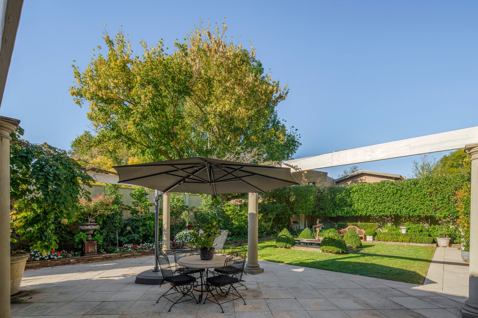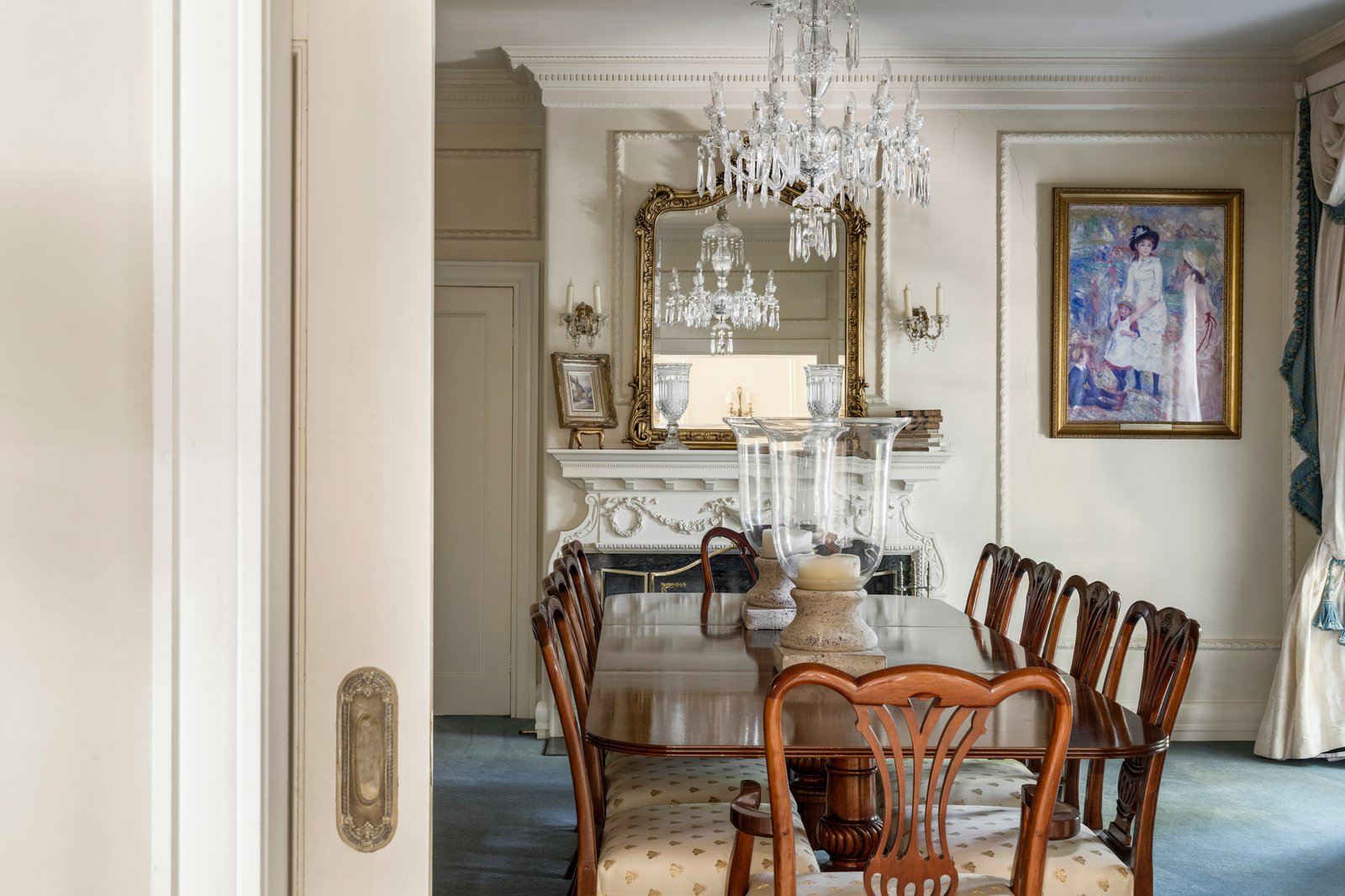 A central foyer and theatrical staircase introduce a series of beautifully resolved rooms, including a formal sitting room with an open fireplace extending to a north-facing terrace and rose garden, and a separate dining room overlooking the front garden. Parquet floors continue through a well-appointed kitchen with black granite surfaces, Gaggenau appliances and integrated refrigeration, before moving to more relaxed living and dining zones with a gas fireplace and French doors opening to the sunlit rear garden and al-fresco terrace. A fully equipped gym with marble bathroom, or potential fifth bedroom, follows through the sun-drenched gallery hall, with an executive office/bedroom, and an additional ground-floor ensuite bedroom, strengthening the home’s versatility.
