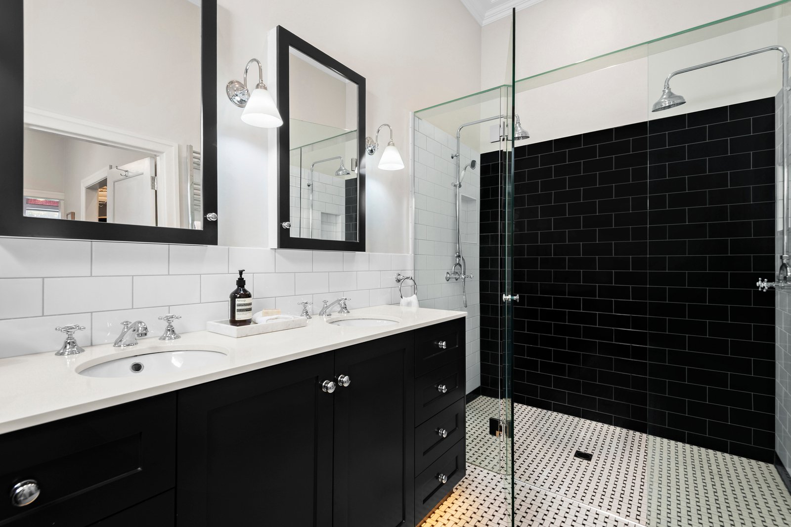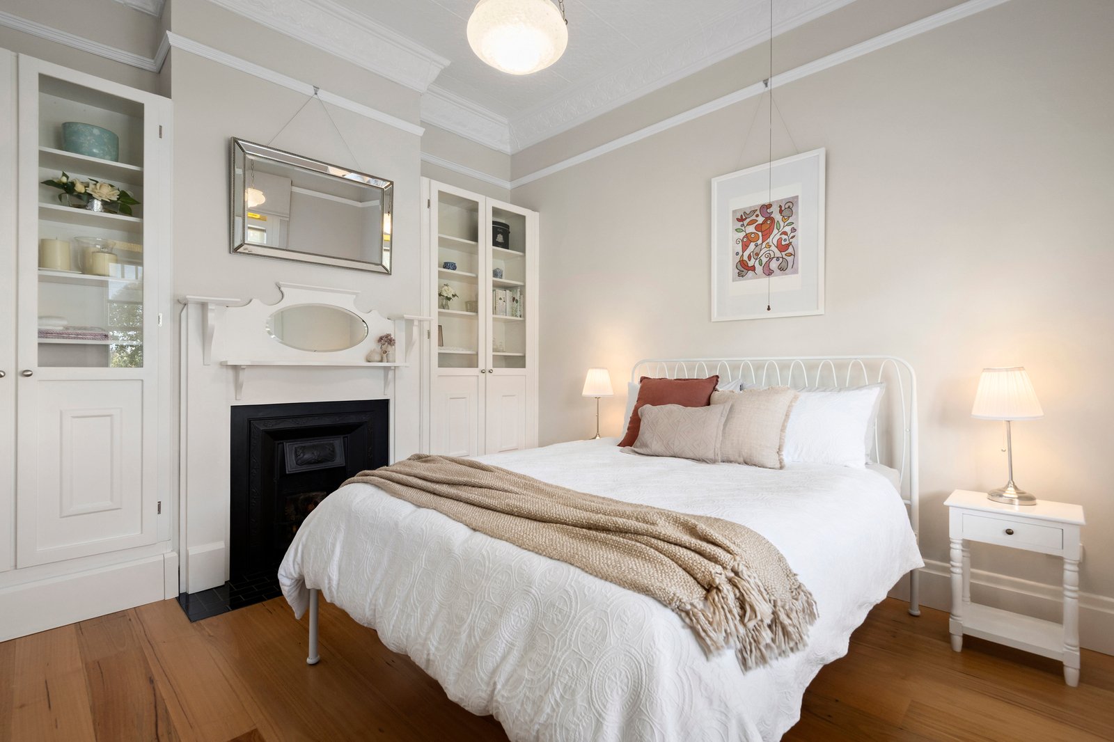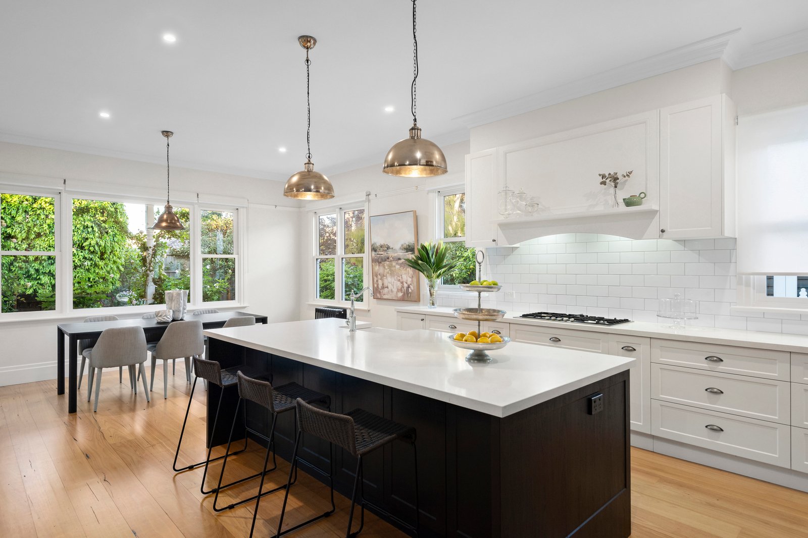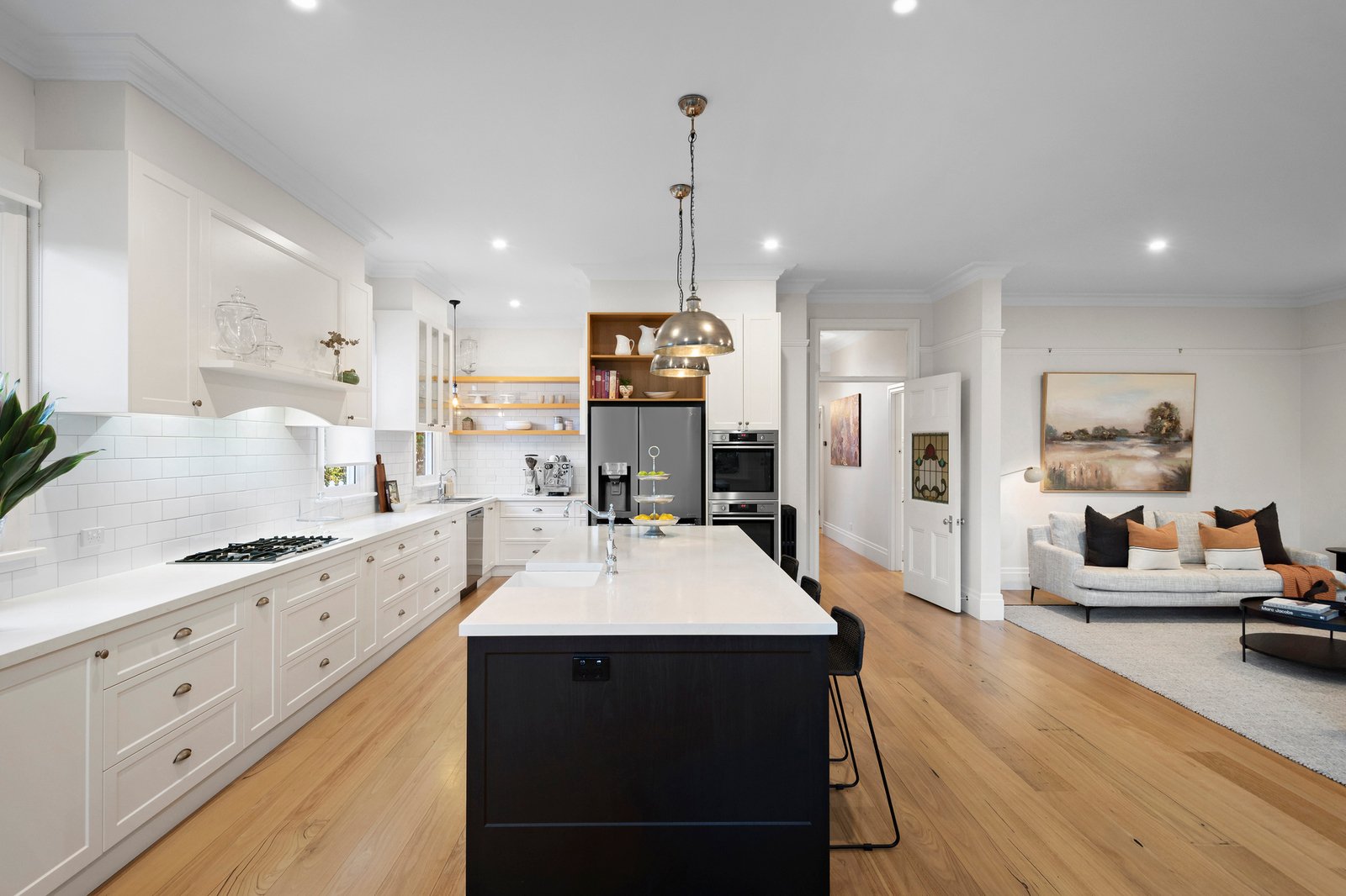Beyond its enchanting façade, soaring ceilings and leadlight windows, the home unfolds to reveal an expansive light-filled open-plan rear where the best of contemporary living is infused with old world character. Organised around vast stone-topped benches and appointed with premium stainless steel appliances, the kitchen caters to gourmet cooking with a Butler’s Pantry and is classically stylish with subway-tiling and a farmhouse sink. Double doors extend the open-plan to an undercover deck and paved outdoor living where the northern sun is glorious.