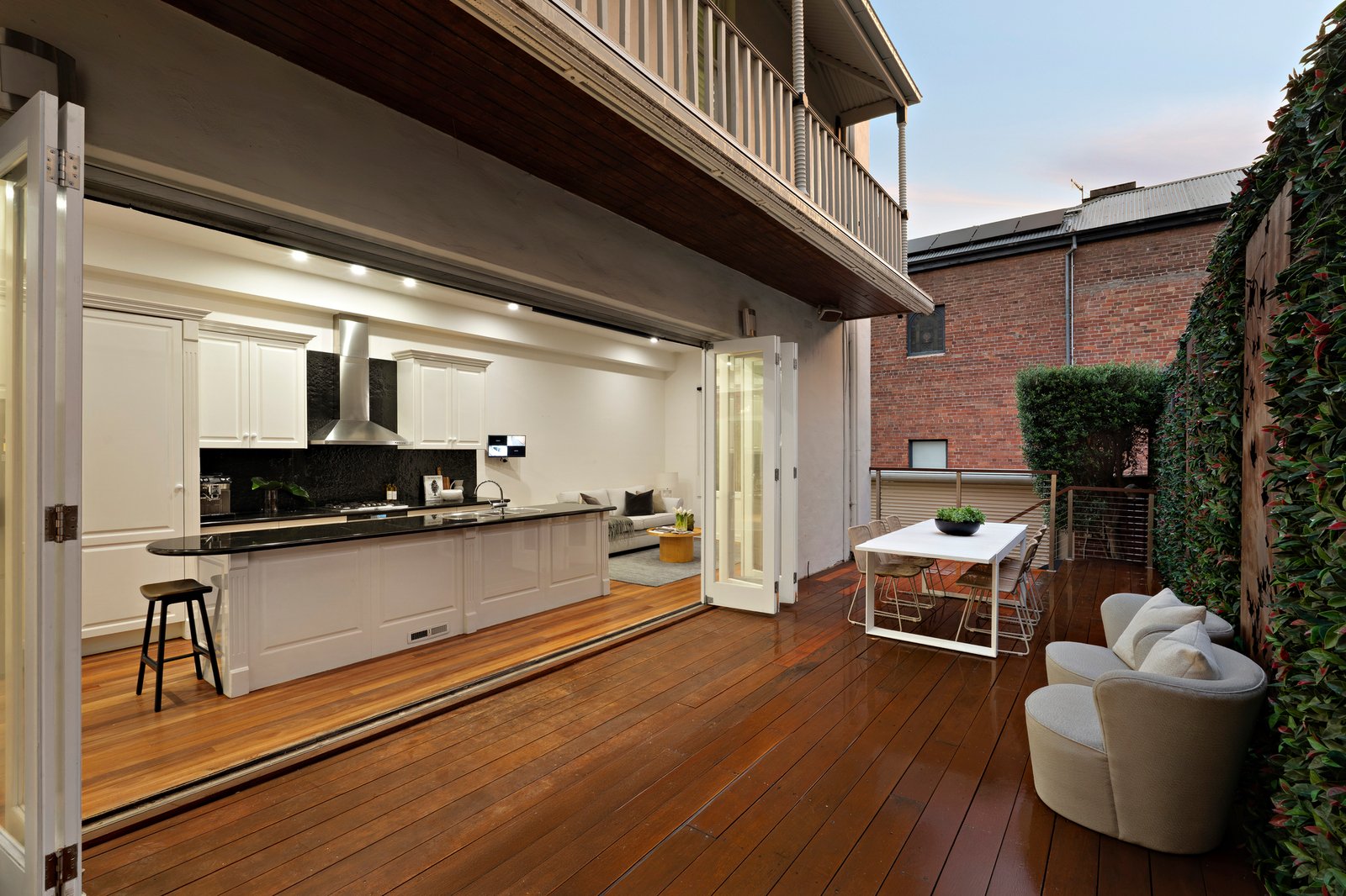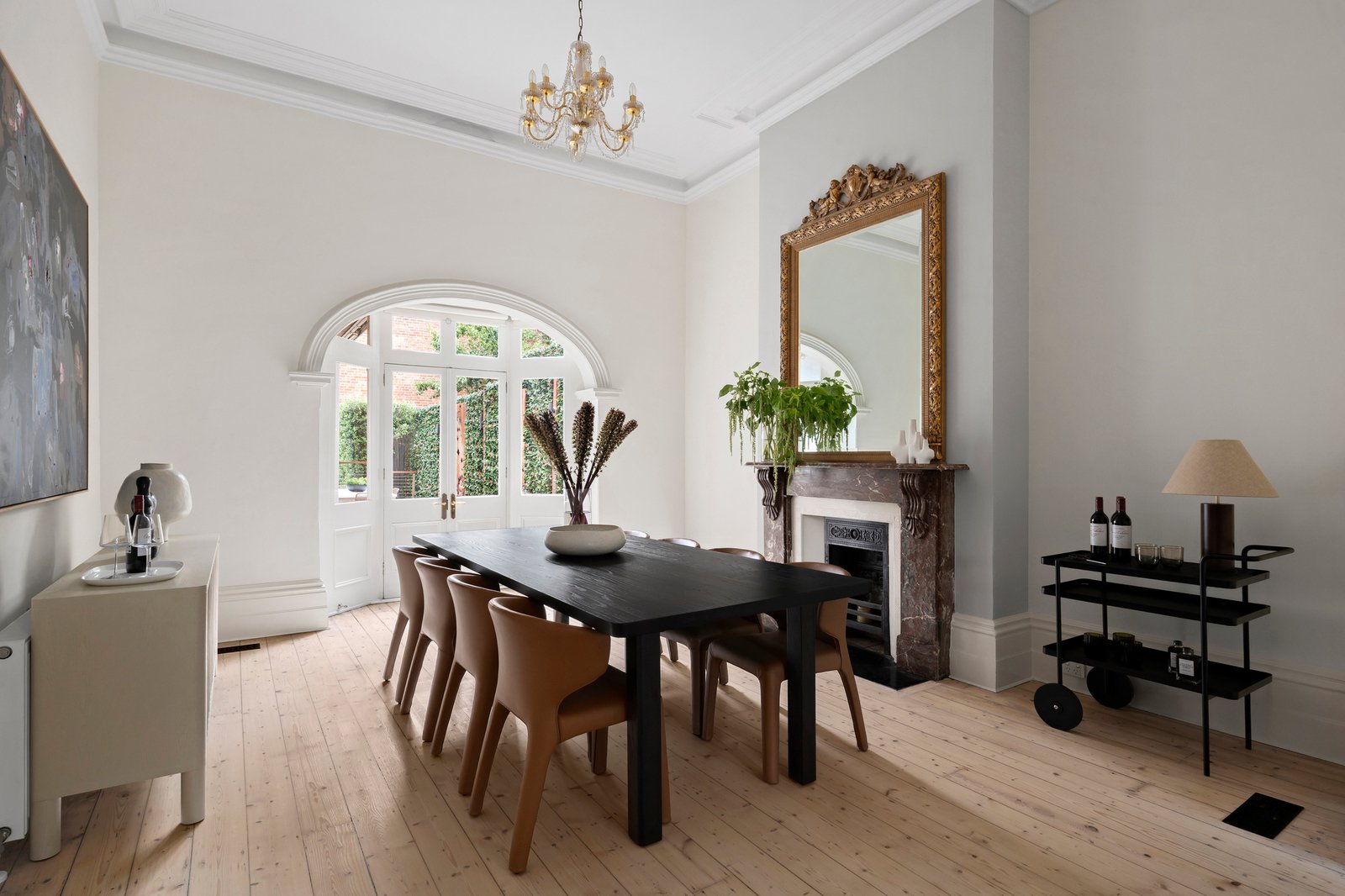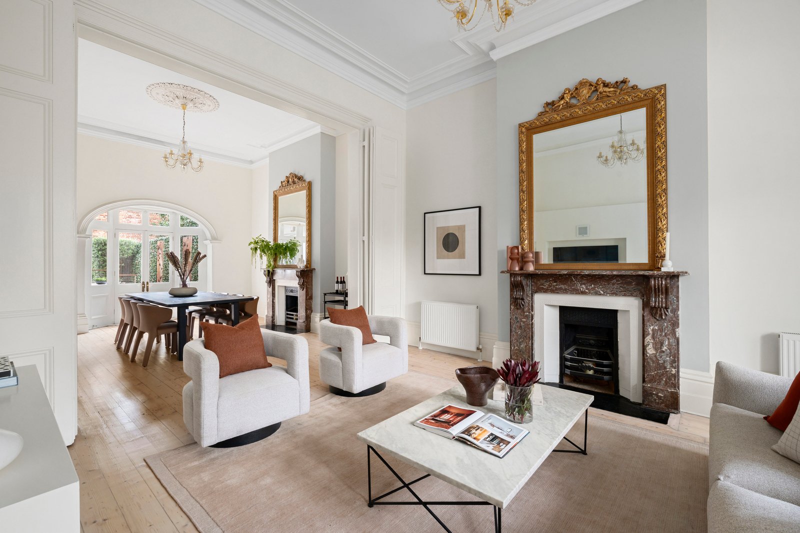 Interiors are replete with period beauty, with a wide, corbel-arched entry hall enriched by lime-washed Baltic pine floors, marble fireplaces, and towering ceilings. Grand formal sitting and dining rooms are each defined by large bay windows and marble open fireplaces, with central bi-fold doors affording separation or connection as required, while French doors extend the dining room to a side deck for outdoor use. To the rear, modern-day needs expand casual family zones to the sun-drenched decked garden, supported by a stone-finished kitchen with stainless steel appliances and generous preparation space, allowing the layout to shift easily between areas for al-fresco dining.