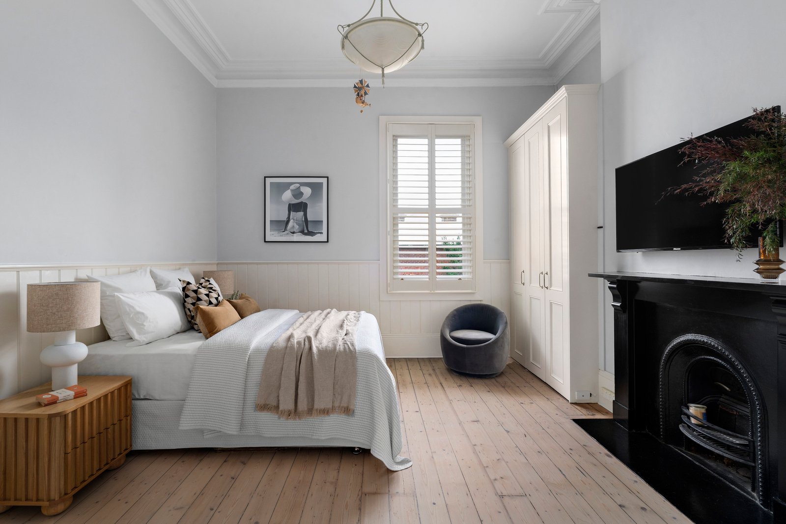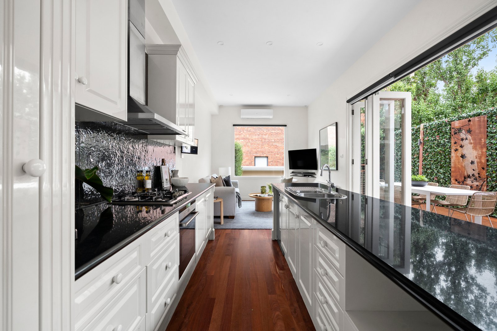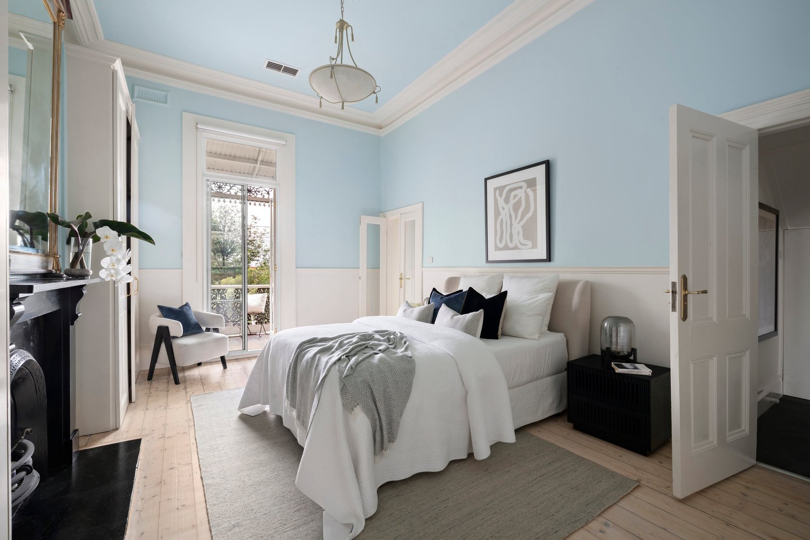Interiors are replete with period beauty, with a wide, corbel-arched entry hall enriched by lime-washed Baltic pine floors, marble fireplaces, and towering ceilings. Grand formal sitting and dining rooms are each defined by large bay windows and marble open fireplaces, with central bi-fold doors affording separation or connection as required, while French doors extend the dining room to a side deck for outdoor use. To the rear, modern-day needs expand casual family zones to the sun-drenched decked garden, supported by a stone-finished kitchen with stainless steel appliances and generous preparation space, allowing the layout to shift easily between areas for al-fresco dining.