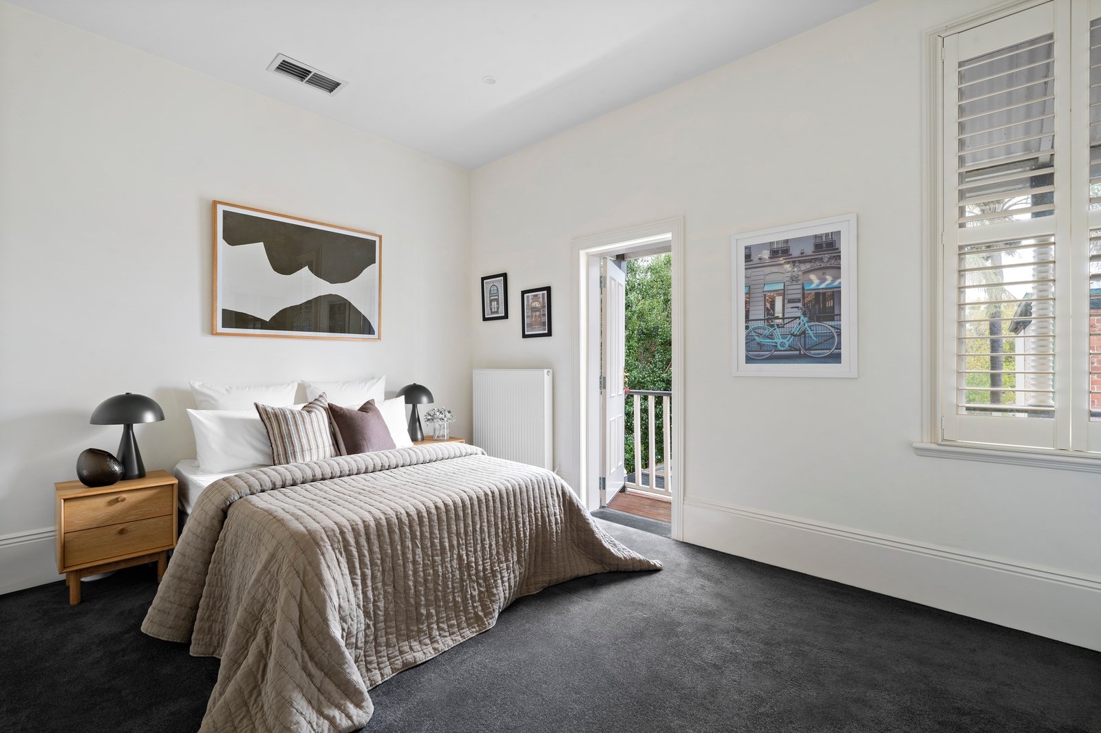 Upper-level accommodation is arranged across multiple zones, led by a main bedroom of substantial size with balcony access, walk-in robe and ensuite, and enhanced by double glazing for added peace and thermal efficiency. Additional bedrooms retain fireplaces and built-in robes, including one with its own balcony, while a flexible top-floor living area or fourth bedroom incorporates integrated storage and a wet bar, positioned to take in sweeping city skyline views with glimpses of the bay to the south. Complete with hydronic heating, reverse-cycle air conditioning, an extensive underground cellar, alarm and camera security, and secure vehicle access via ROW, it delivers a peerless lifestyle amongst the area’s finest, with Albert Park Village, the foreshore, trams and leading schools all within walking distance.