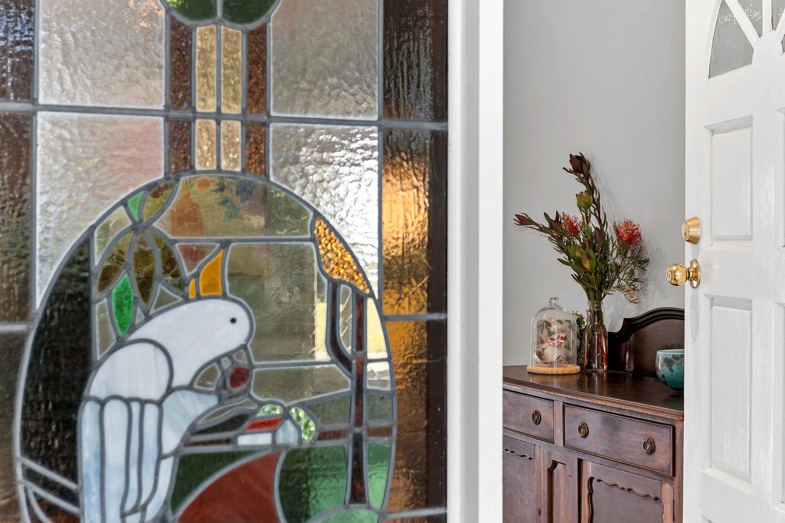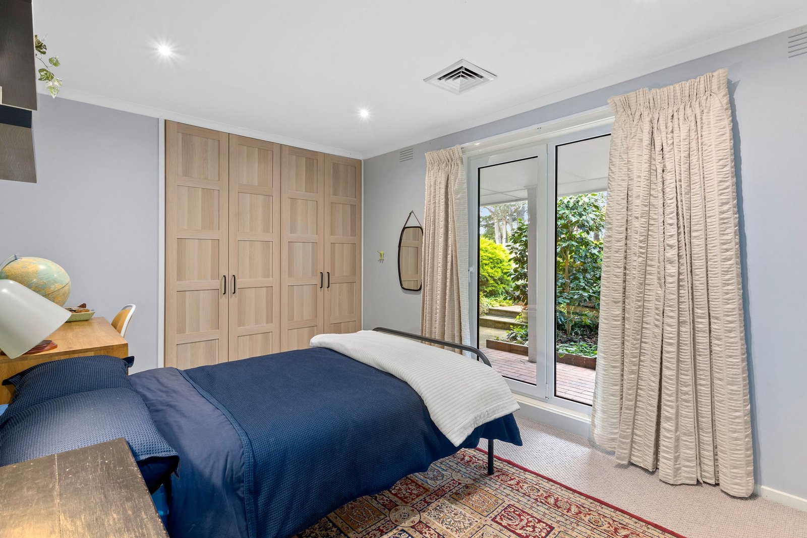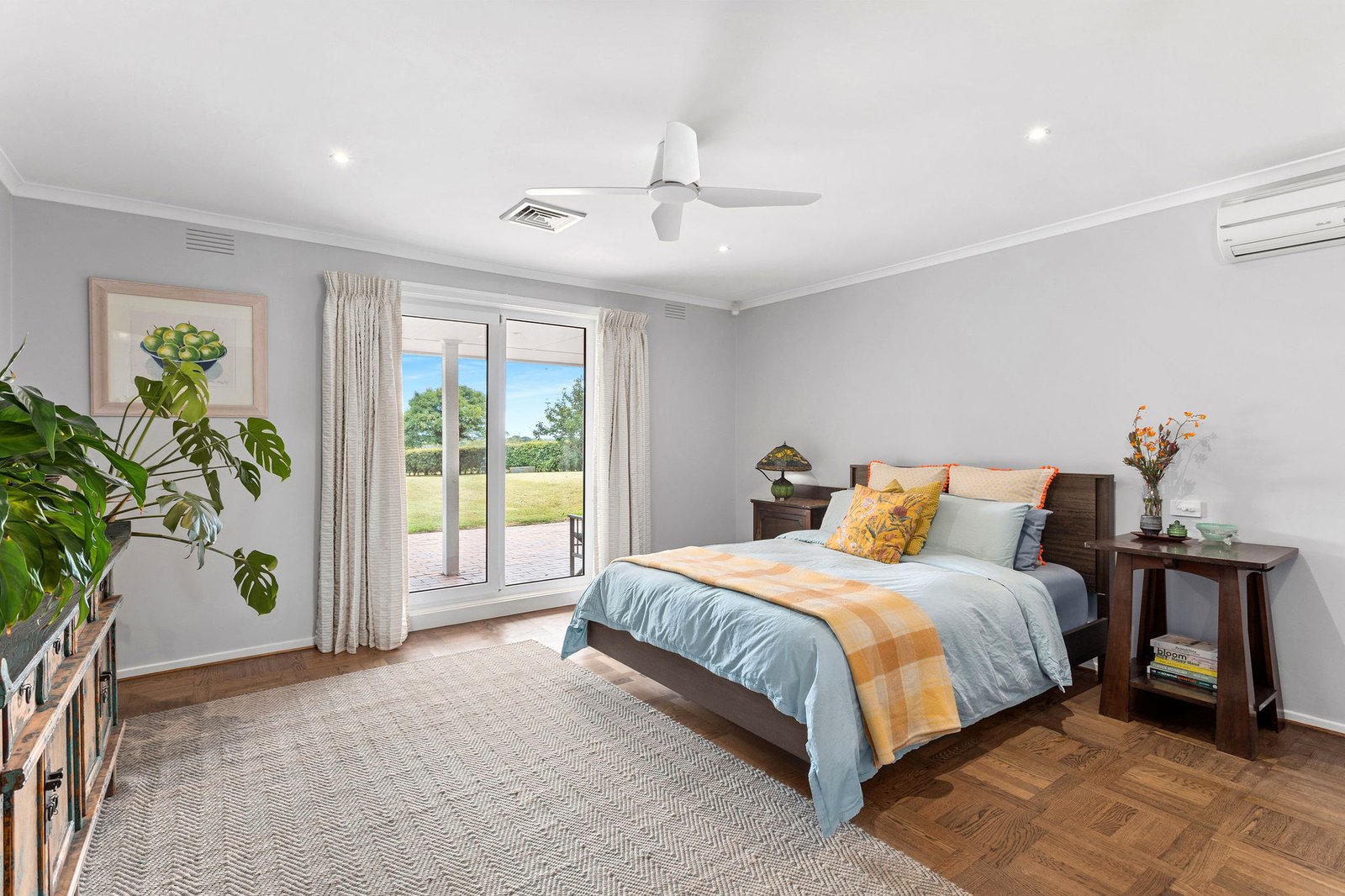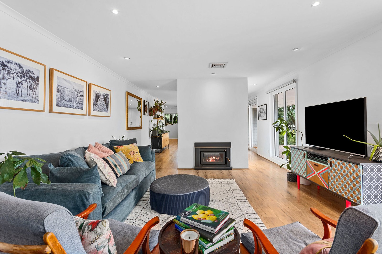 Exquisitely appointed, the designer’s-own home sits behind tall cypress trees amid parklike gardens with fruit and nut trees. Awash in radiant north-facing light, the spacious interconnected living and dining zones with elegant engineered-oak flooring are divided by a toasty two-way wood-burning fireboxes. With a newly installed ducted heating and cooling system, all-season comfort is ensured.