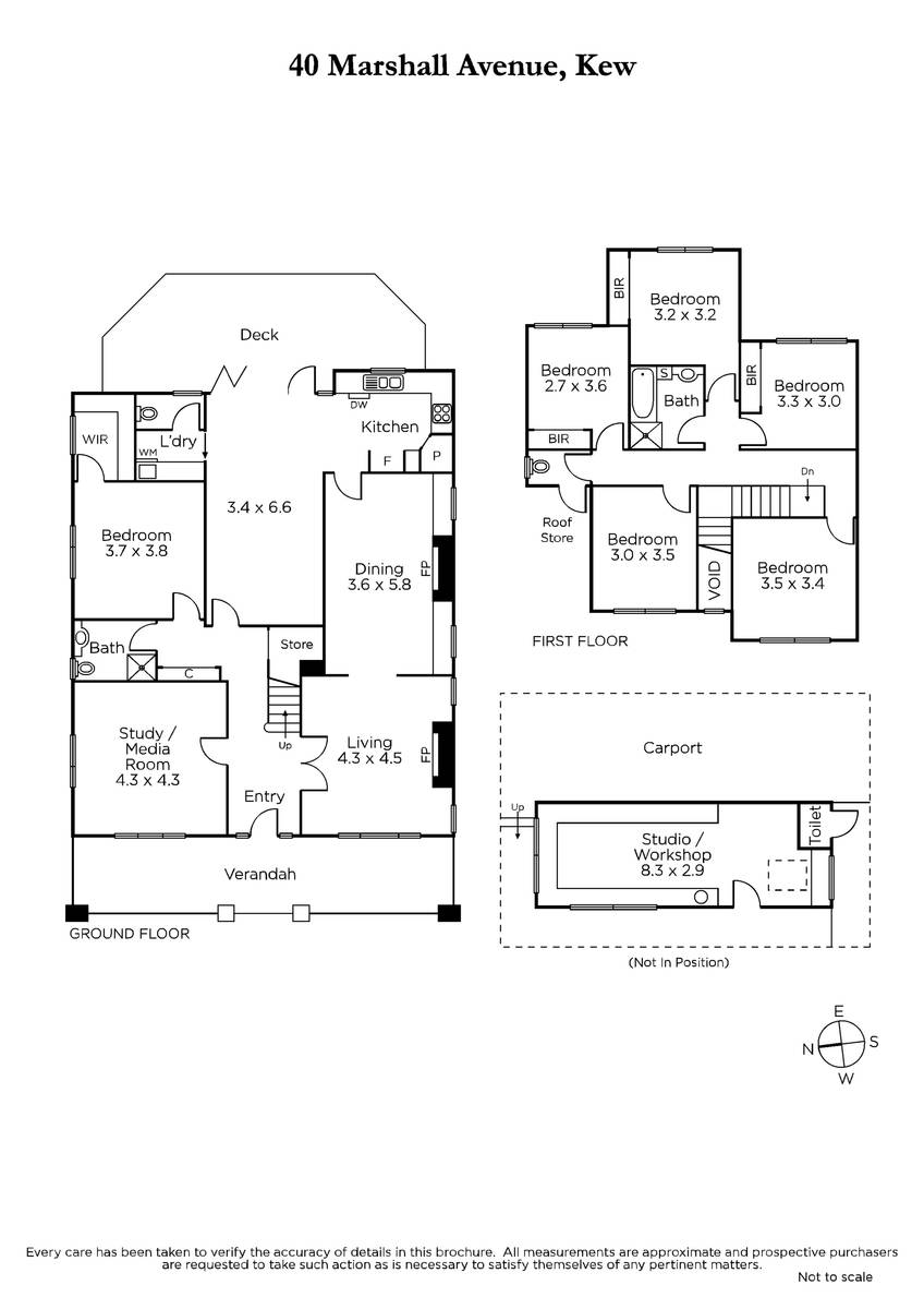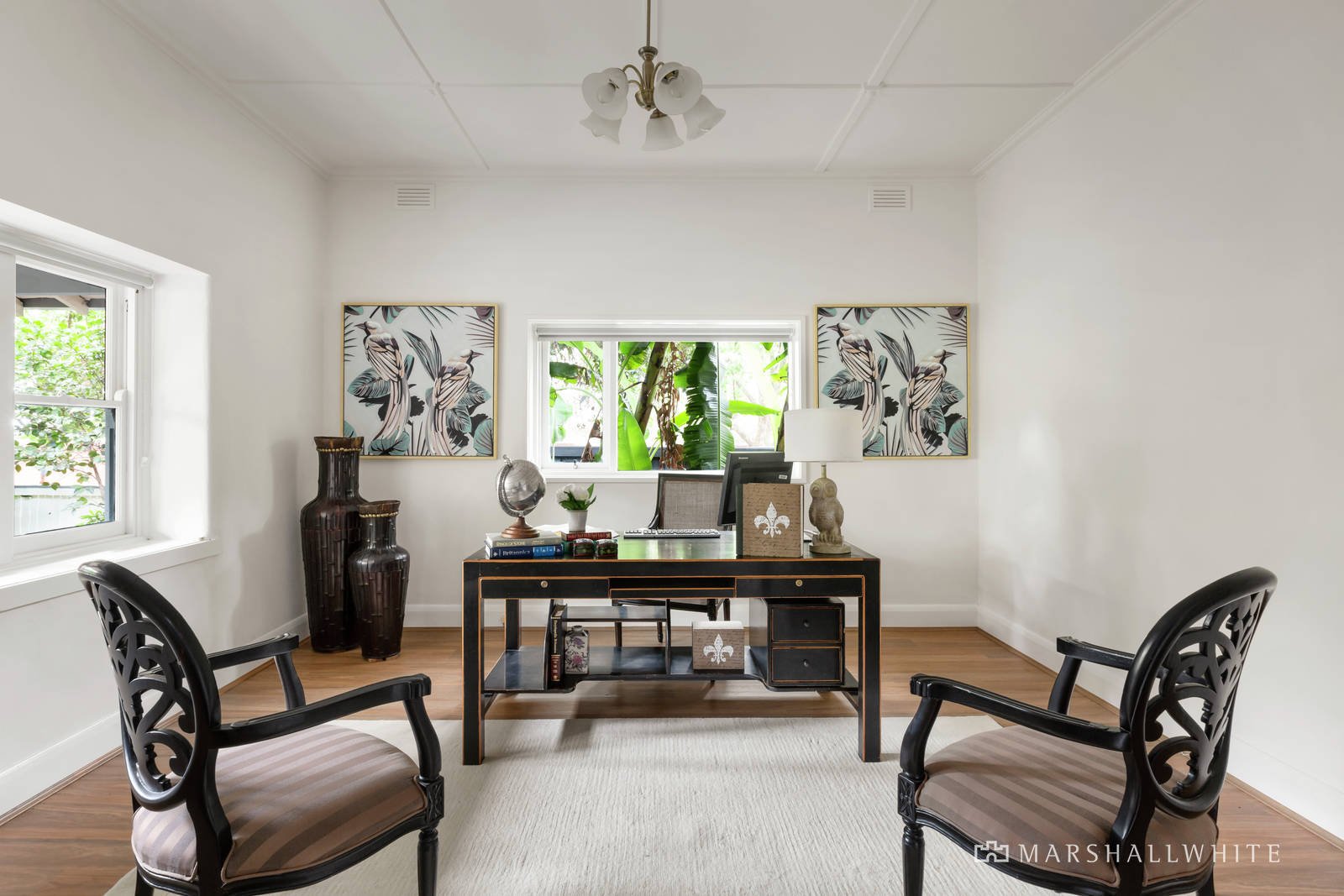 A broad verandah introduces a central entrance hall, elegant sitting room with gas log fire, a generous formal dining room with gas log fire and a versatile home office or media room, all boasting ornate ceilings and leadlight windows. Natural light streams through the expansive open plan living and dining room with a gourmet kitchen appointed with Miele/Asko appliances and stone benches. The living space opens out to a deep private northeast garden, a large freestanding studio or workshop and secure carport accessed from Parkhill Rd. The main bedroom with walk in robe is peacefully positioned downstairs alongside a fully tiled bright bathroom while a sensational children's zone upstairs comprises four additional bedrooms with built in robes, a retreat or 6th bedroom and a stylish bathroom.