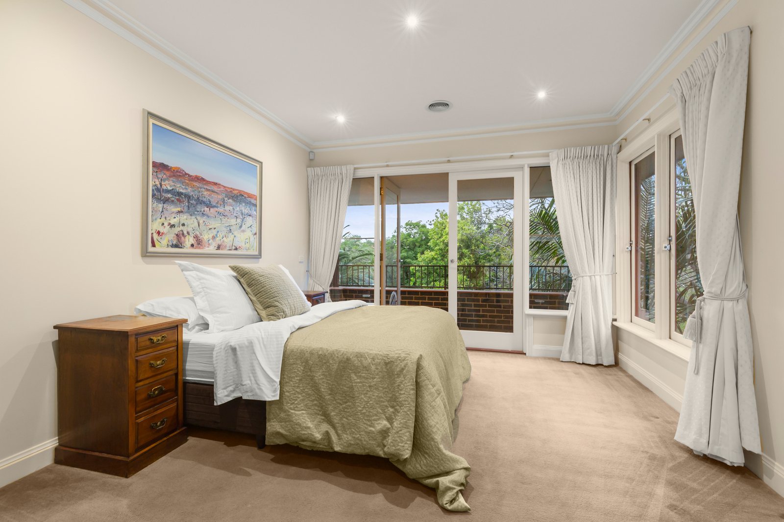 Generous accommodations include a secluded main suite with a serene treetop balcony offering scenic vistas, walk-in and built-in robes, and a luxurious spa ensuite. Two additional upper-level bedrooms share a family bathroom with tub, enclosed shower and dual vanity, while a spacious study - or fifth bedroom - ground-floor guest bedroom and two powder rooms enhance the home’s versatility. Below, a substantial laundry, wine cellar and multiple storerooms ensure excellent functionality. Premium features include ducted heating/cooling, Spotted Gum timber floors, high ceilings, plantation shutters, and external workshop space. On-site parking is available for up to nine cars, including a rear triple garage with turning circle capacity and a separate front garage.