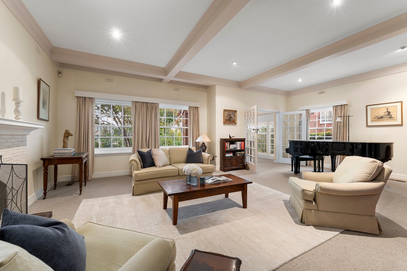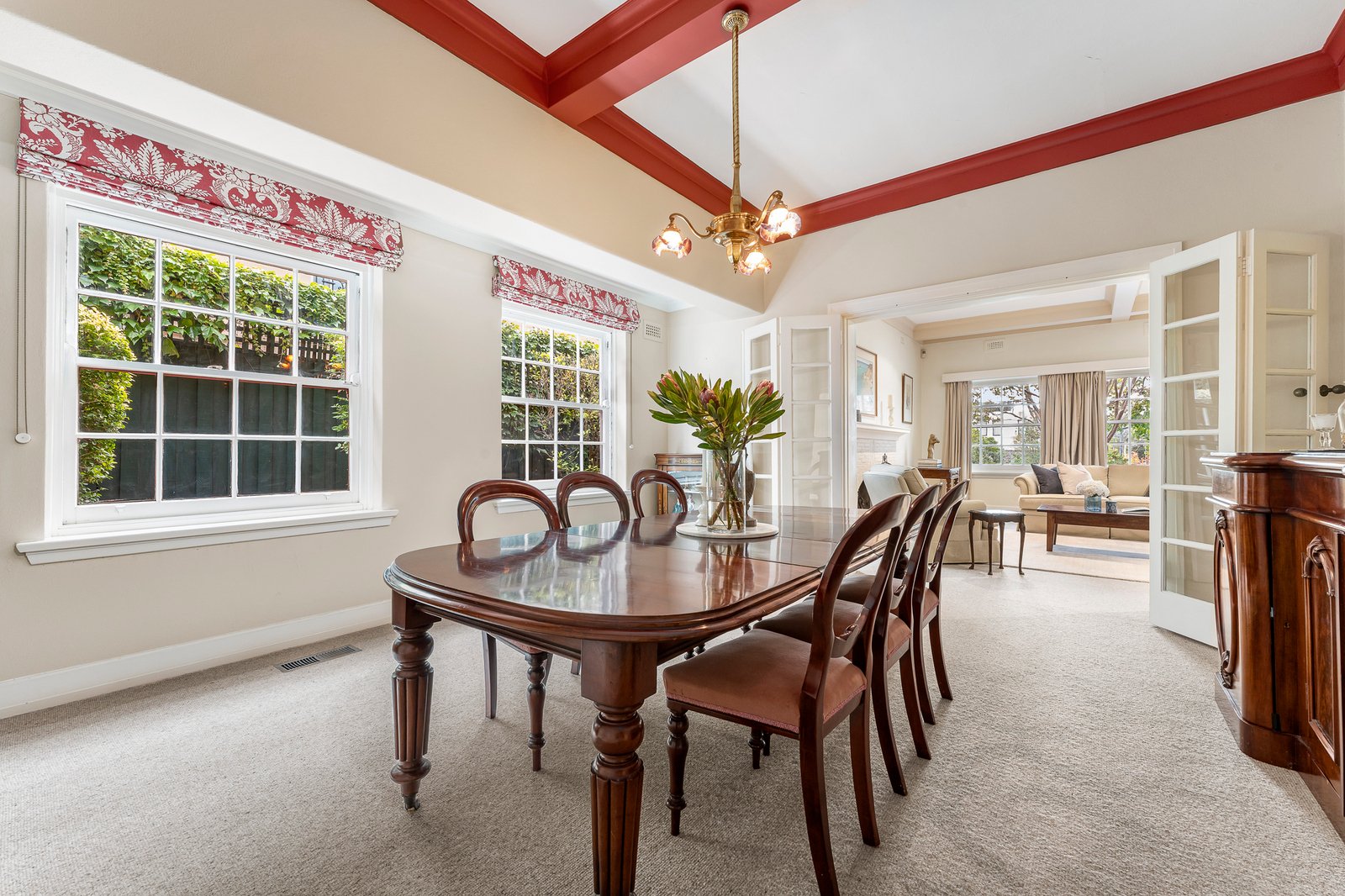 Inside, original details such as leadlight windows, coffered ceilings, elegant fireplaces, and lofty proportions speak to an era of meticulous craftsmanship. A secure double-door entry leads to a study or guest bedroom, then to a generous and inviting formal lounge bathed in northern light. Adjacent, an enchanting sunroom wrapped in glazing provides a peaceful retreat, with terrace access to the front garden and pool. Concertina glass doors open to a refined formal dining room, with room to host with ease. Throughout the home, every space has been designed to open for connection or close off for solitude, adapting effortlessly to family life.