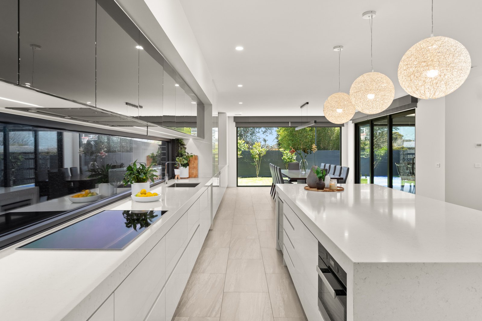 At the heart of the home, a sleek stone kitchen is appointed with Miele appliances, a butler’s pantry and adjoining laundry, while an outdoor kitchen with a plumbed Beefeater BBQ enhances the home’s entertaining appeal.