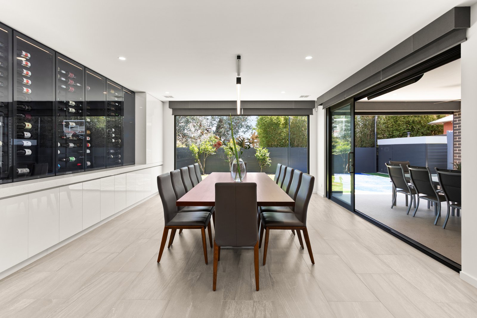 A grand entry foyer introduces expansive open-plan living and dining, where soaring ceilings and extensive glazing capture abundant north-west light. Stacker doors connect seamlessly to a superb outdoor domain, complete with a covered alfresco, pool, spa, infrared sauna and basketball half court—creating a true all-seasons entertaining environment.