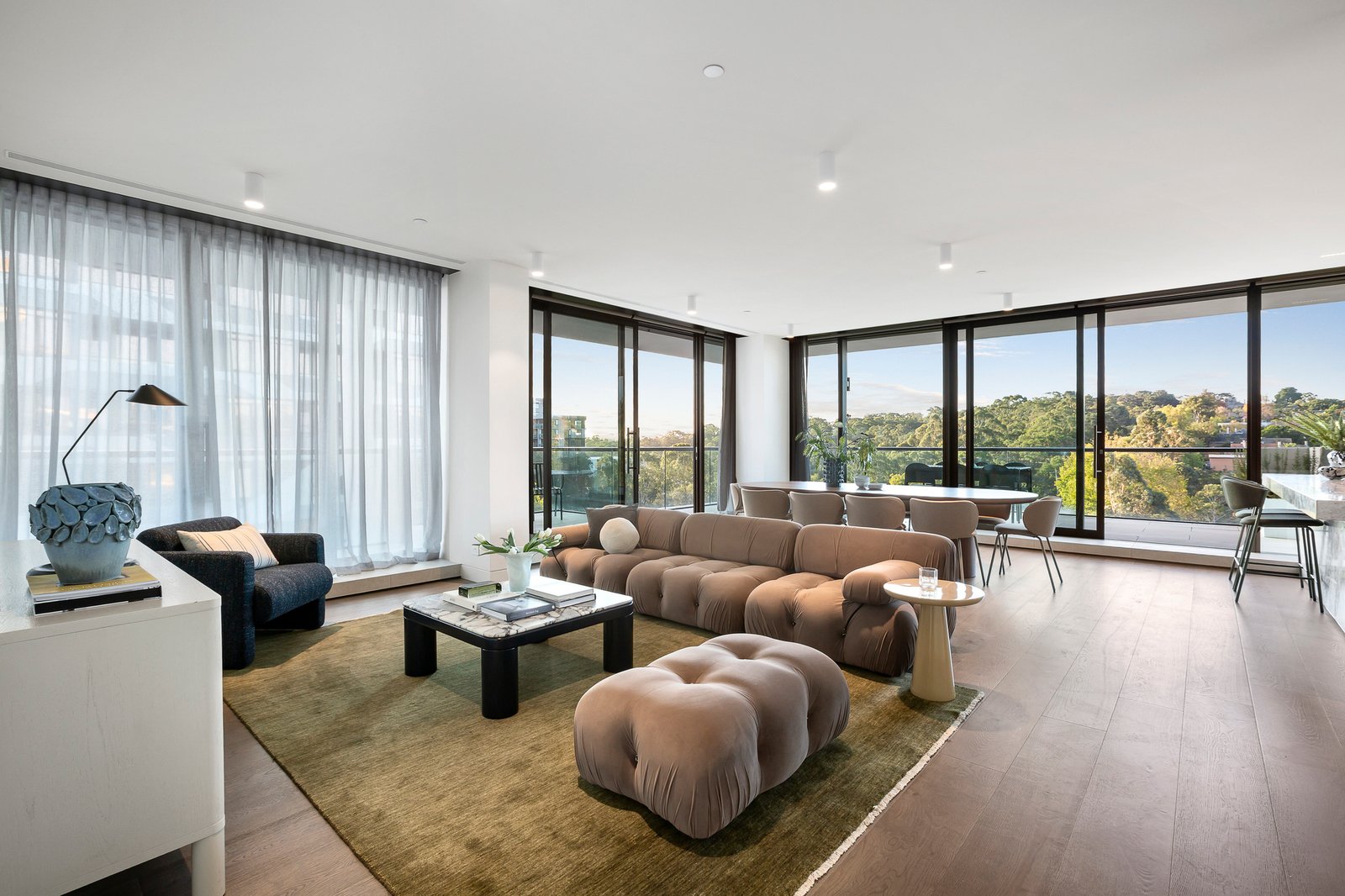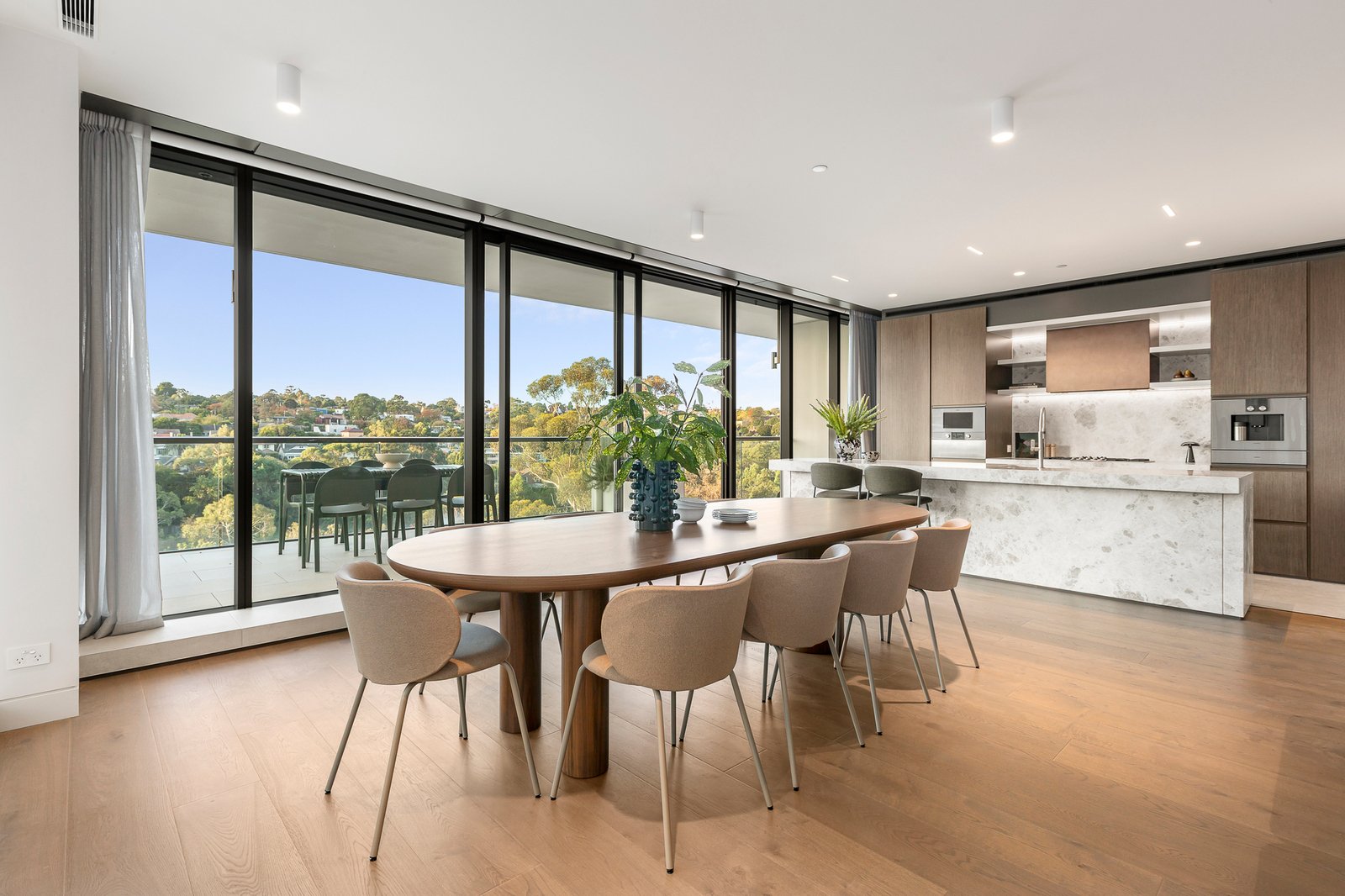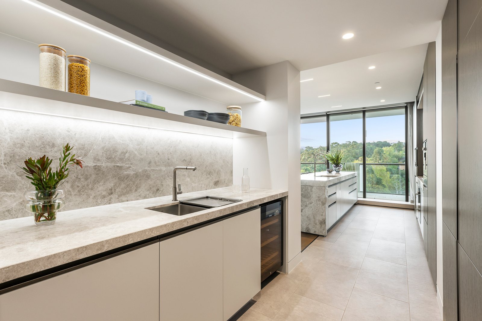 The exceptionally generous entrance foyer featuring high ceiling and rich oak floors creates a sense of occasion as it flows through to an elegant sitting room opening to a north-facing balcony. Breathtaking in scale and bathed in northwestern light, the open plan living and dining space extends out to both north and west facing undercover terraces commanding utterly captivating leafy river views. It’s a serene setting for al fresco dining and entertaining. Blending design and functionality, the premium kitchen is a culinary work of art featuring Gaggenau appliances, integrated Liebherr fridge/freezer, Vintec bar fridge, lavish stone benches and a butler’s pantry.