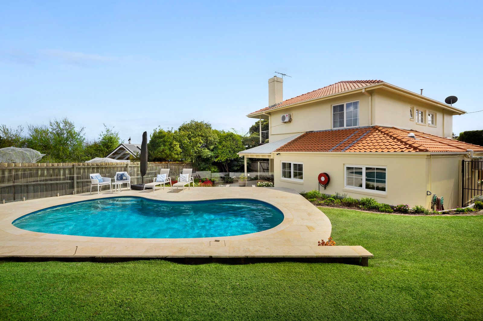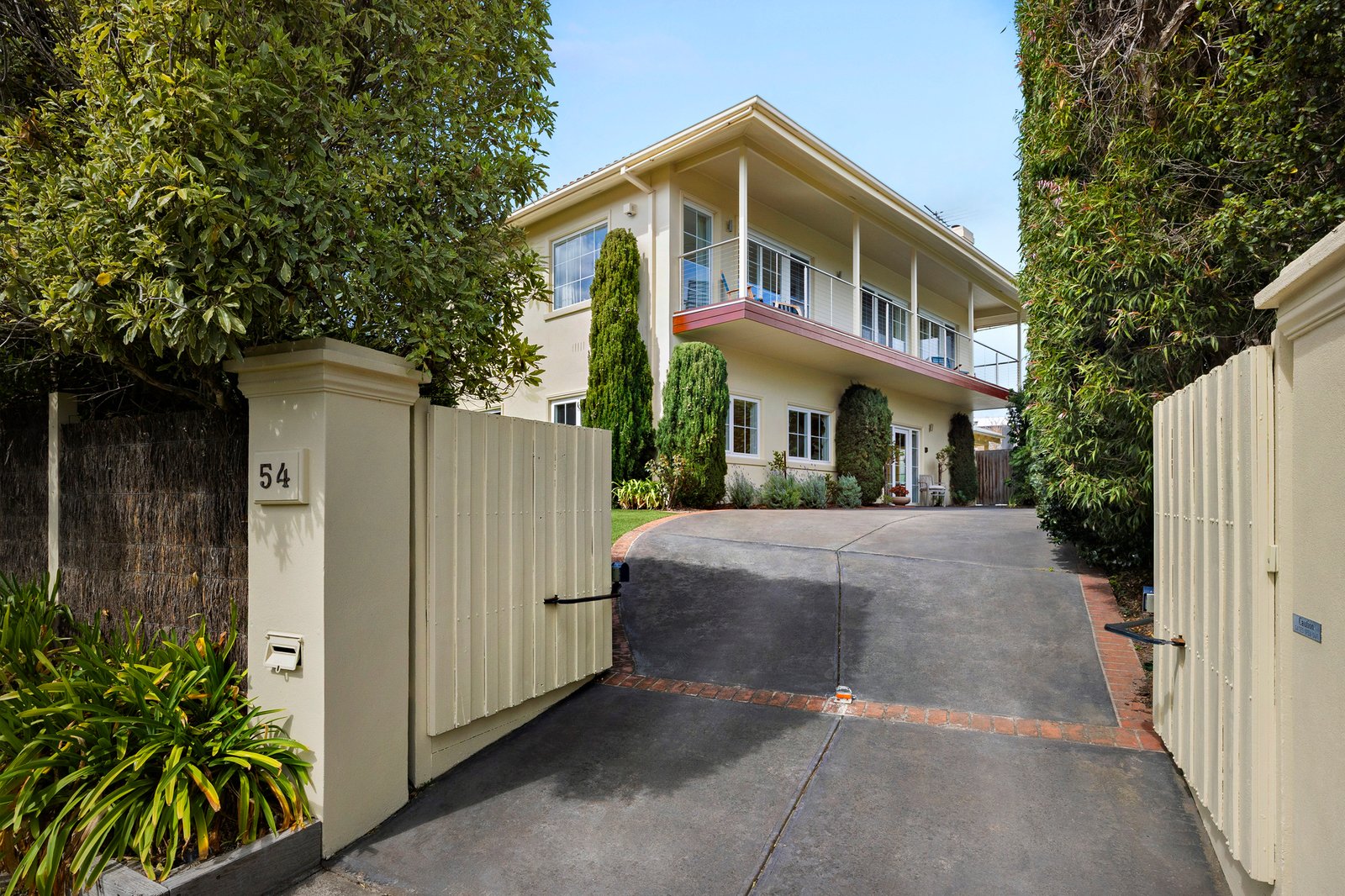 Privately set behind high fencing and hedging on a 863sqm* corner block with dual driveway access, automatic gates open to reveal a delightful and secluded front garden with verdantly hedged borders and a flat, mod-grass lawn area, currently used for family badminton games. Impressive in size and scale, the rendered-brick double storey home’s elevated coastal setting is celebrated with a full length sea facing balcony oriented for enjoying everchanging Bay vistas and evening sunsets.