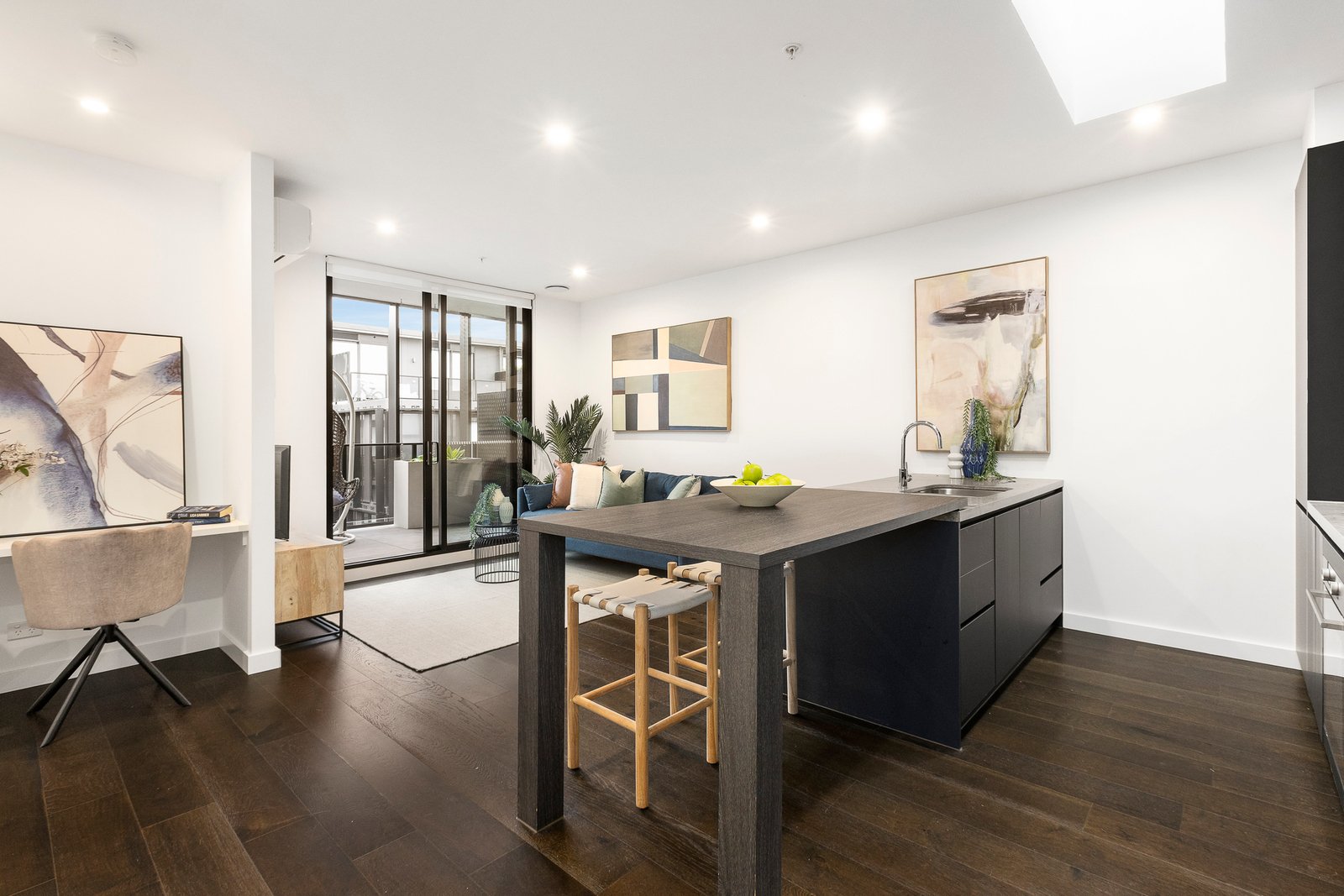 Stepping inside, the home makes an immediate impression with its striking dark colour palette, modern tones, and engineered timber veneer flooring that flows seamlessly through the open-plan living and dining domain. The heart of the home is a spectacular kitchen, uniquely illuminated by a skylight and anchored by a large island breakfast bar finished with stone benchtops and a cantilevered breakfast bar. It is comprehensively appointed for the home chef with premium appliances, including an Asko stove and gas oven, alongside an integrated Fisher & Paykel dishwasher. This stylish culinary space overlooks the living area, which extends out to a private balcony for relaxed outdoor enjoyment.