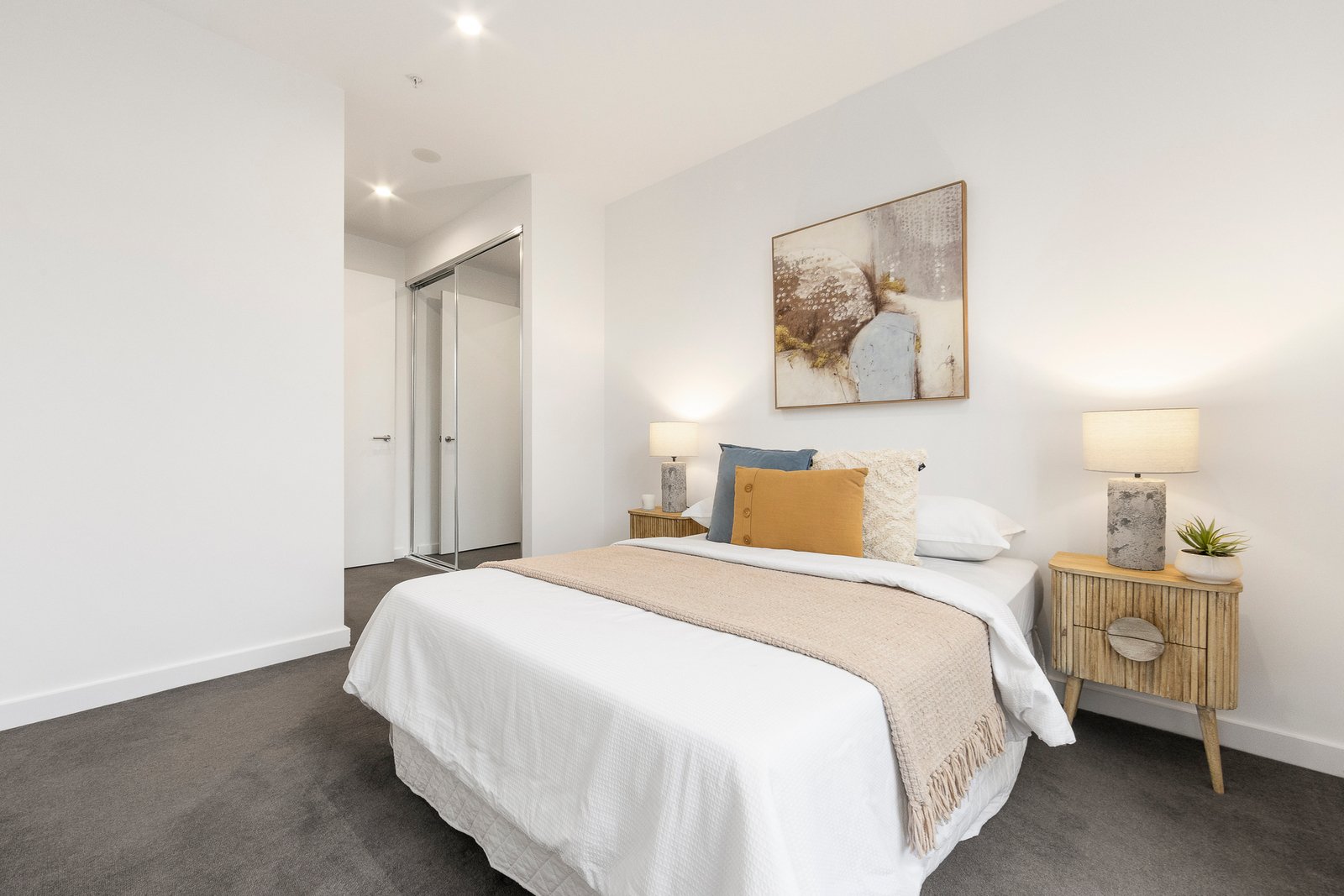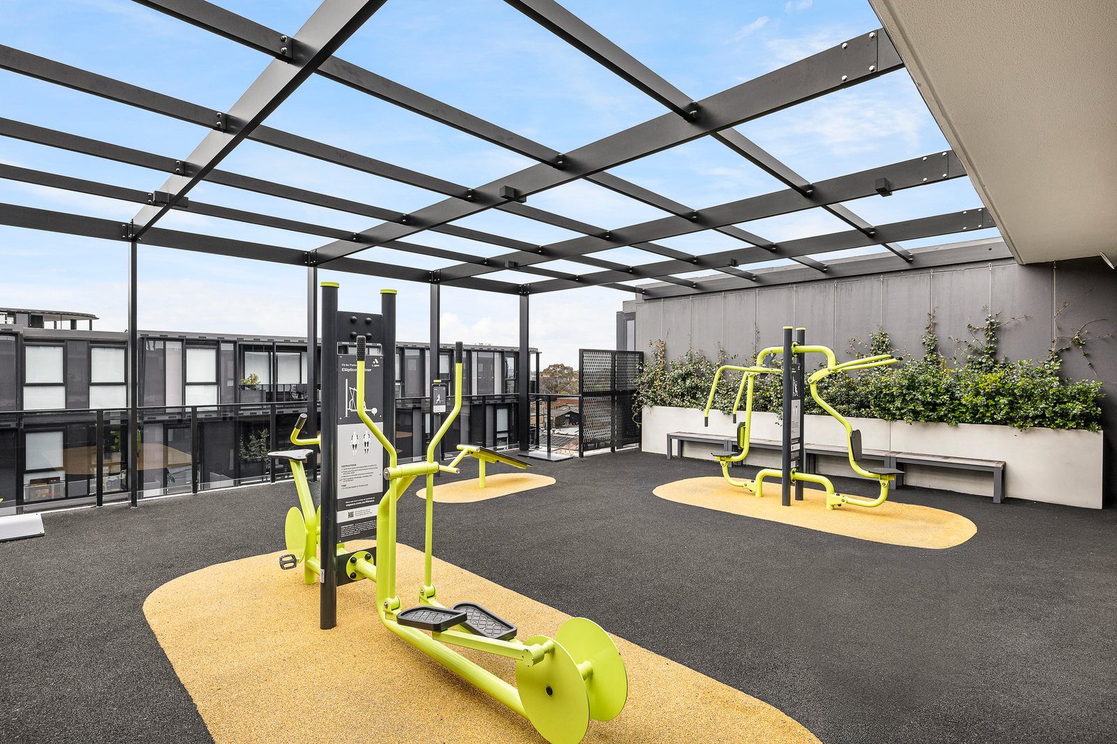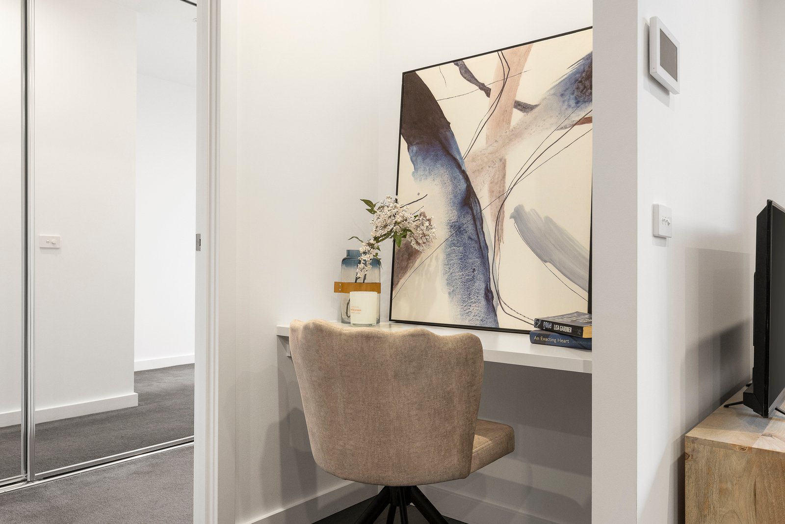 The carpeted bedroom provides a quiet and comfortable sanctuary, complete with mirrored built-in robes. The home is serviced by a sleek, moody bathroom showcasing a floor-to-ceiling tiled shower and a stone-topped vanity with mirrored cabinetry. Adding to the home's exceptional practicality is a dedicated built-in study nook, a discreet Euro laundry, split-system air conditioning, video intercom security, a single secure car park on title, and a storage cage. Residents enjoy exclusive access to resort-style communal facilities including a pool, indoor gym, and a communal dining room, while this specific apartment uniquely boasts a shared outdoor gym courtyard located right at its front door.