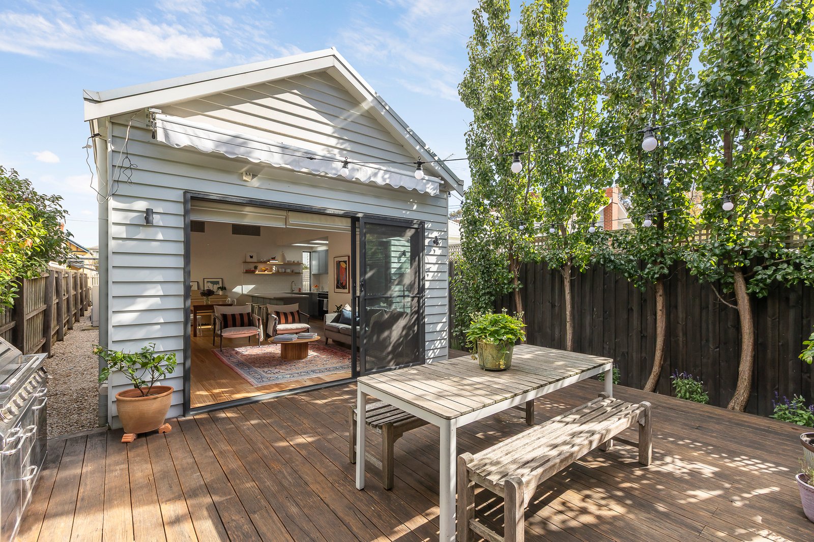 Soaring vaulted ceilings amplify the sense of space in the expansive open plan living and dining room anchored by a sleek gourmet kitchen appointed with a 90cm oven and stone benches. Full width stacking glass sliders reveal a glorious private courtyard decked with wide Victorian Ash boards and surrounded by tall Manchurian pear trees. Beneath a remote sun-awning, it’s an enticing space for long summer lunches. At the rear, a gate accesses the wide right of way.