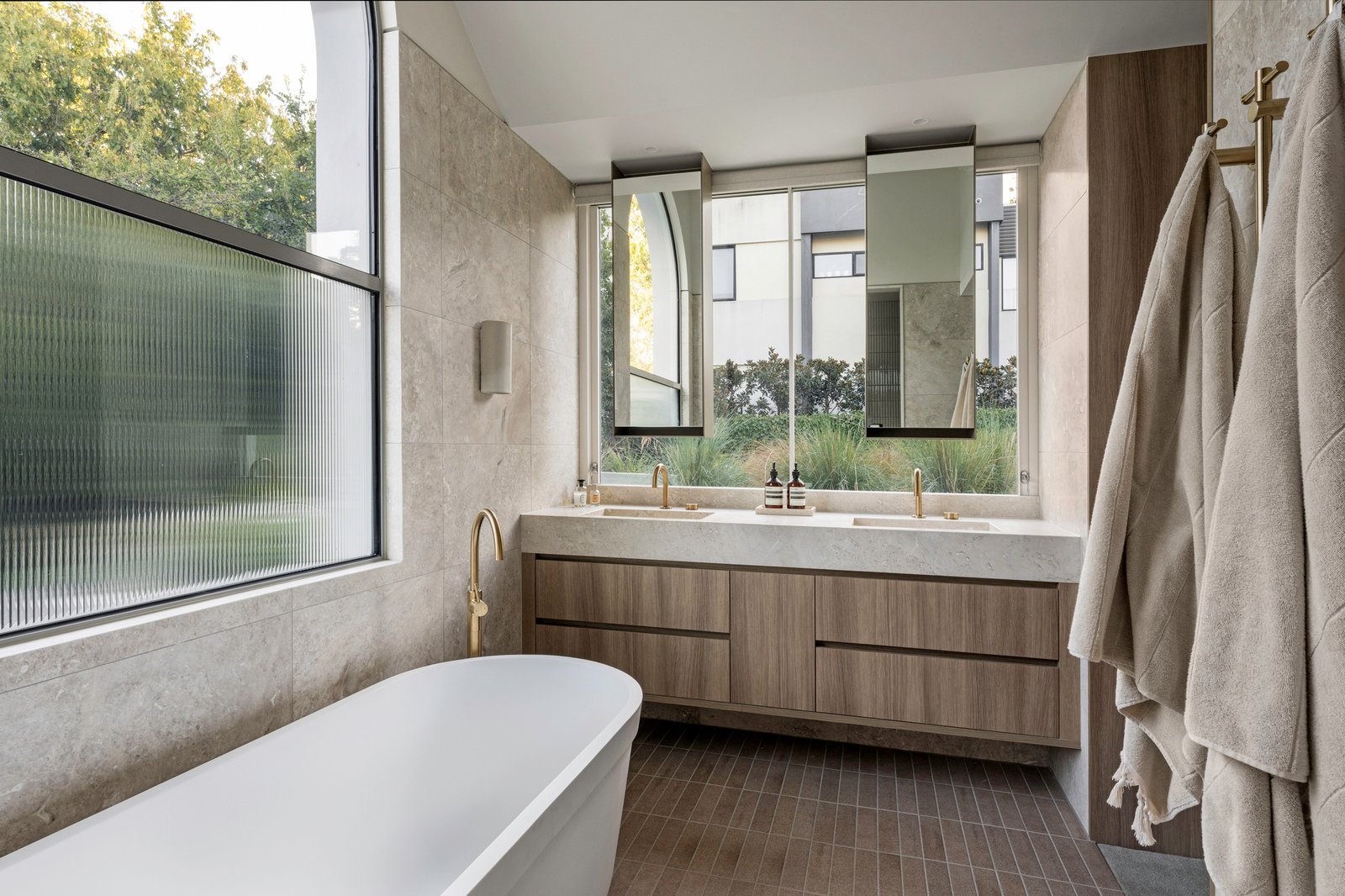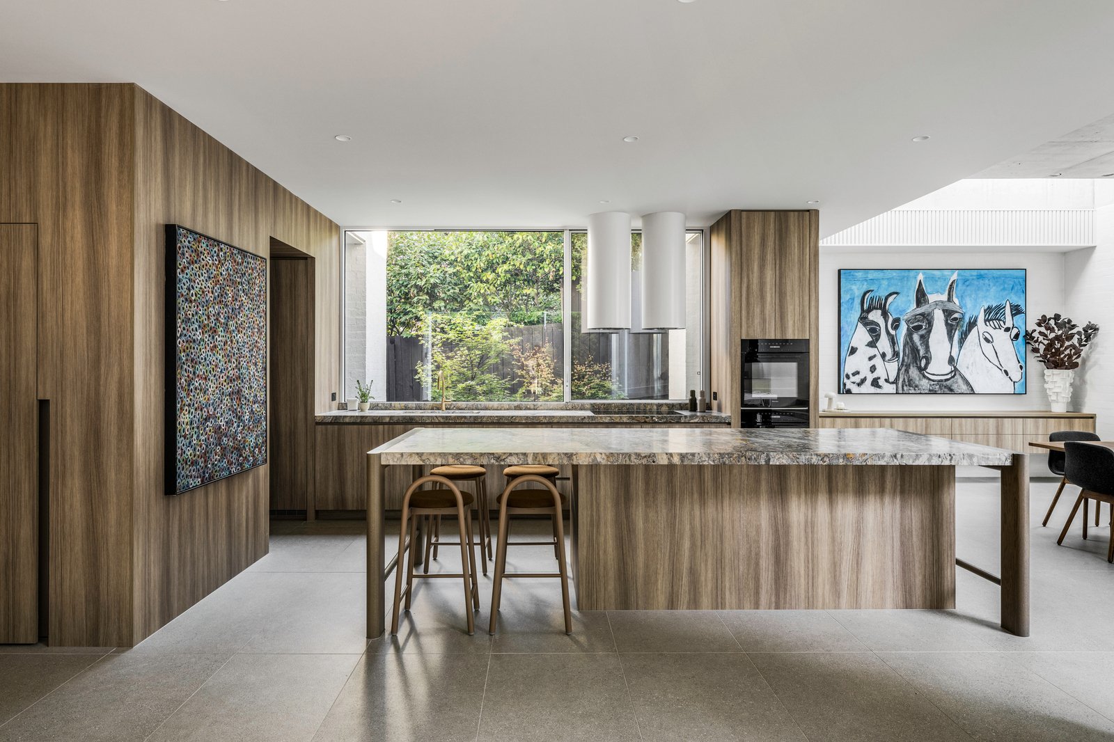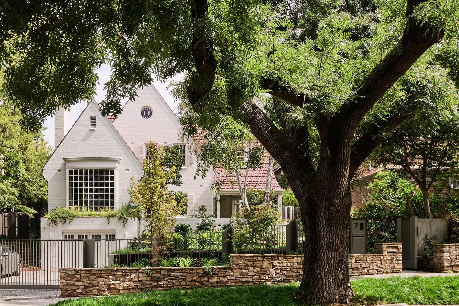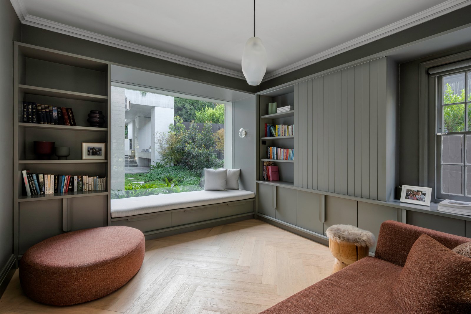 Originally conceived in the 1930s by renowned Melbourne architect Charles N Hollingsworth and now a recently completed innovative renovation and architectural vision by David Neil and the team at Neil Architecture, this Stonington Estate address delivers a compelling composition of heritage and modern contemporary design, set within established gardens by Eckersley Landscape Architecture. Respect for its origins sits alongside a highly considered material direction, where feature lighting by Ross Gardam and Anna Charlesworth, Faucet Strommen tapware and stone and marble selections from Artedomus accentuate the finish. A palette of tobaccos, mustards and deep olive tones carries throughout, giving each space continuity, while herringbone oak floors guide movement through the interiors, with steel-framed glazing and softened architectural curves referencing the past, keeping the dialogue between old and new.