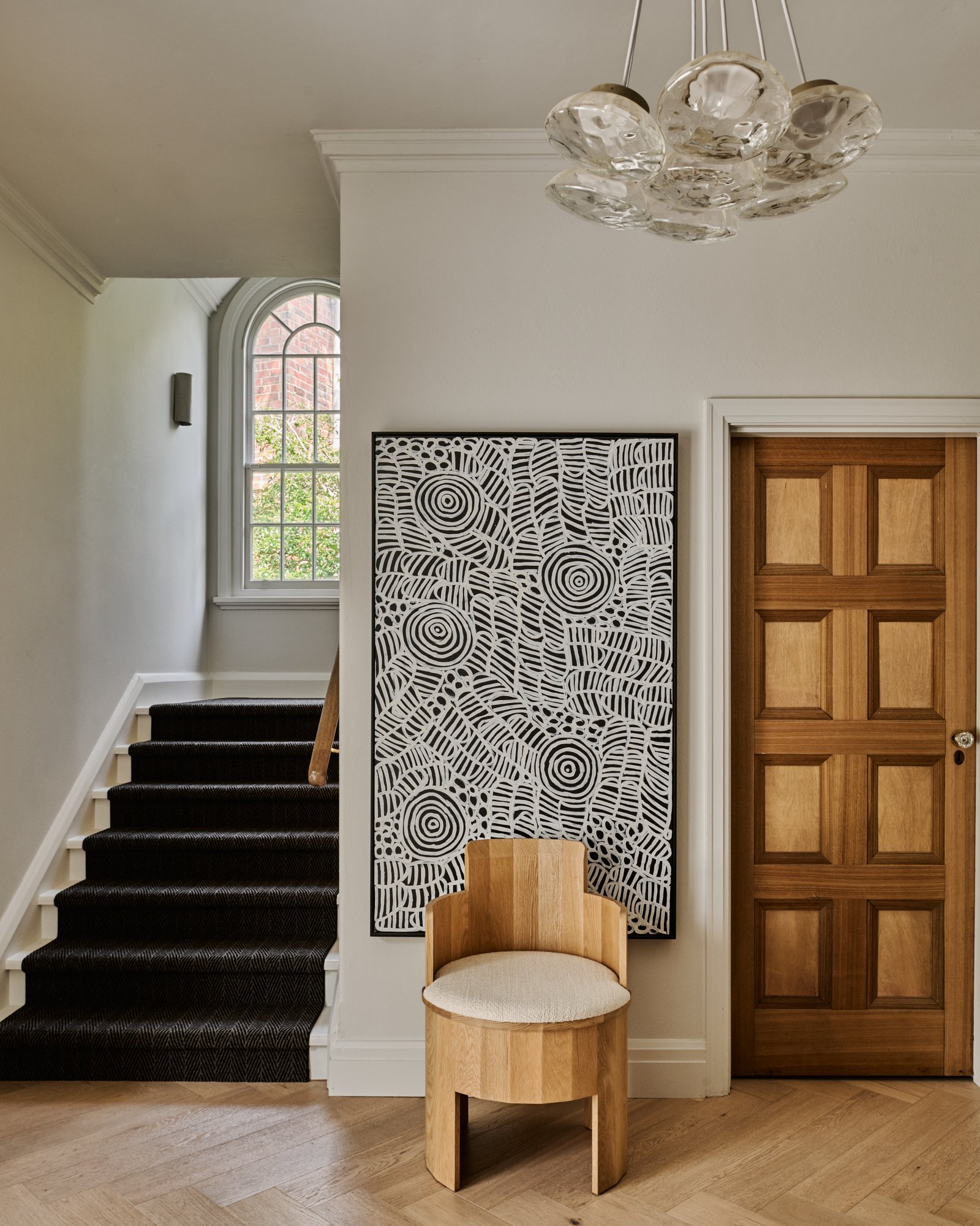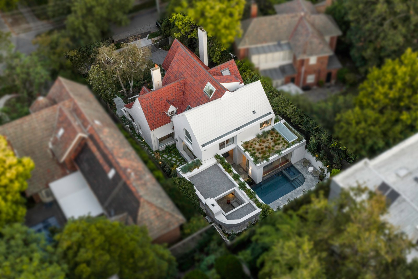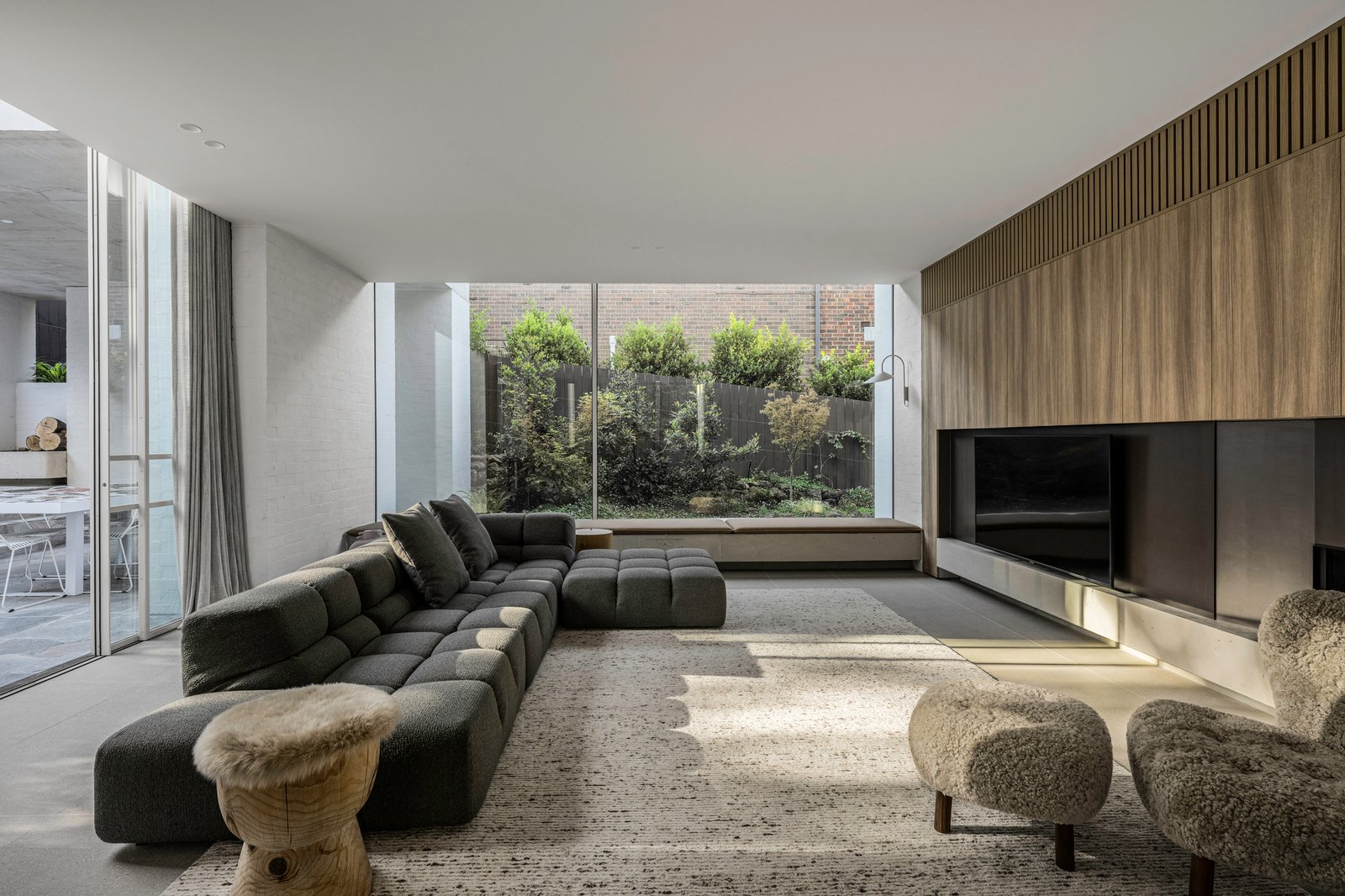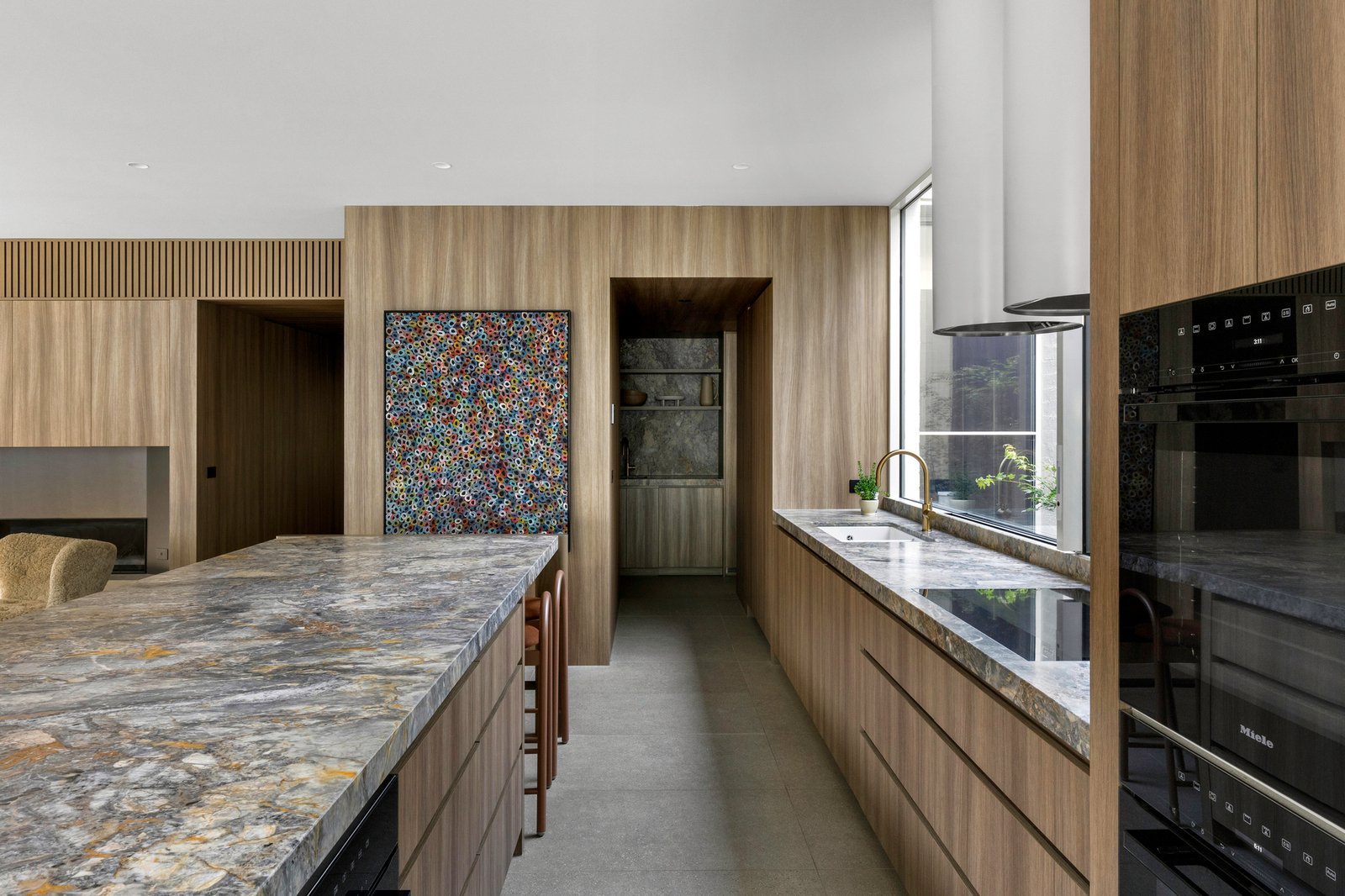 Originally conceived in the 1930s by renowned Melbourne architect Charles N Hollingsworth and now a recently completed innovative renovation and architectural vision by David Neil and the team at Neil Architecture, this Stonington Estate address delivers a compelling composition of heritage and modern contemporary design, set within established gardens by Eckersley Landscape Architecture. Respect for its origins sits alongside a highly considered material direction, where feature lighting by Ross Gardam and Anna Charlesworth, Faucet Strommen tapware and stone and marble selections from Artedomus accentuate the finish. A palette of tobaccos, mustards and deep olive tones carries throughout, giving each space continuity, while herringbone oak floors guide movement through the interiors, with steel-framed glazing and softened architectural curves referencing the past, keeping the dialogue between old and new.
