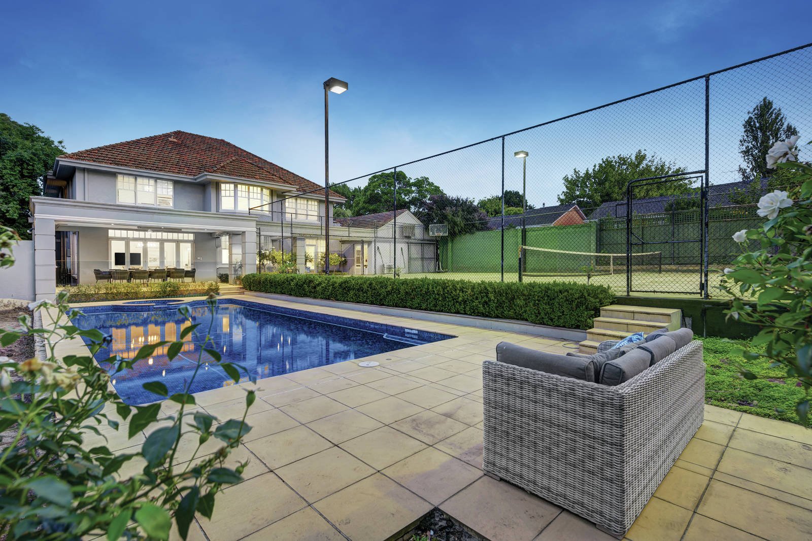 Encompassing all that is aspirational in a forever family home, this magnificent 1930's residence showcases the beauty and character of its era whilst providing all the space, privacy and luxury so desired by today's fastidious family. Perfectly poised on a prized tree-lined avenue, the majesty of this home with its resort-style grounds, floodlit tennis court and salt-water pool is perfectly matched by its exclusive location walking distance to Melbourne's finest schools, parklands, Cotham and Glenferrie Rd trams and Kew and Hawthorn shopping. Discover a duo of grandly proportioned and beautifully styled rooms perfect for refined occasion, an executive study/library designed and appointed for multi-person home-office use, a luxuriously large entertainer's kitchen (with 2 AEG ovens) and expansive family areas with sensational views across a heated dining terrace to the stunning pool and court surrounds. A huge rumpus/games room is an exciting accompaniment to the ground level whilst 5 king-sized bedrooms (main with ensuite and WIRs) plus grand-scale spa-bathroom are privately positioned upstairs. A 3rd bathroom, spacious caterer's room/laundry, al fresco kitchen, new ducted heating and cooling, security, superb feature lighting, intercom entrance and double auto garage offer a consummate lifestyle in an elite pocket.