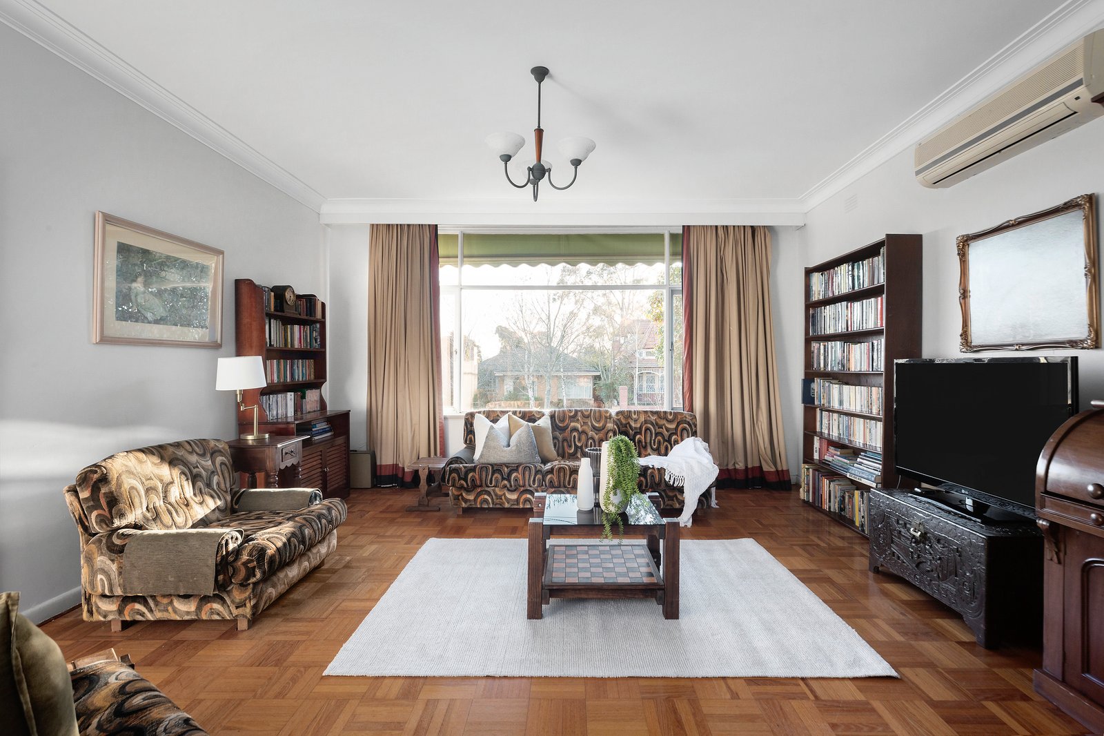 Beyond a terrazzo-style front verandah, the home opens to reveal a grand entrance hall resplendent with herringbone style flooring, rich timber cabinetry from the 50s and easy connection to a staggeringly large lounge / dining room that benefits from its own terrace. Updated with stone benchtops and a 900mm Blanco oven / cooktop, the kitchen / meals is the home’s contemporary heart, connected both to the lounge / dining room and an informal family room with parquetry flooring.